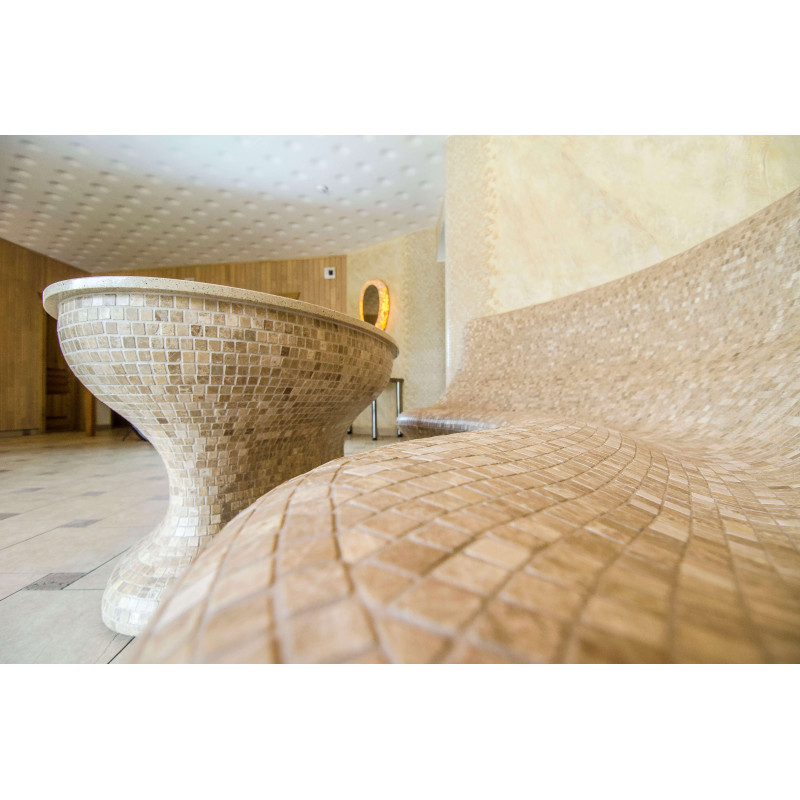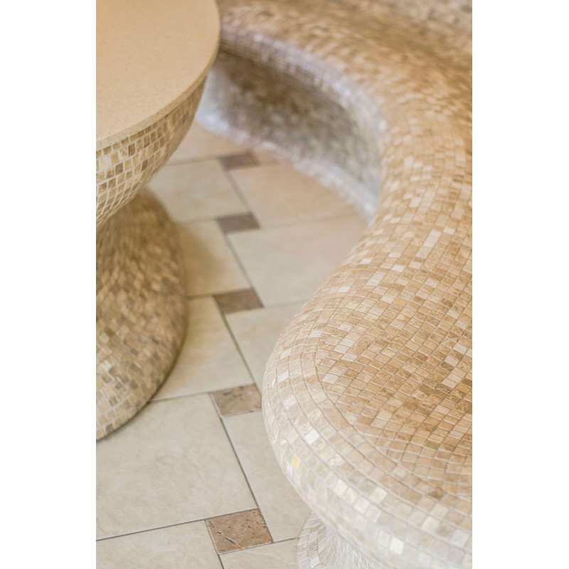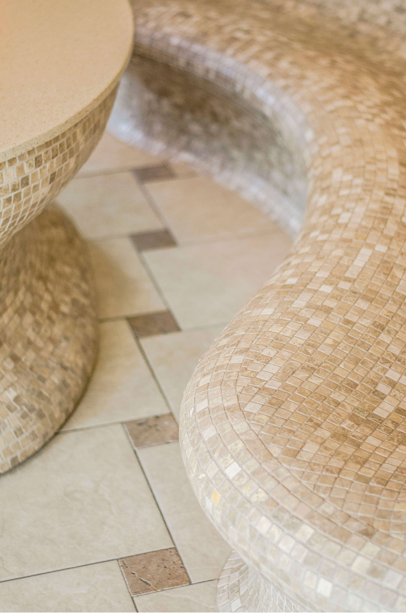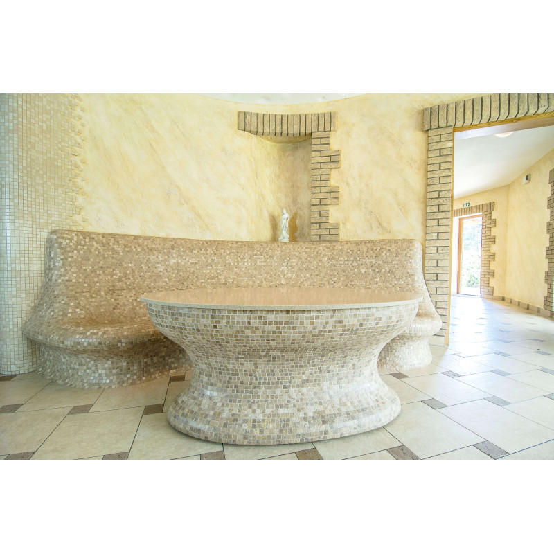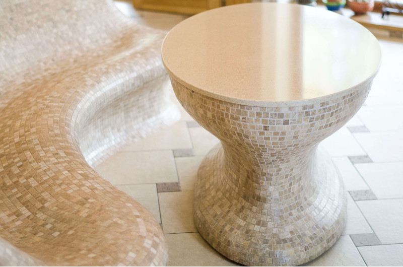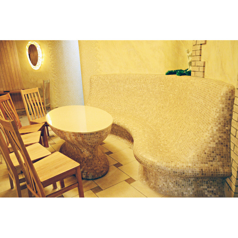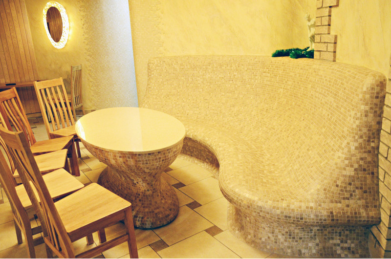 Formele de bănci și mese încălzite sunt realizate individual din polistiren extrudat special. Blat - marmură. Finisaj - plăci de mozaic. Banca este încălzită de la sistemul de încălzire.