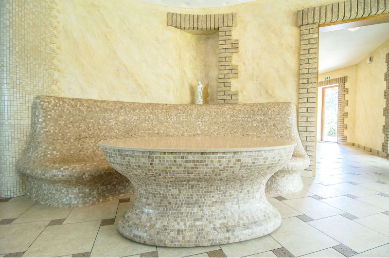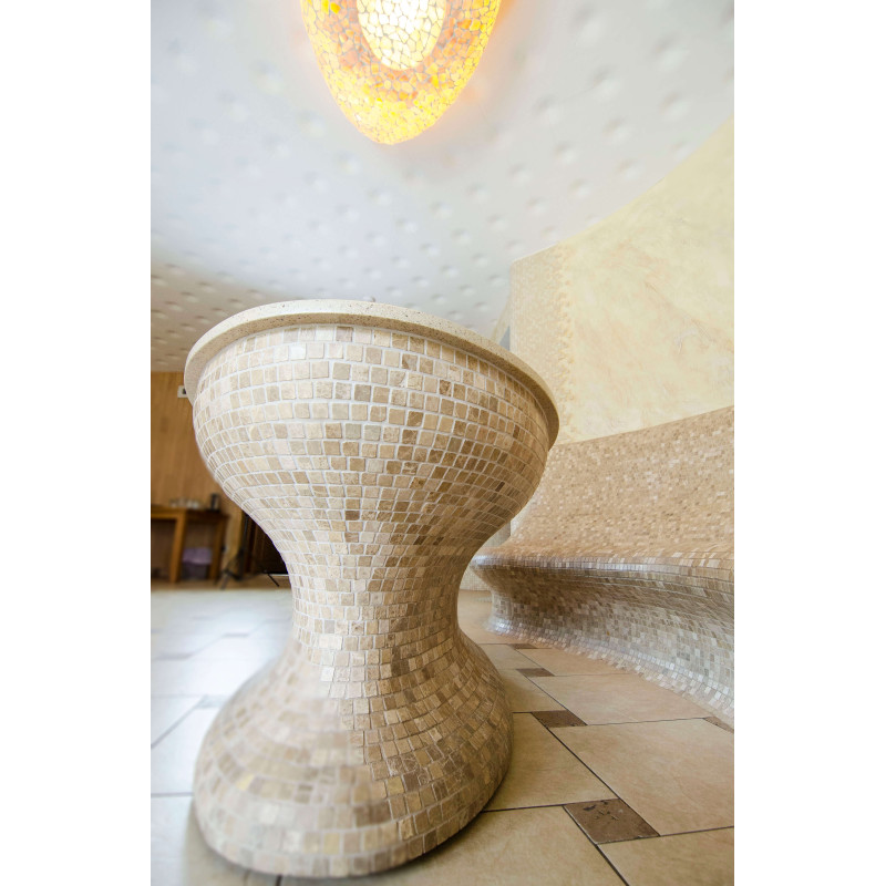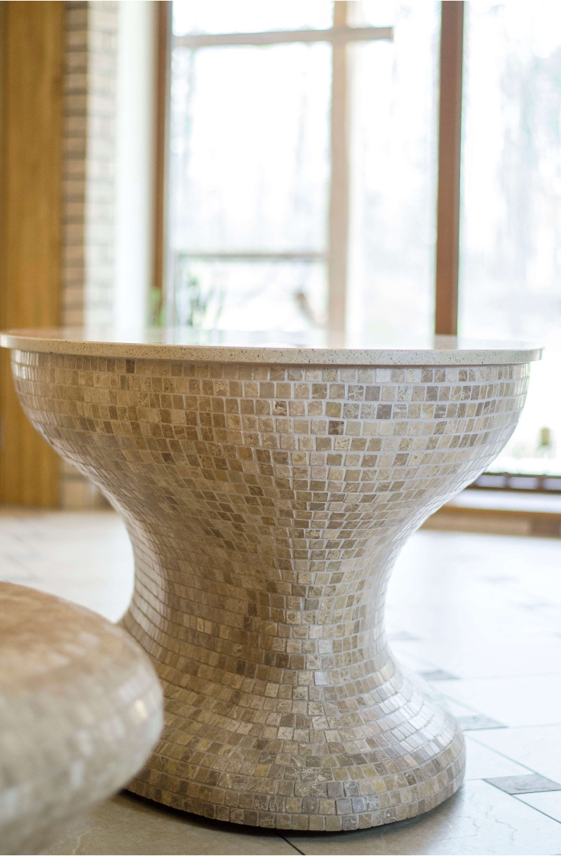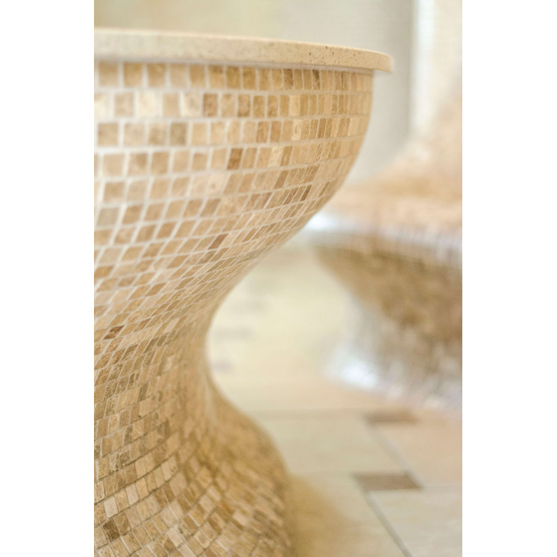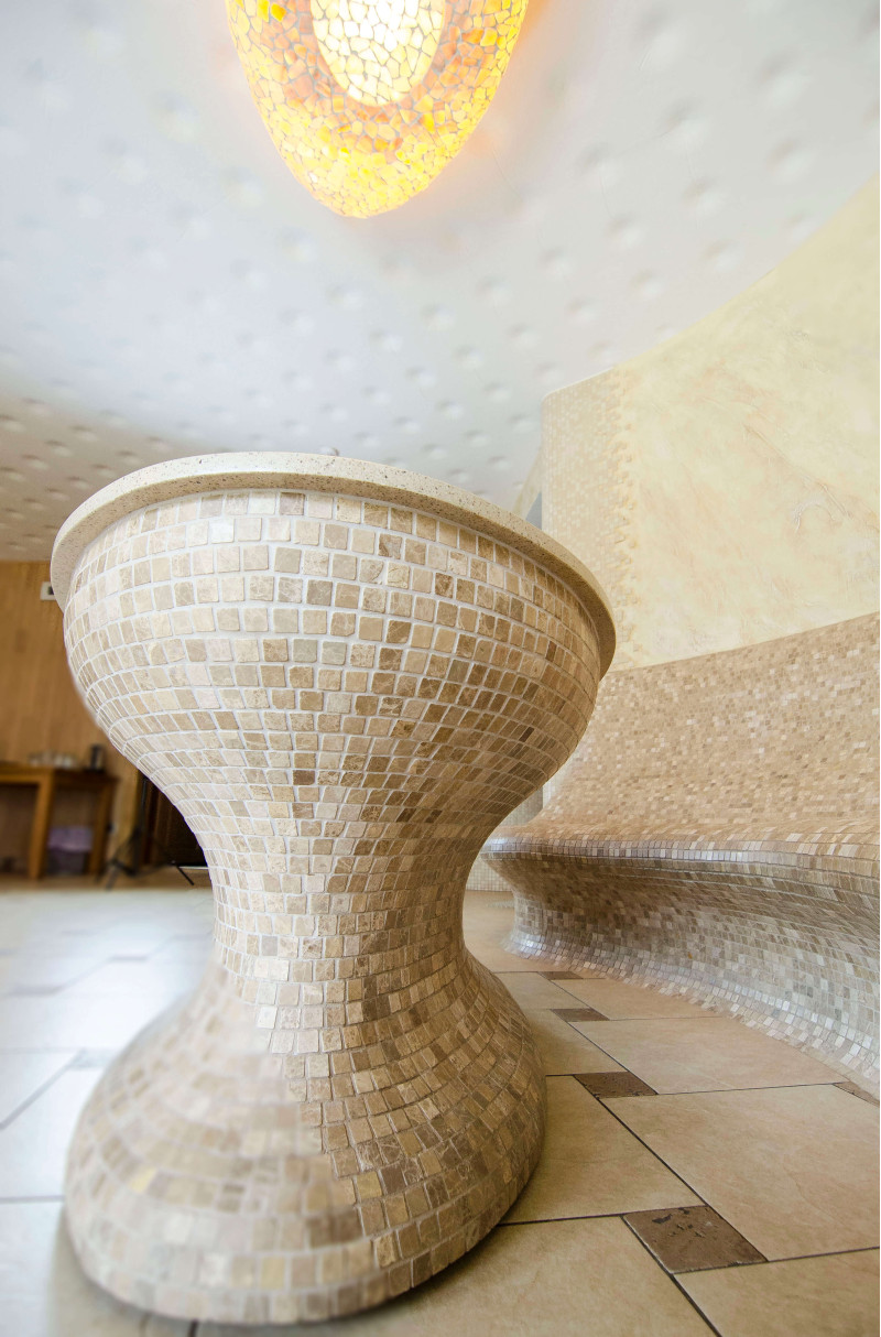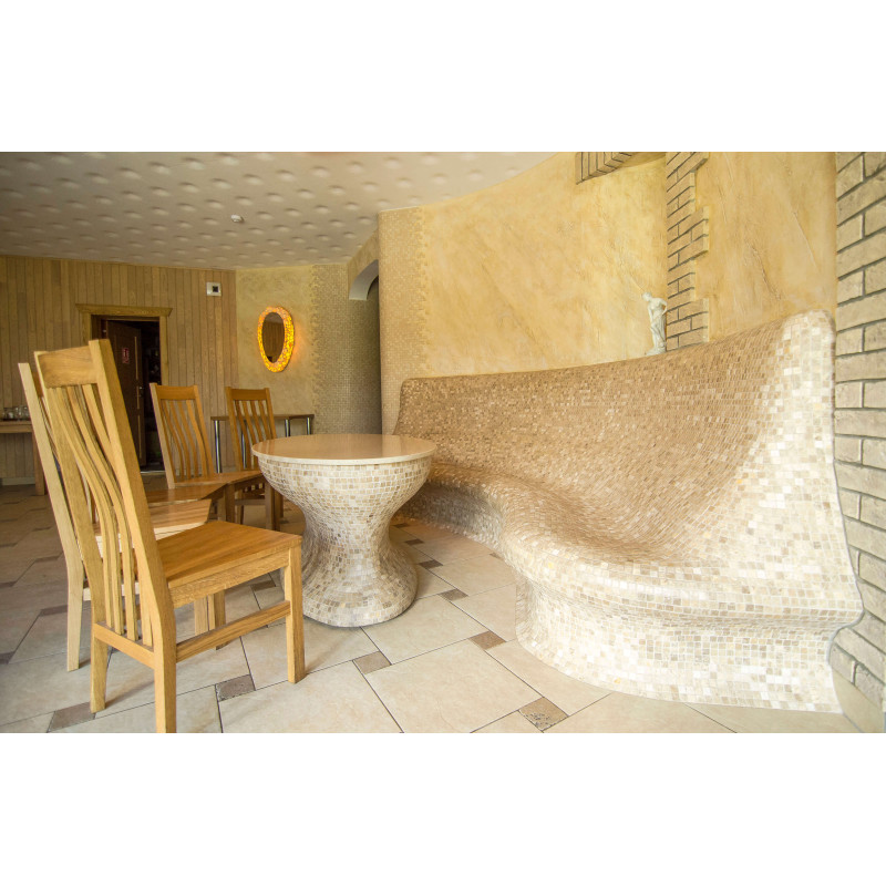 Formele de bănci și mese încălzite sunt realizate individual din polistiren extrudat special. Blat - marmură. Finisaj - plăci de mozaic. Banca este încălzită de la sistemul de încălzire.