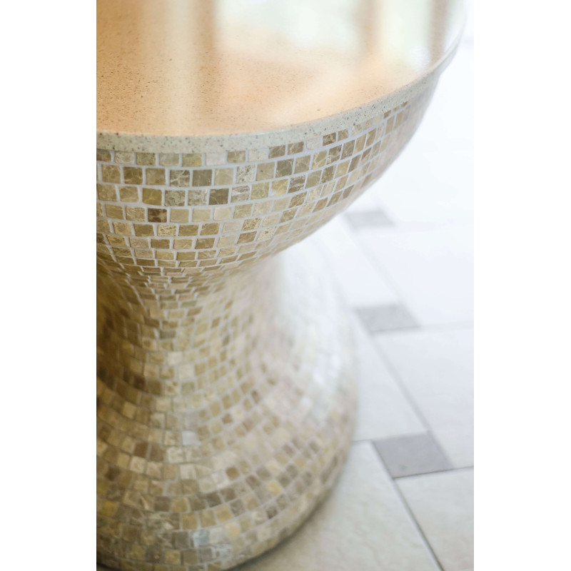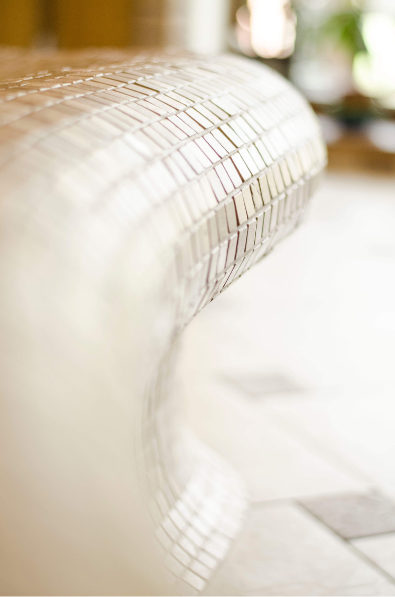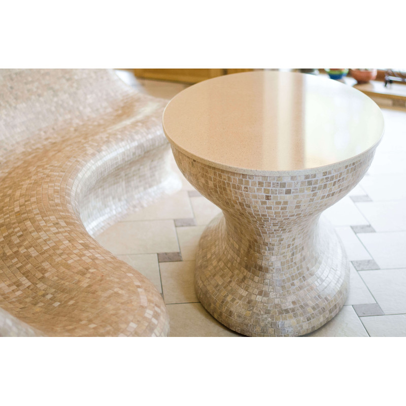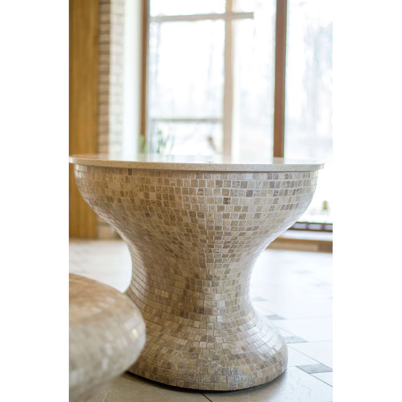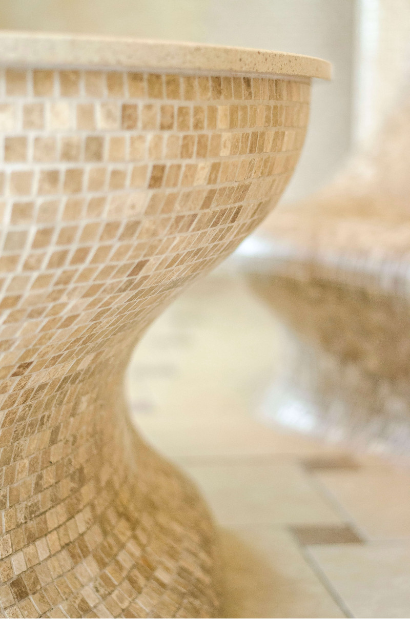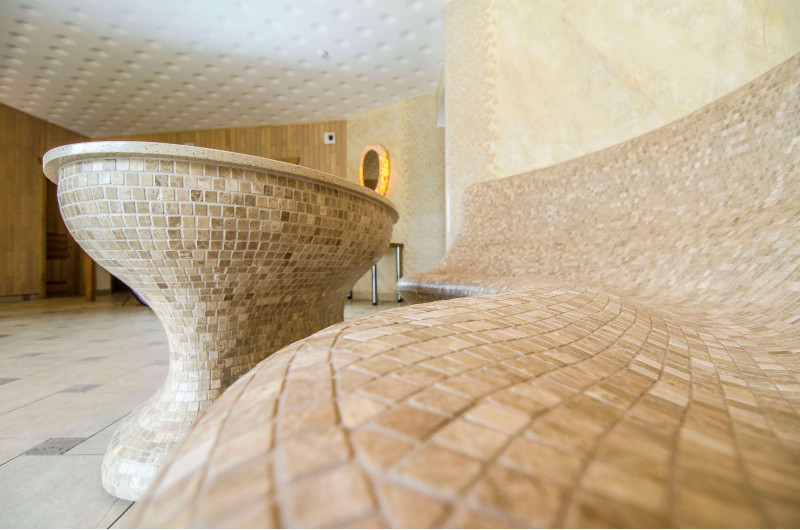 Formele de bănci și mese încălzite sunt realizate individual din polistiren extrudat special. Blat - marmură. Finisaj - plăci de mozaic. Banca este încălzită de la sistemul de încălzire.