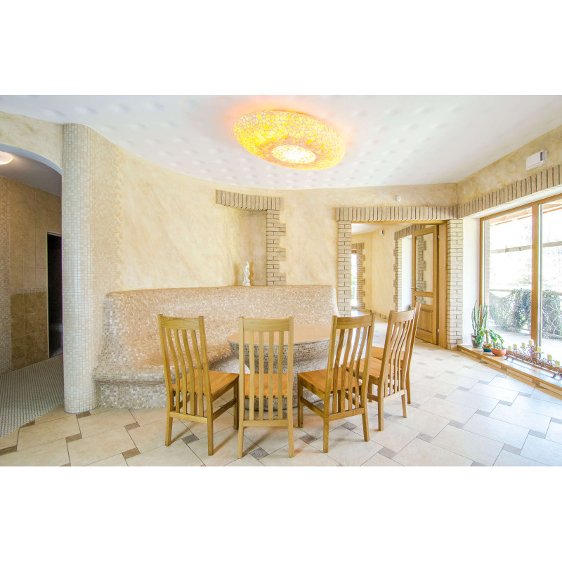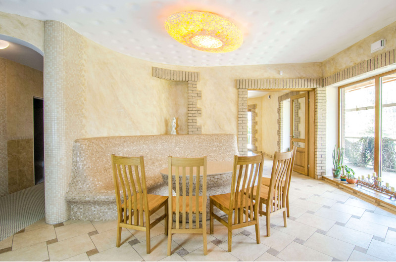 Oferă o masă și o bancă de saună luminoase și aerisite.