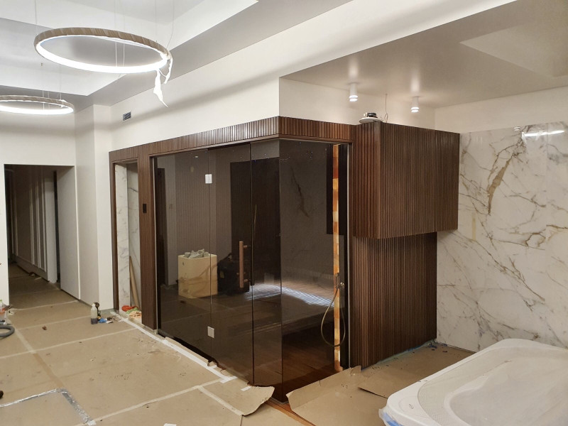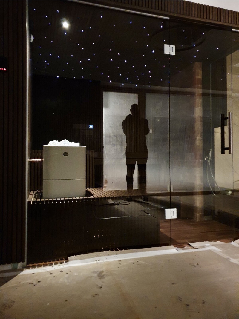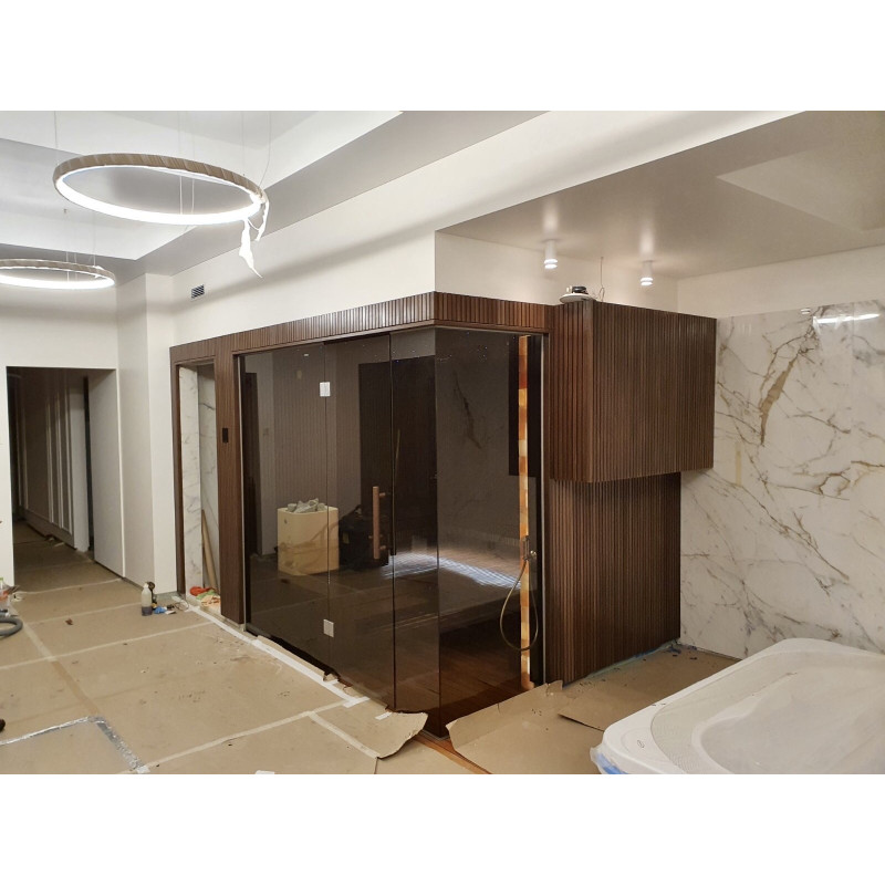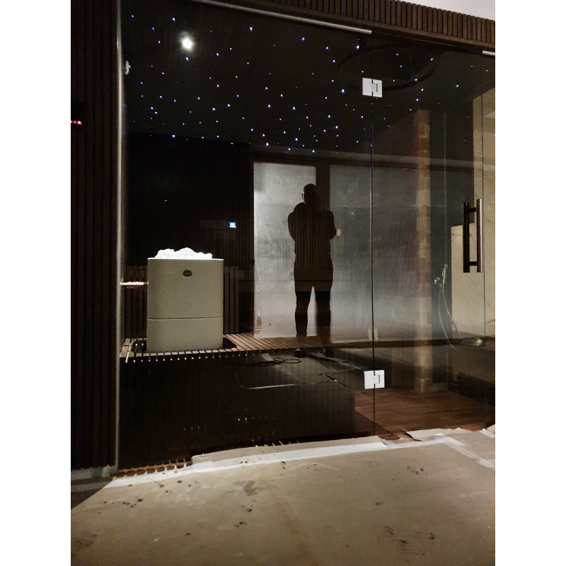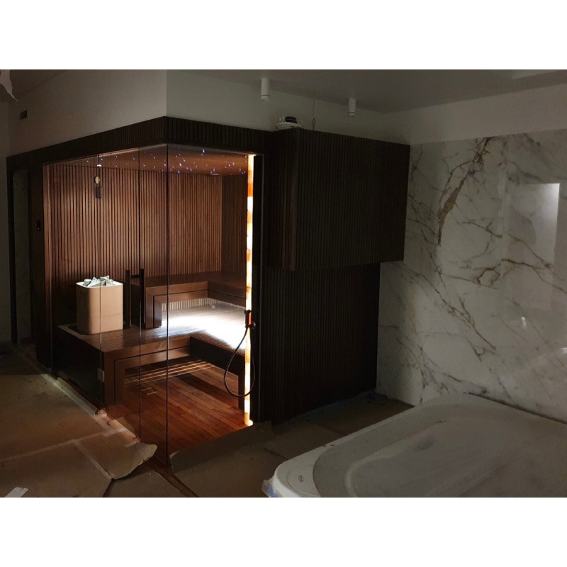 Un proiect individual de saună a fost implementat în Vilnius. Lemn de tei ales acoperit cu ceara naturala cu culoare. Încălzitor alb Tulikivi Kuura 2 cu un generator de abur separat pentru baie turcească (Harvia 4,5 kW) introdus în încălzitor. Acest sistem produce o cantitate foarte mare de umiditate secundară.