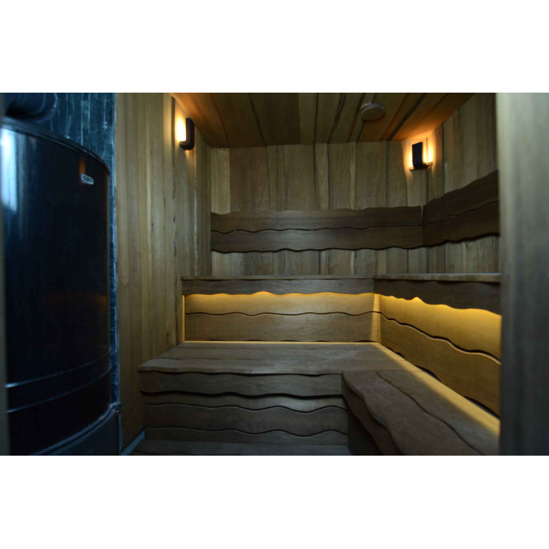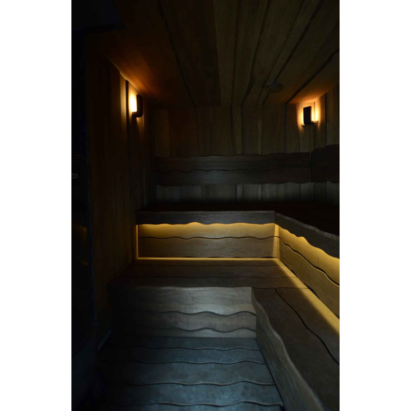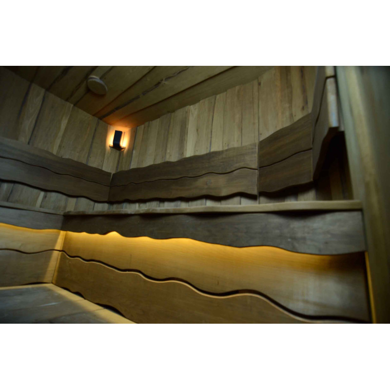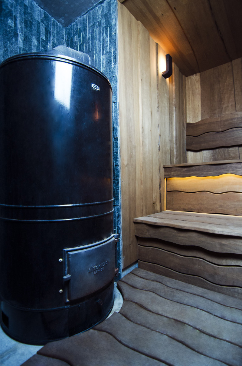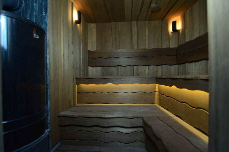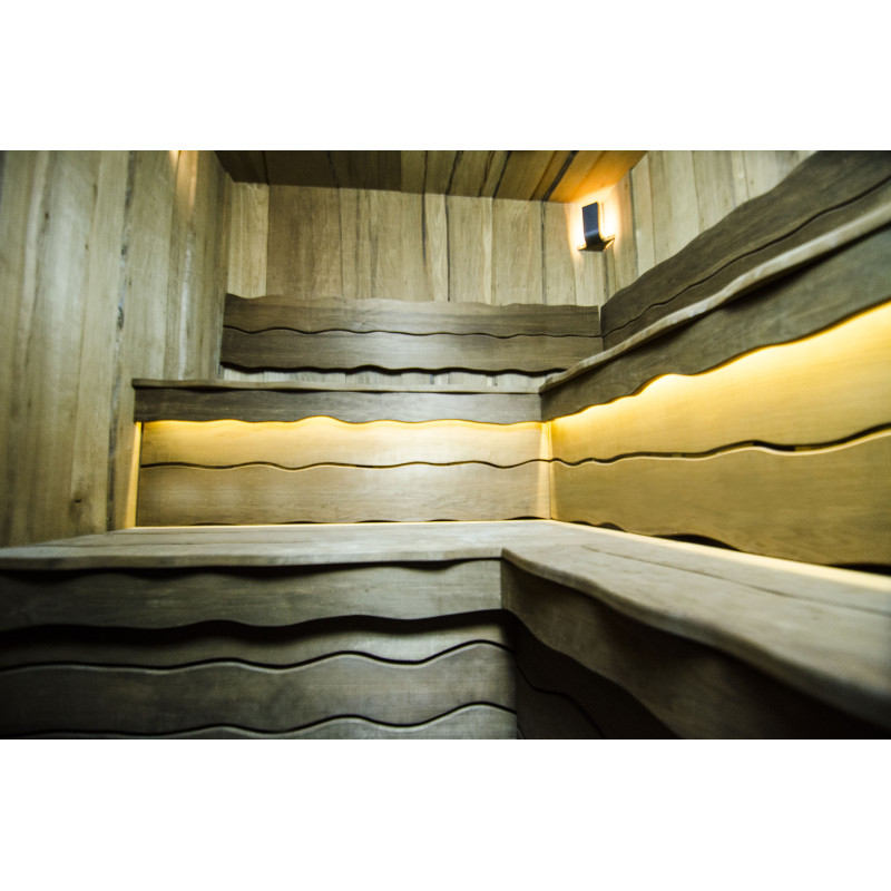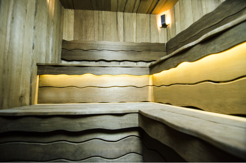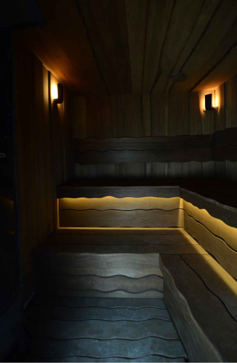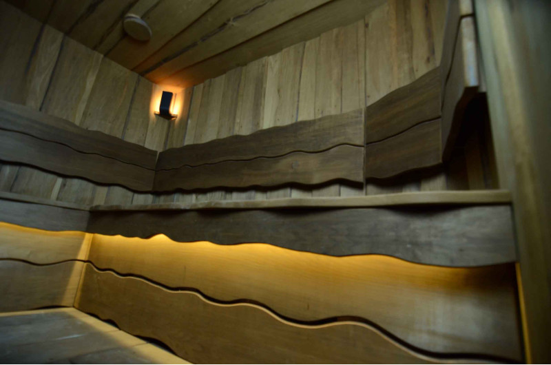 Lemnul de aspen a fost folosit pentru a decora pereții și tavanul saunei, precum și băncile și spătarele. Scânduri rindeluite cu o singură tăietură au fost alese pentru a oferi saunei confort și naturalețe.