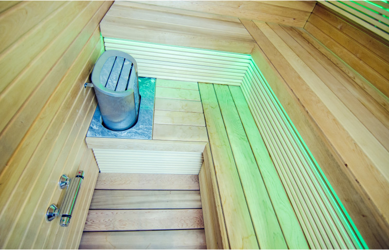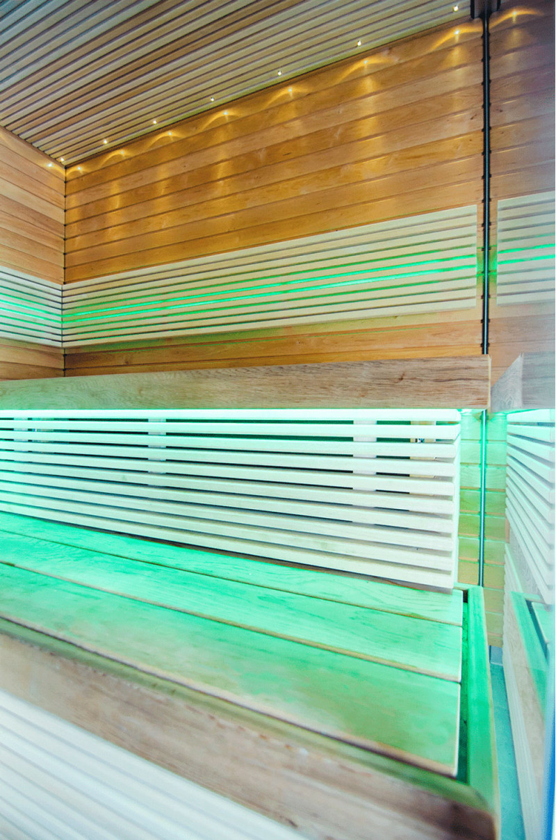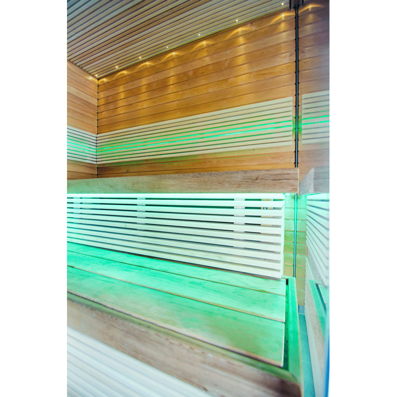 Bănci și grătare de podea - plăci de lemn de cedru late, non-standard. Cedru este un lemn excepțional de decorativ datorită texturii sale frumoase și culorii plăcute. De asemenea, sidingul de cedru este rezistent la temperaturi ridicate, absoarbe putina caldura, asa ca este placut sa stai sau sa stai intins pe astfel de banci.