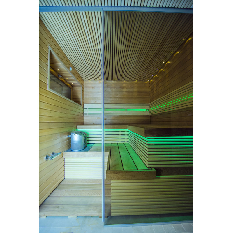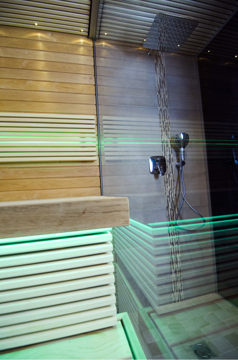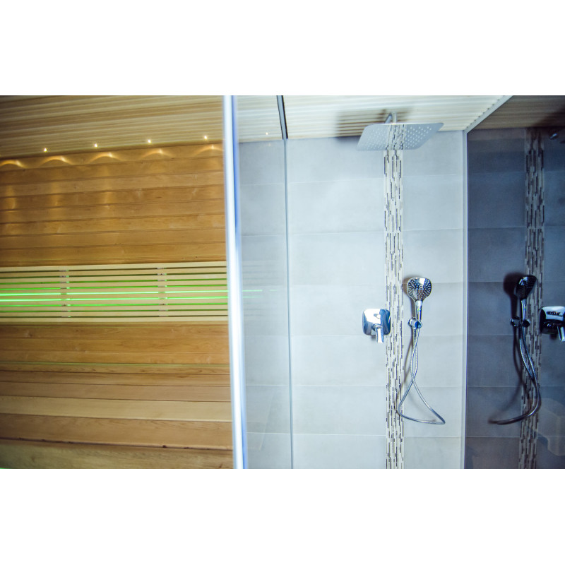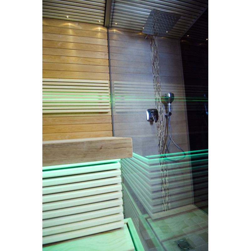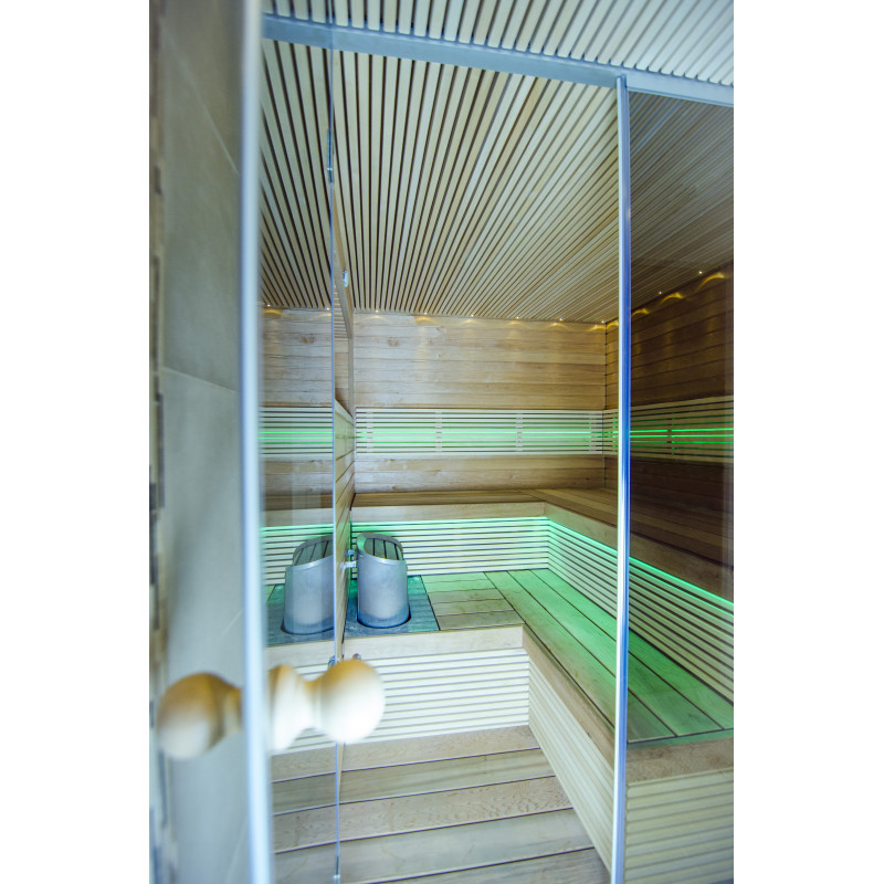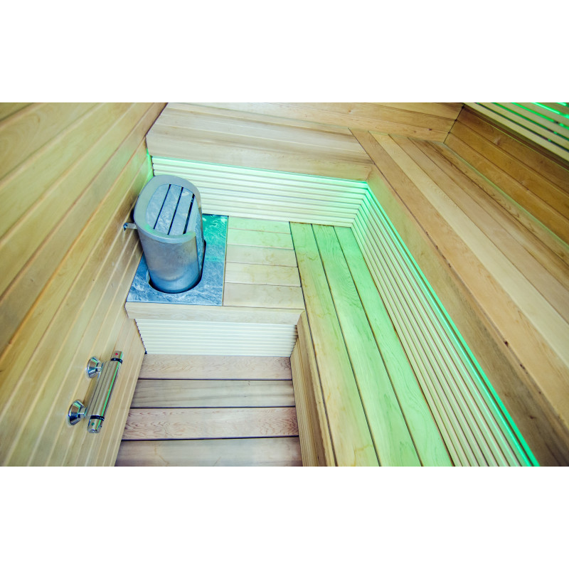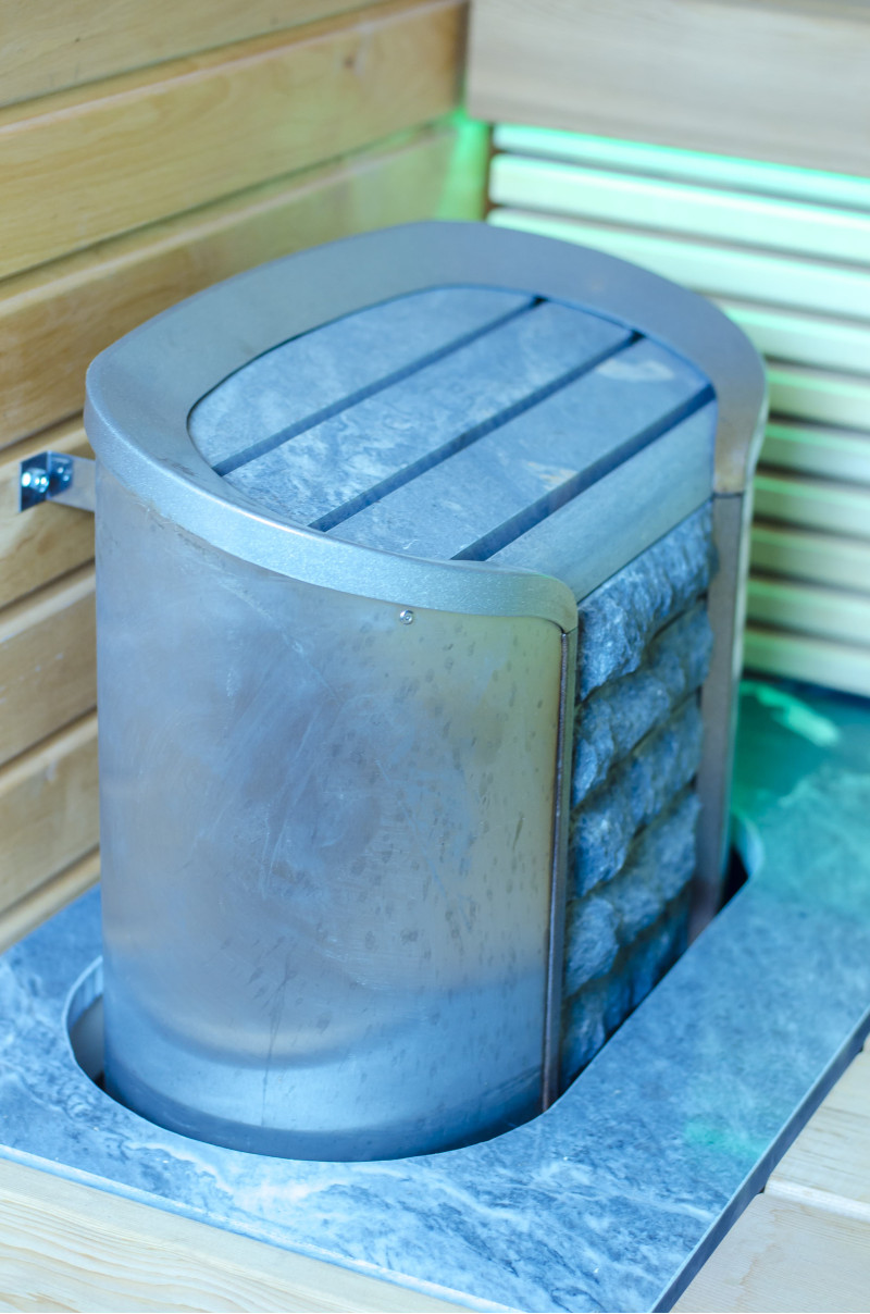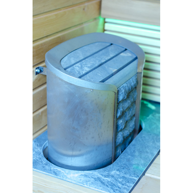 Marginea de protecție a încălzitorului este piatră de granit. În încălzitor a fost introdusă o conductă de abur de la generatorul de abur al saunei cu abur, ceea ce permite obținerea unei umidități mult mai mari în camera de saună. Toate acestea sunt combinate într-un singur sistem de management comun. Aceasta este o alegere excelentă dacă nu aveți condițiile pentru a instala o baie de aburi și o saună.