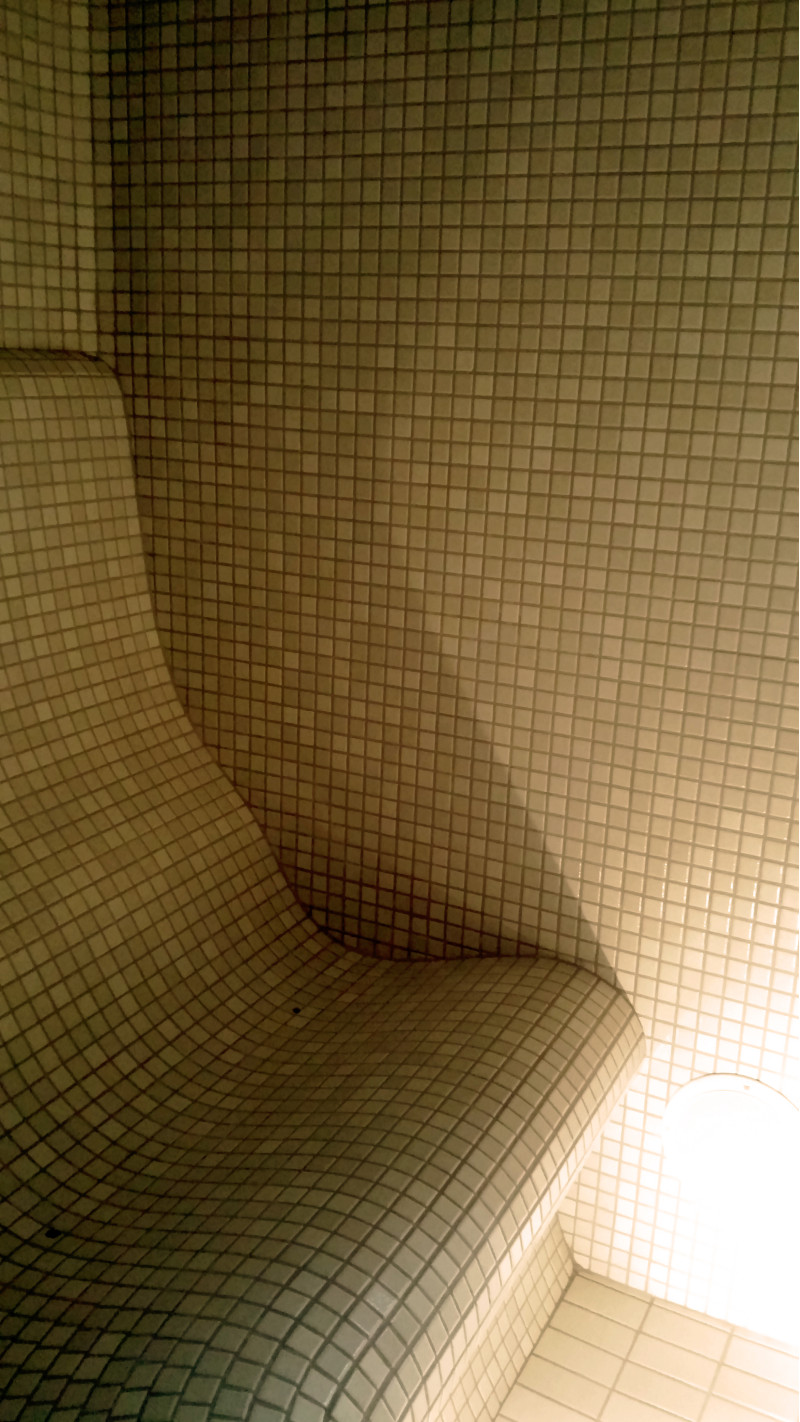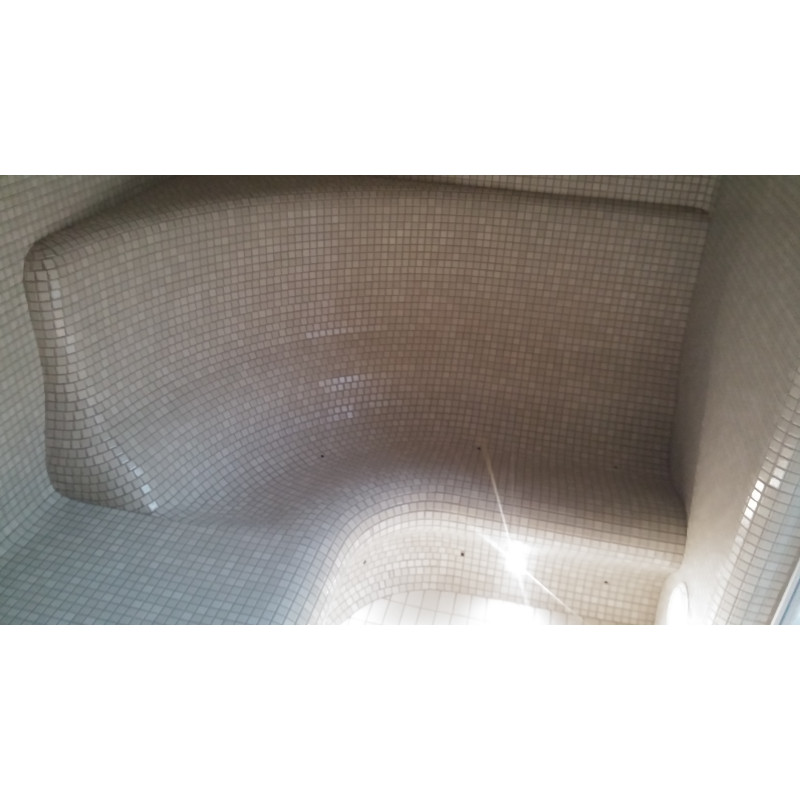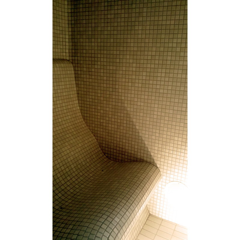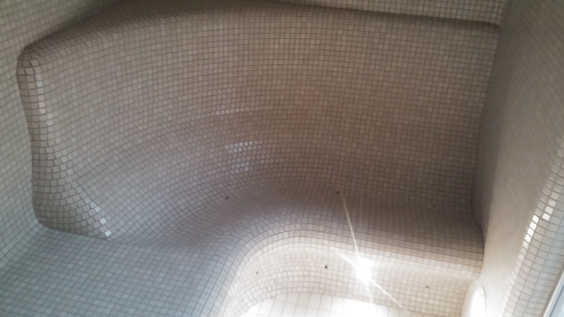 Finisaj - tavanele, pereții și șezlongurile saună sunt decorate cu plăci de mozaic din sticlă zdrobită. Podeaua este o gresie cu longevitate.