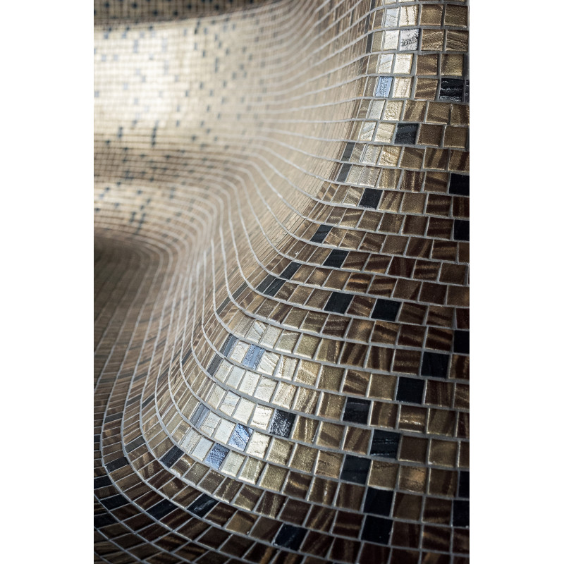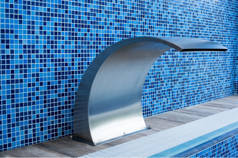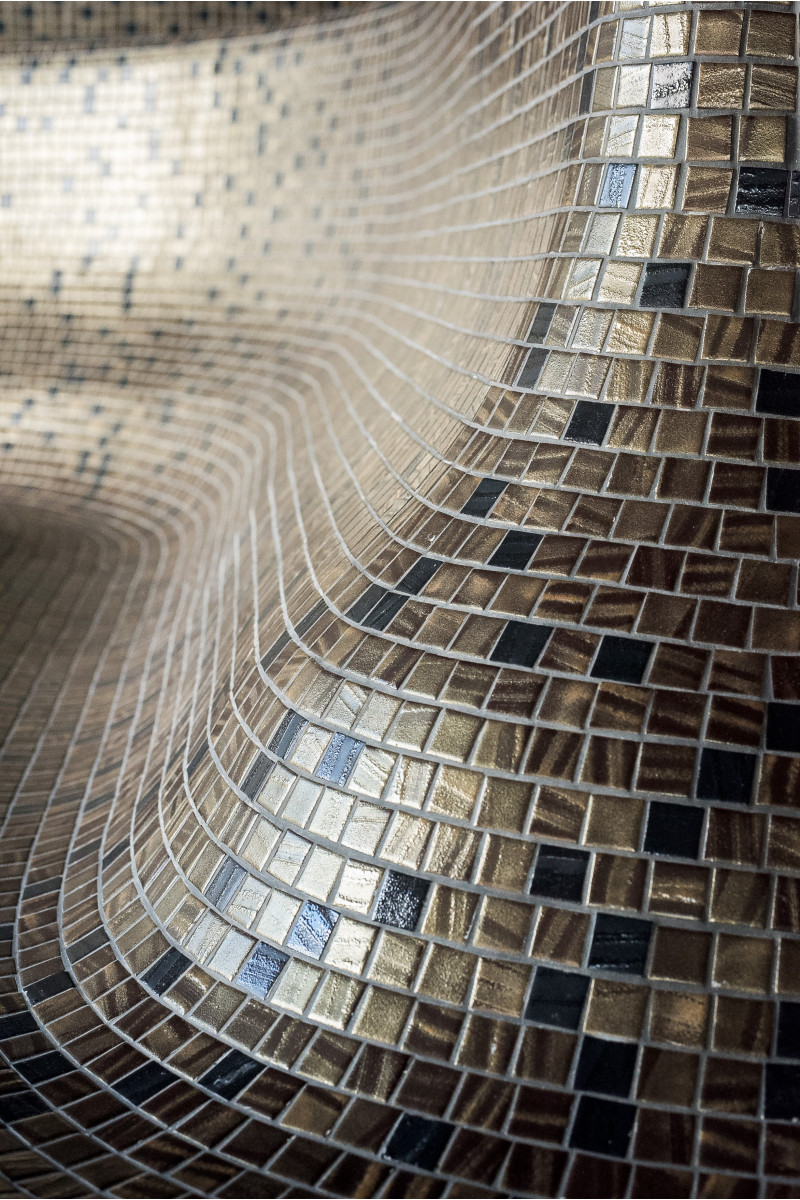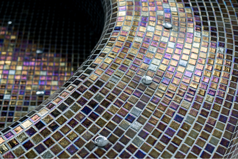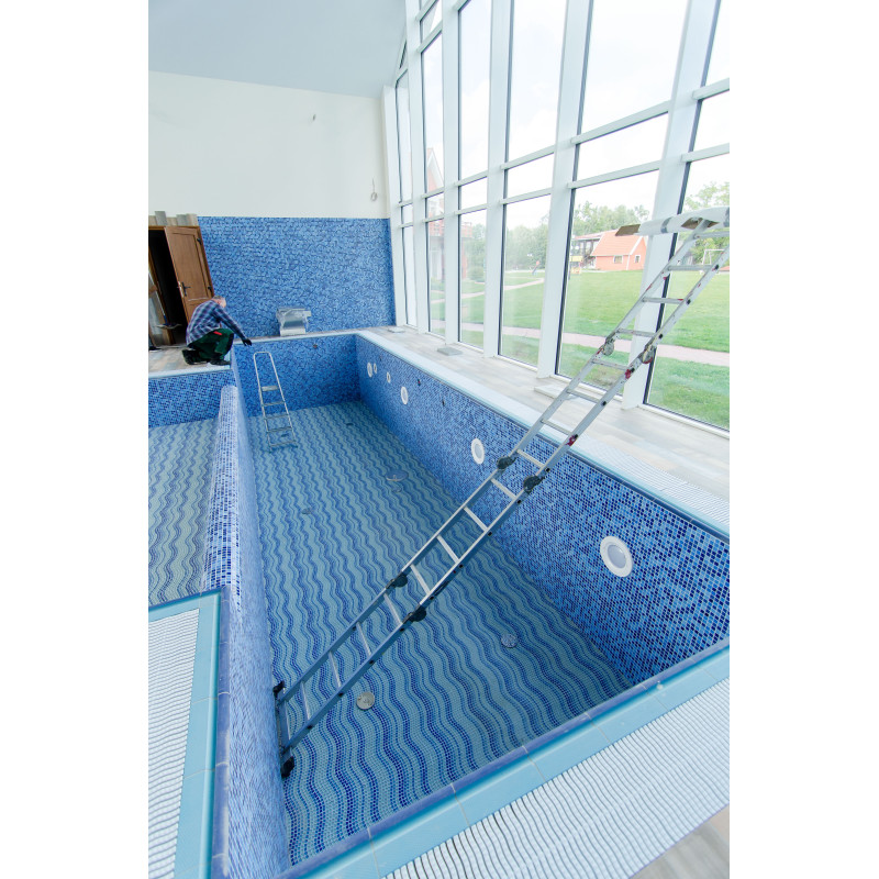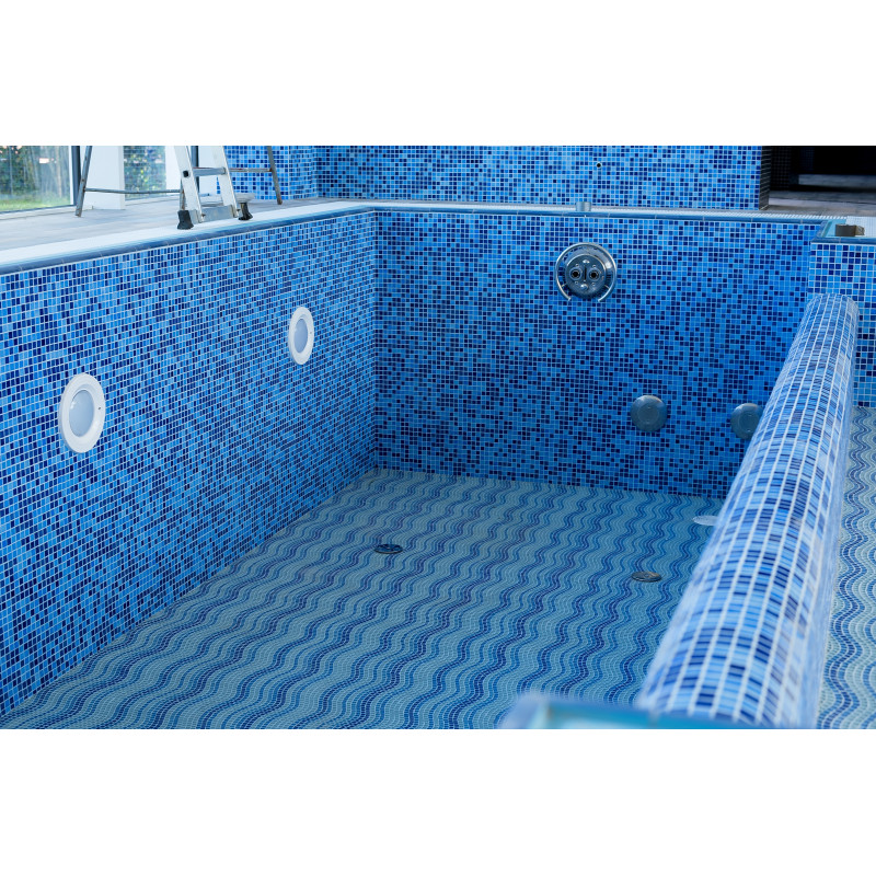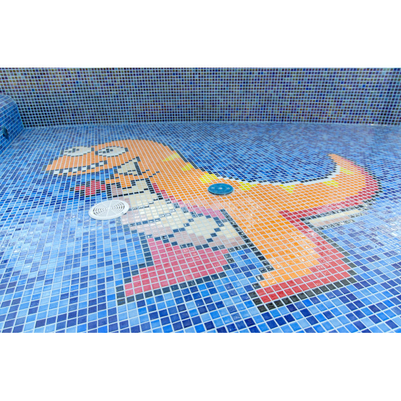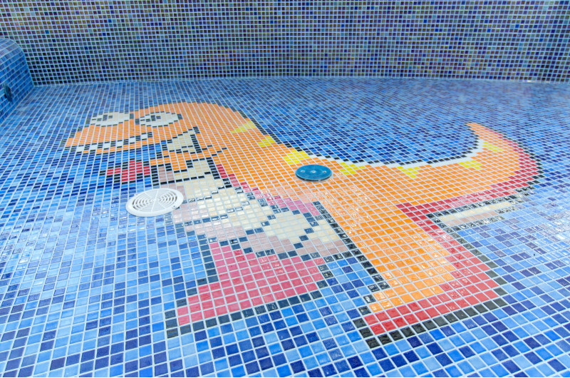 Piscina de 15 cm adâncime este concepută pentru cei mai mici pasionați de apă. Fundul său este decorat cu un desen de mozaic colorat.
