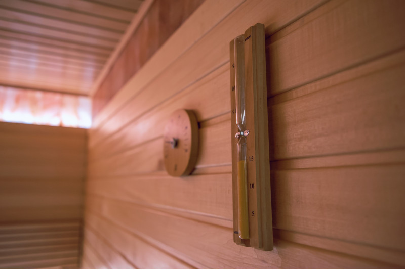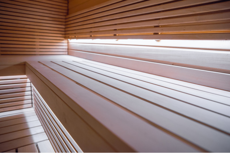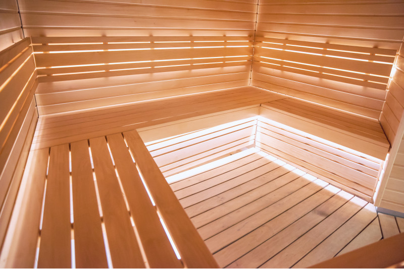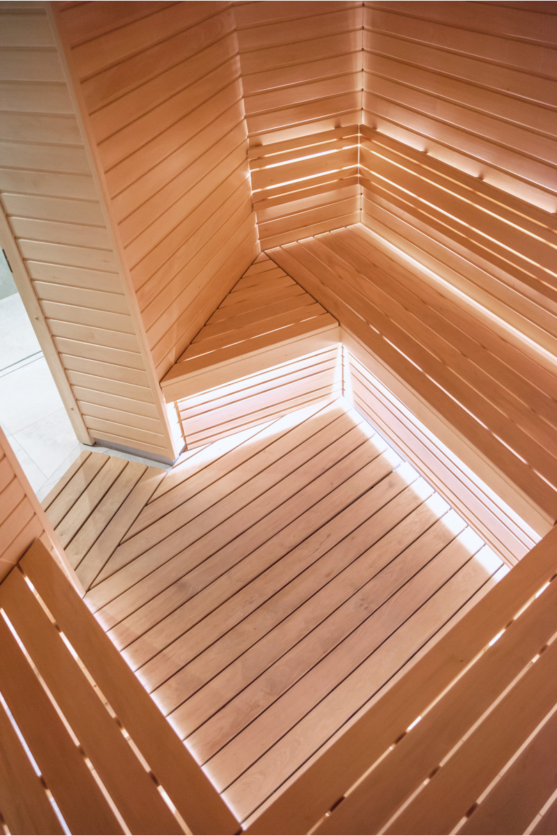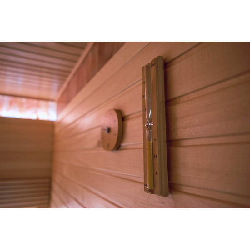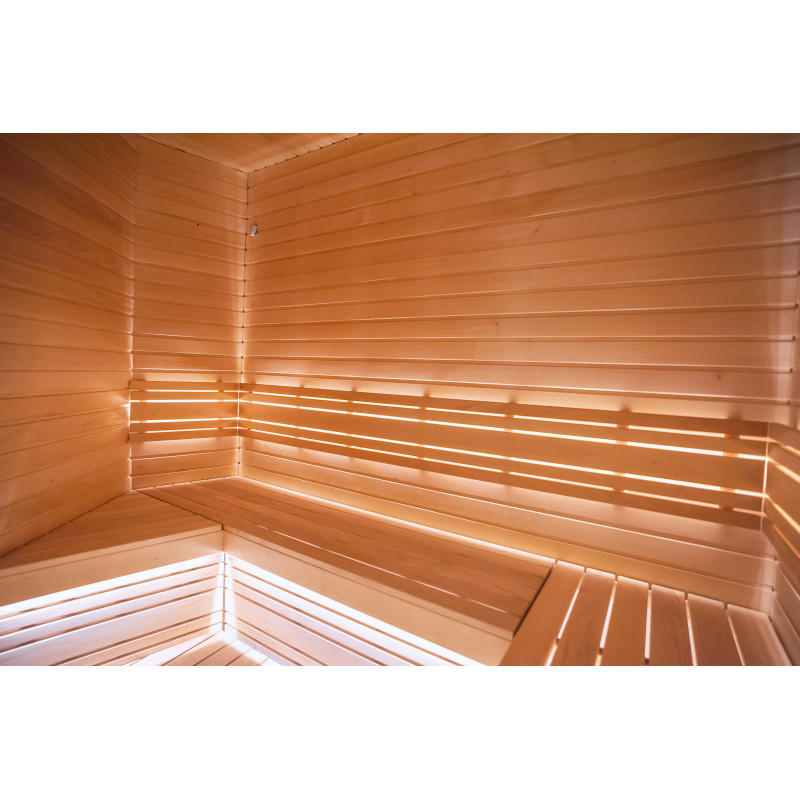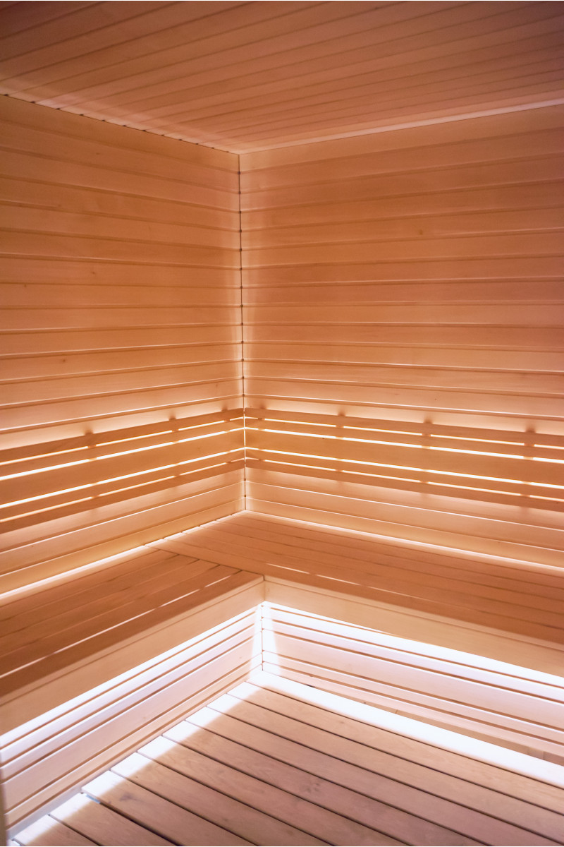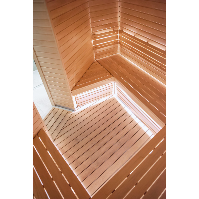 Detaliile interioare din lemn ale saunei sunt realizate din lemn de tei.
