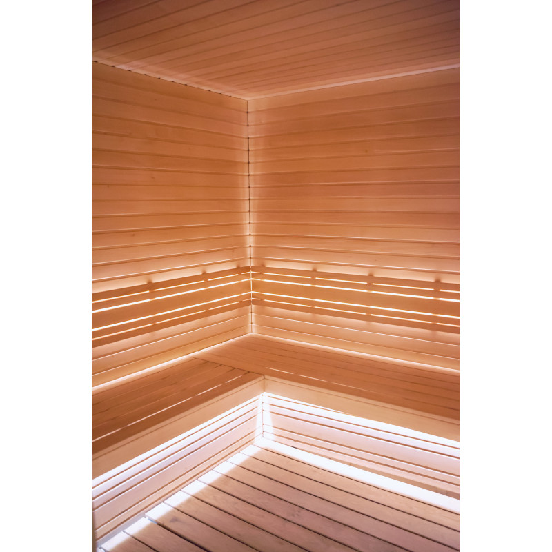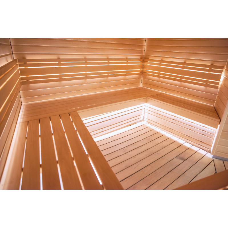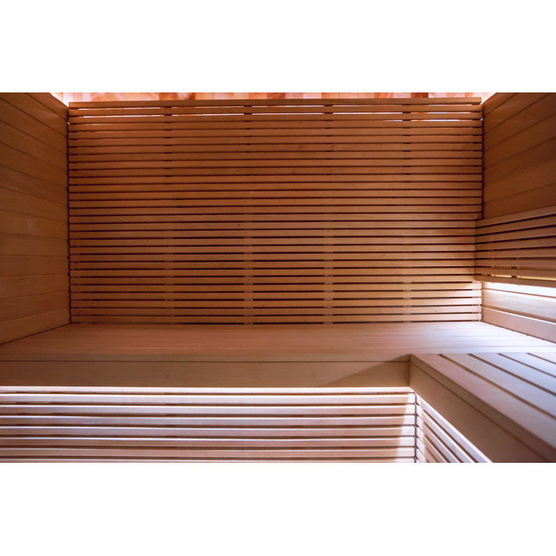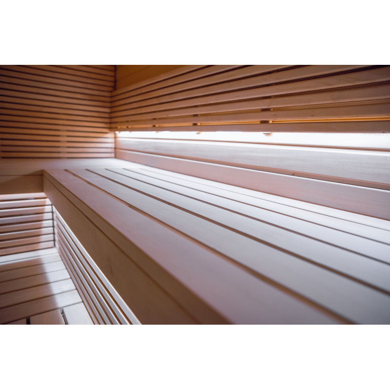 Lemnul de tei de tip A a fost folosit pentru paturile de saună, suporturile pentru spate, tavanul saună și panourile de perete. Grătarul de podea este din lemn de arin negru.