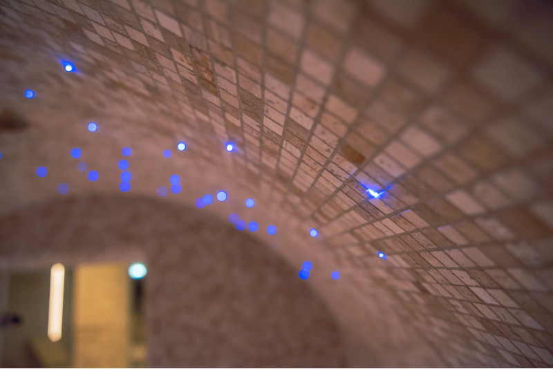 Iluminatul cu LED este instalat sub patul superior, în spătare și în spatele fâșiei de cărămizi de sare de Himalaya.