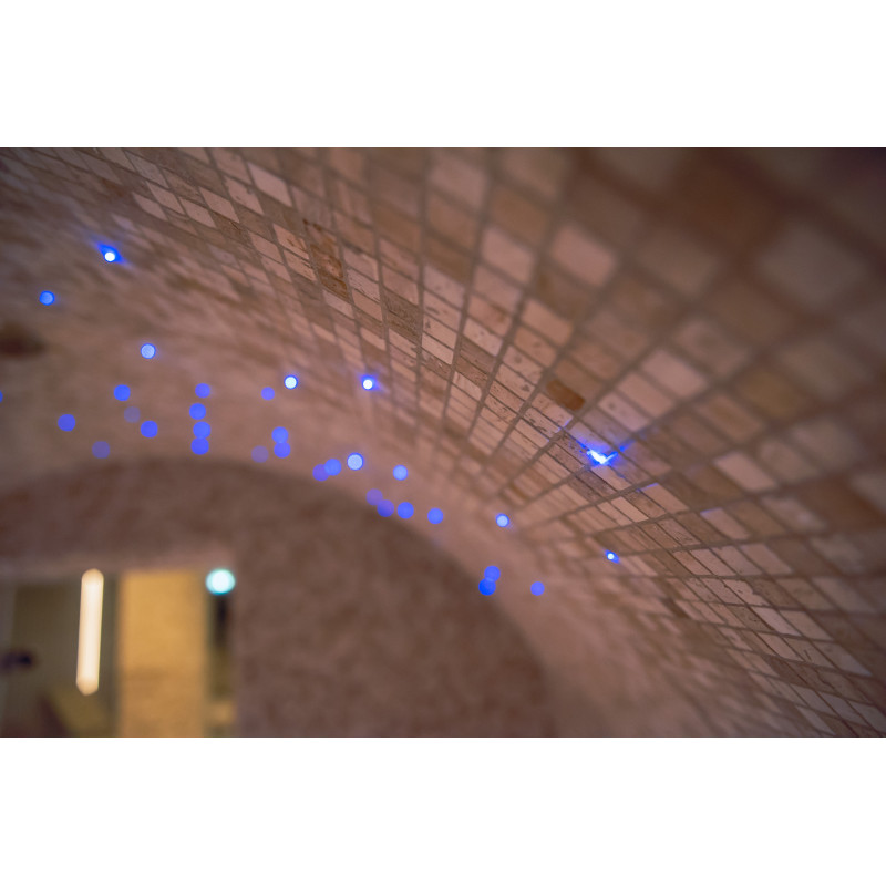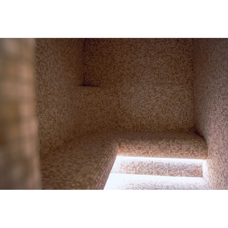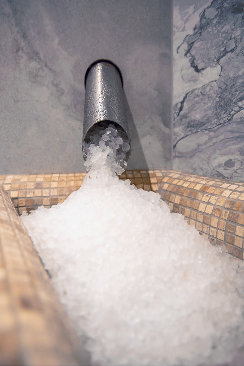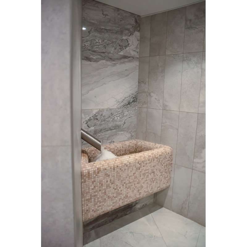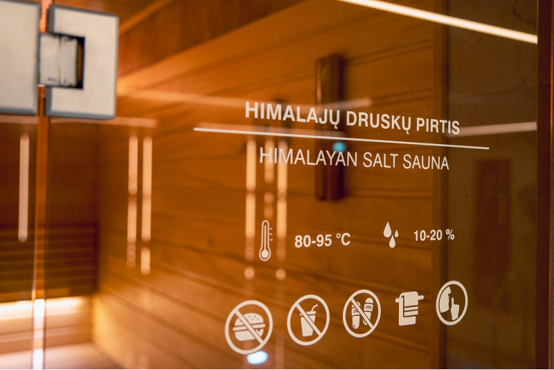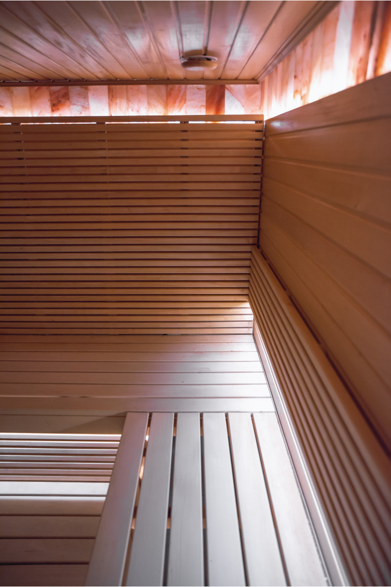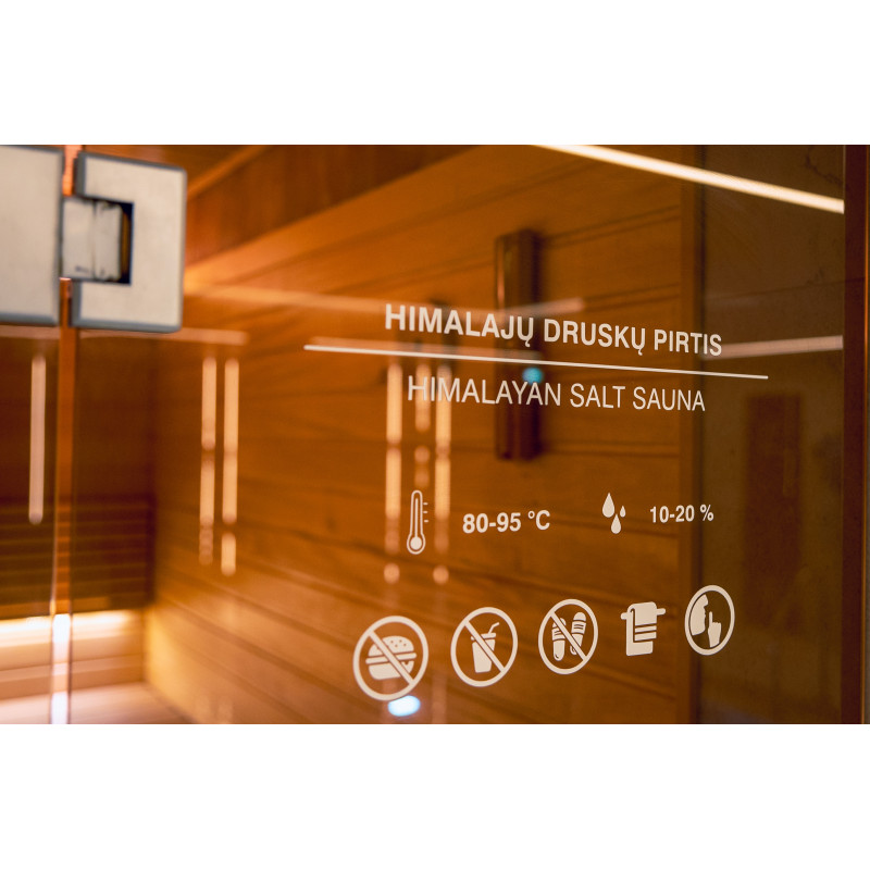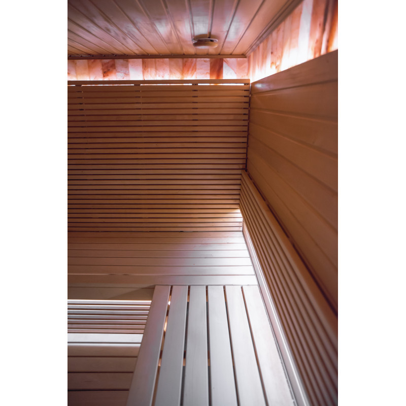 Un perete de țiglă de sare de Himalaya într-o saună modernă este o soluție excelentă atât din punct de vedere estetic, cât și din punct de vedere al îmbunătățirii sănătății. O fâșie de sare de Himalaya se formează la 20 cm înălțime pe perete chiar lângă tavan, în jurul întregului perimetru al saunei. Iluminatul LED este instalat în spatele plăcilor de sare.