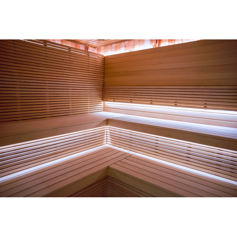 Sauna este dotata cu echipament de ventilatie, iluminare LED sub paturile superioare si in suporturile din spate.