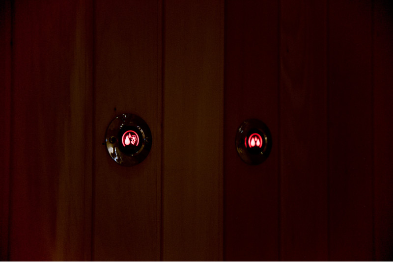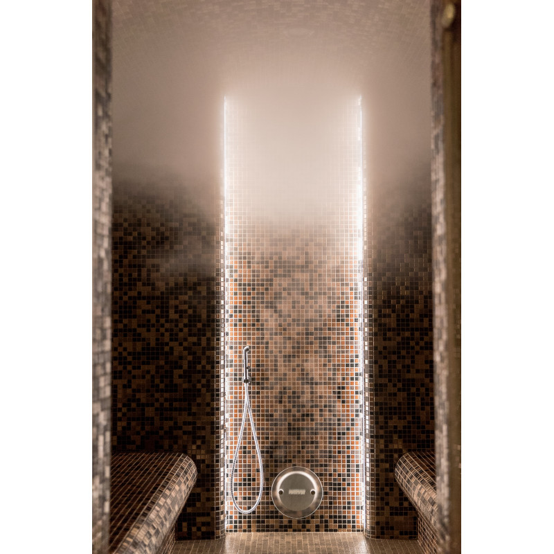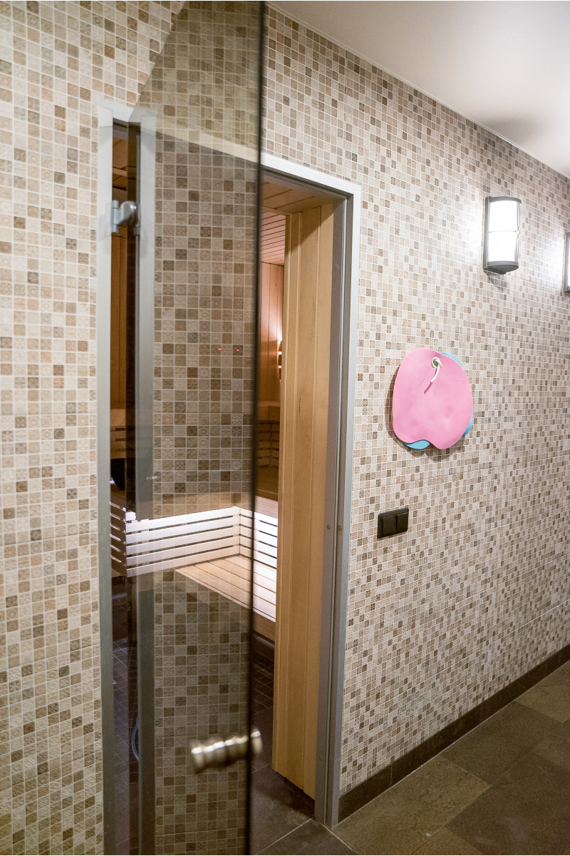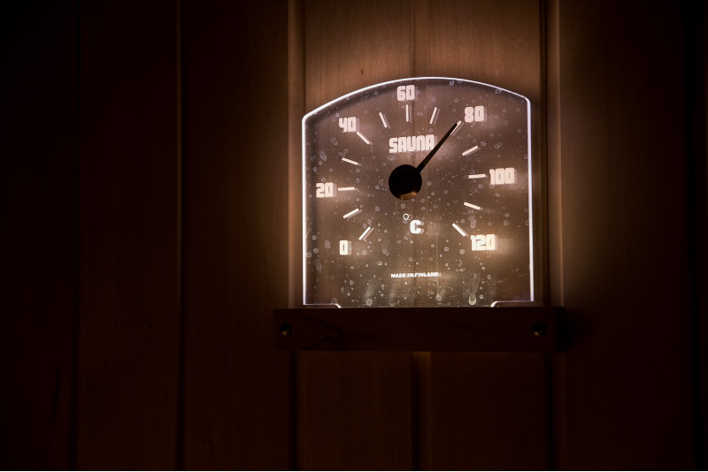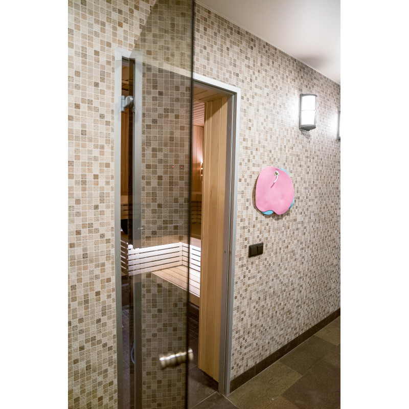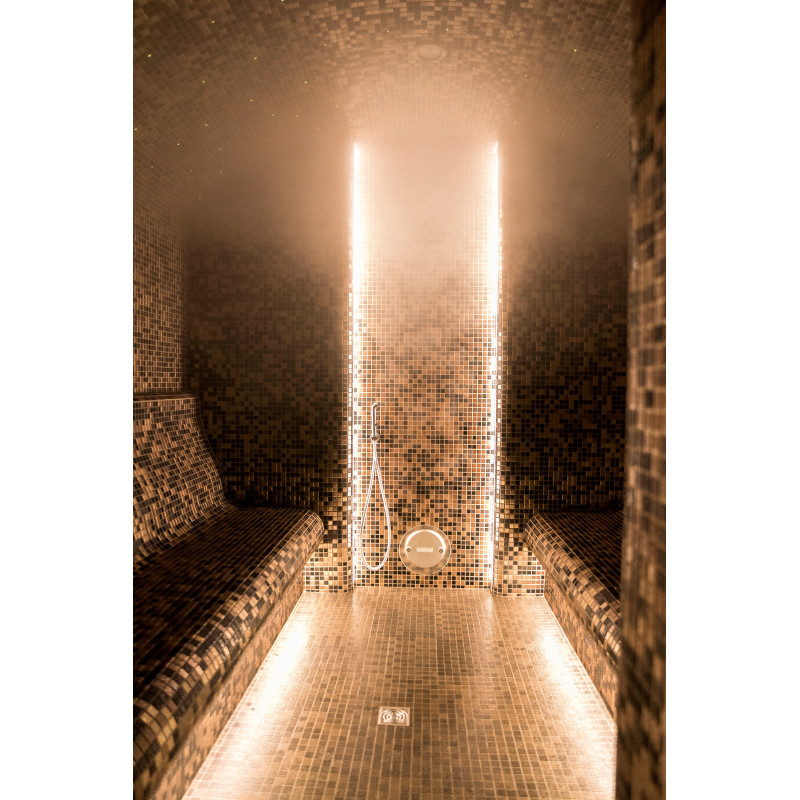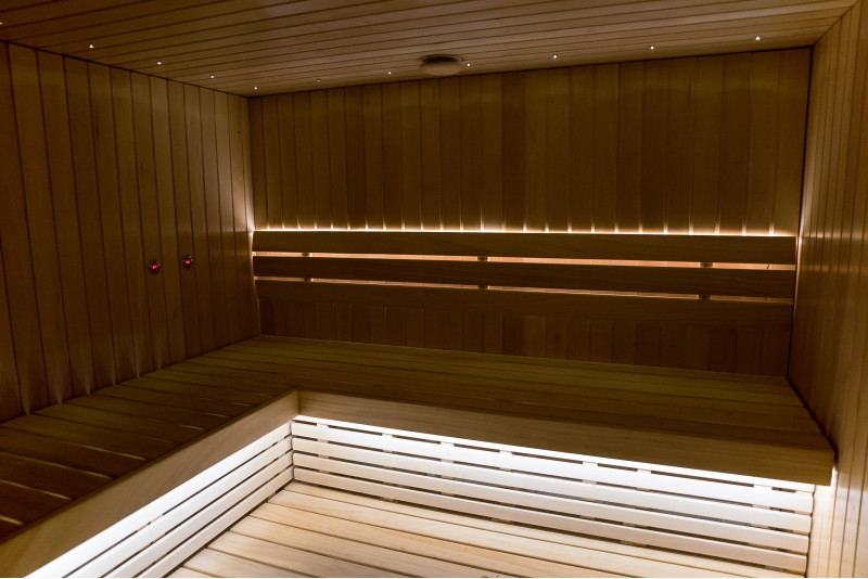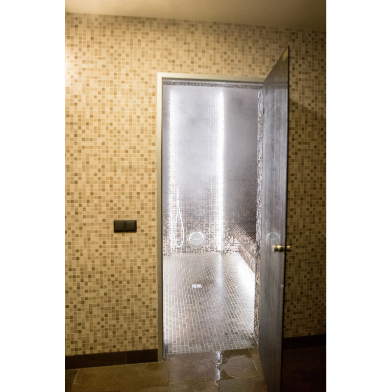 Pentru iluminarea saunei a fost folosit sistemul de iluminat cu fibra optica „Cer instelat” - flux de lumina LED cu culori modificabile, 120 de fibre.