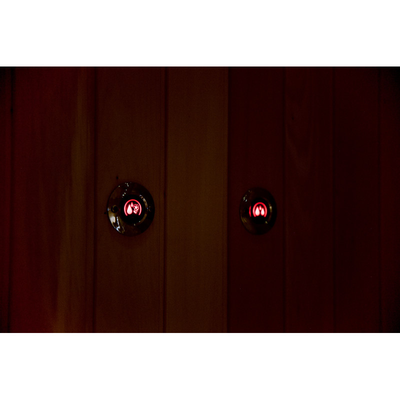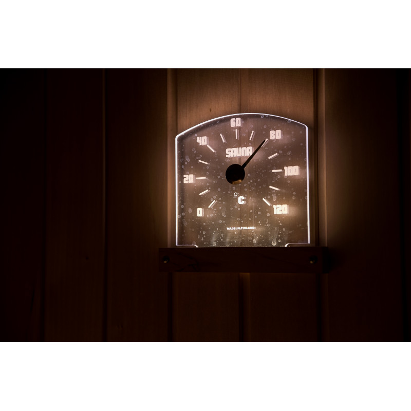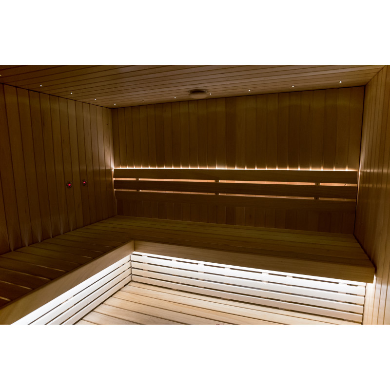 Echipat cu iluminare RGB color sub băncile superioare și spătare. Acest iluminat pentru saună este rezistent la umiditate și temperatură. Culoarea luminii poate fi schimbată în funcție de starea dvs. de spirit.