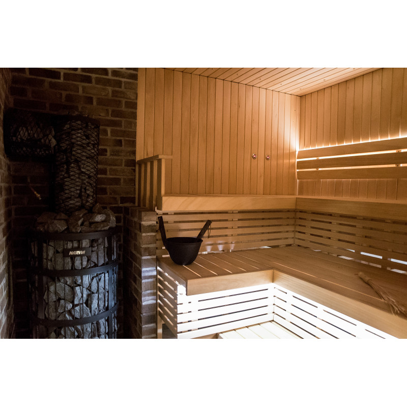 Detaliile interioare din lemn ale saunei - bănci și siding - sunt realizate din lemn de arin negru de înaltă calitate.