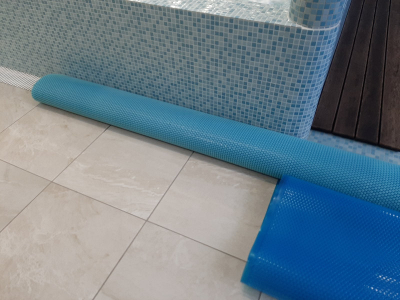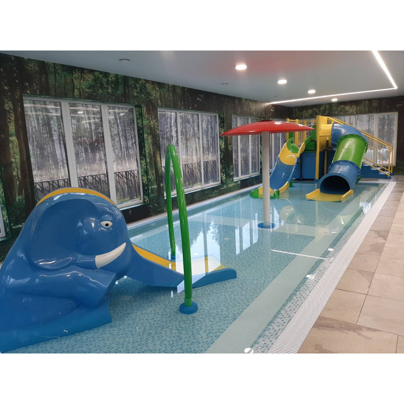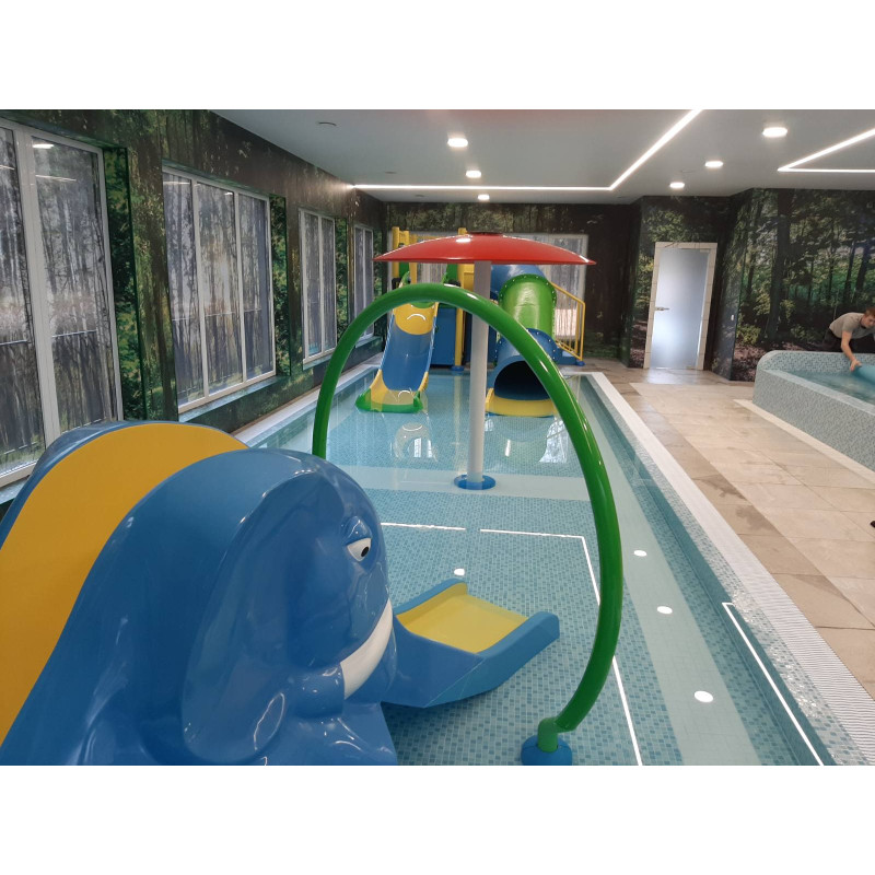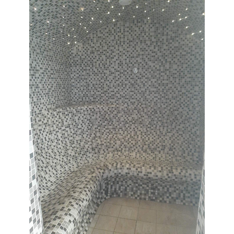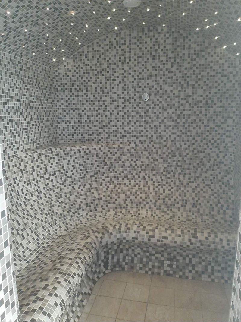 - Sauna cu aburi - materiale folosite care pot rezista la temperaturi extrem de ridicate si la umiditate foarte mare. Tavanul este de tip arc pentru ca condensul de abur să nu picure pe cei care se bucură de saună. S-au ales gresie pentru decor și iluminare cu fibră optică pentru tavan, creând un efect de cer înstelat. Băncile sunt într-o formă deosebit de confortabilă.