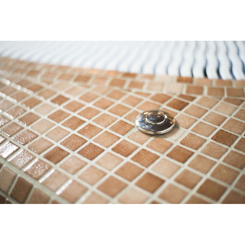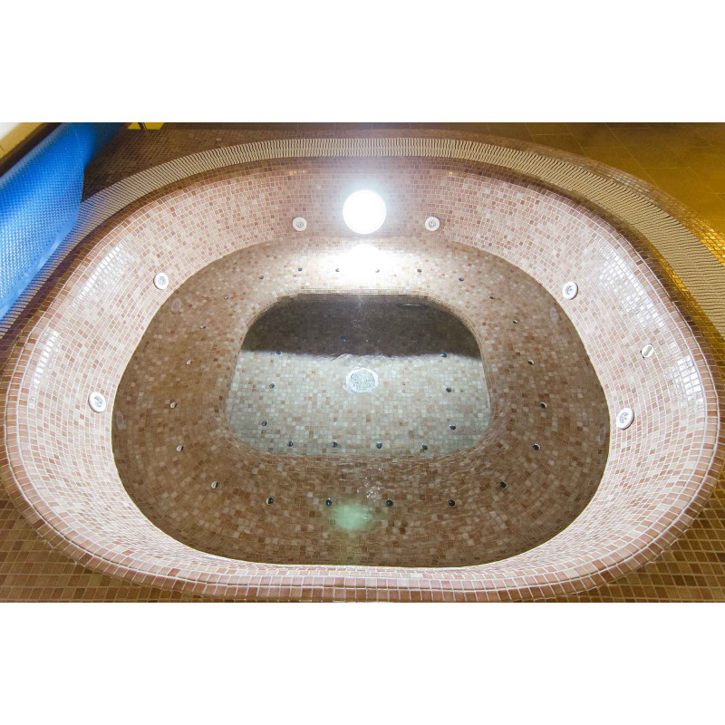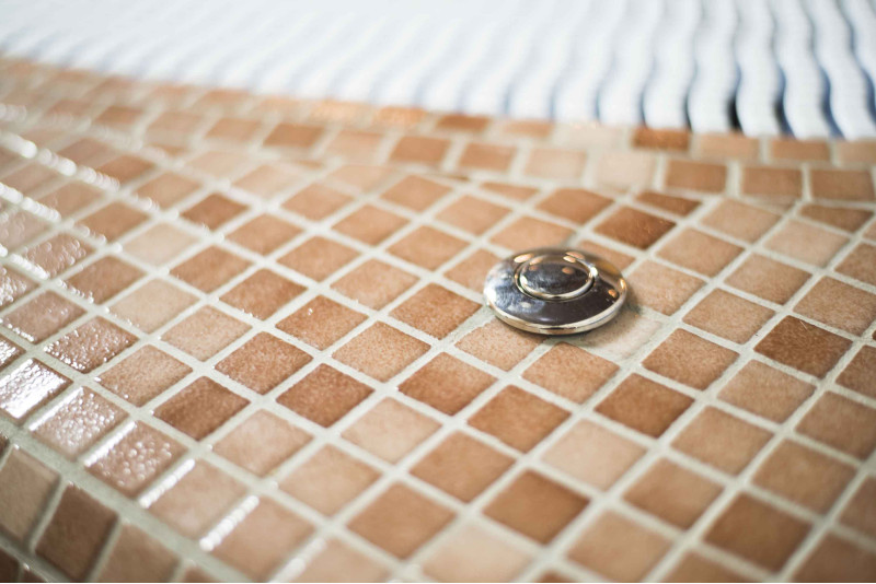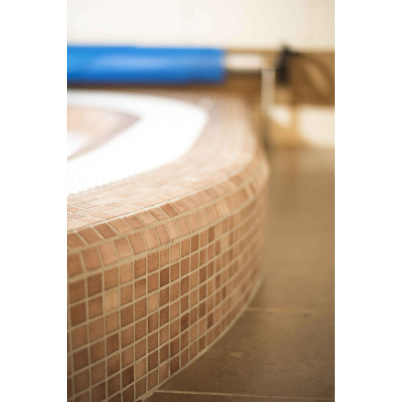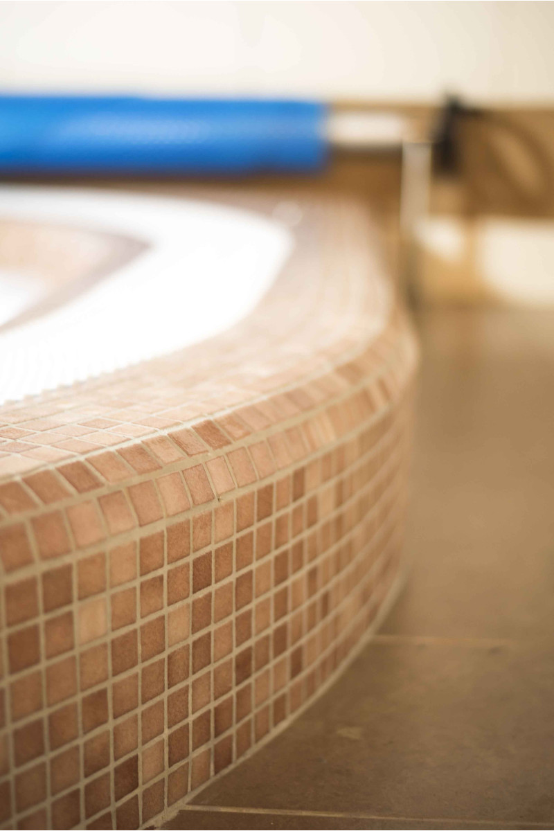 - Gresie - interiorul și exteriorul piscinei sunt acoperite cu mozaic de sticlă zdrobită de culoare neutră.