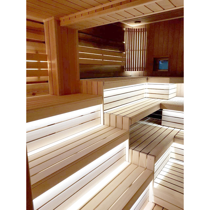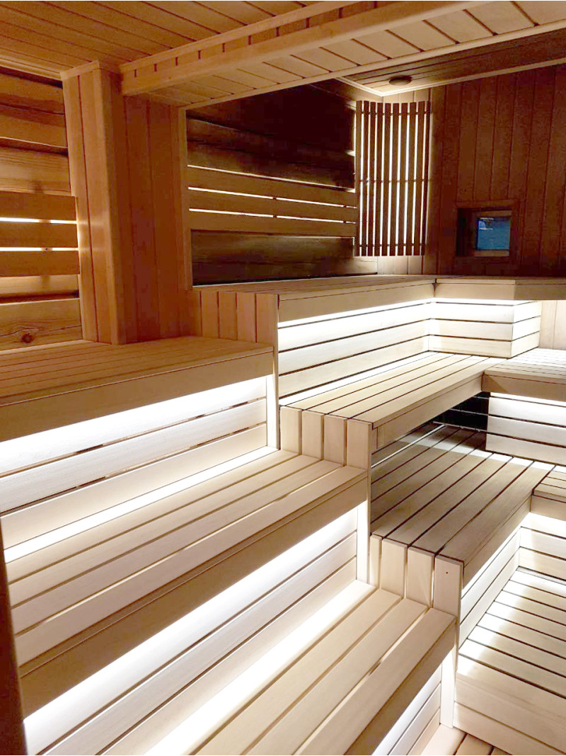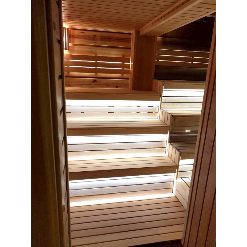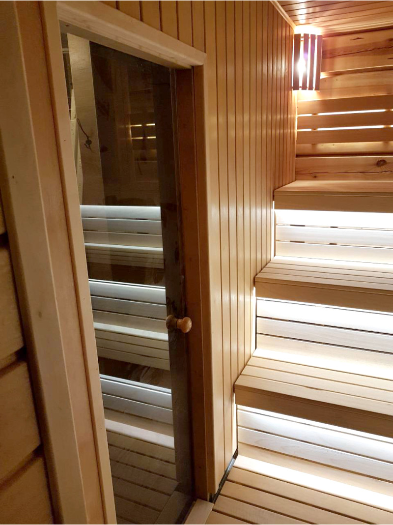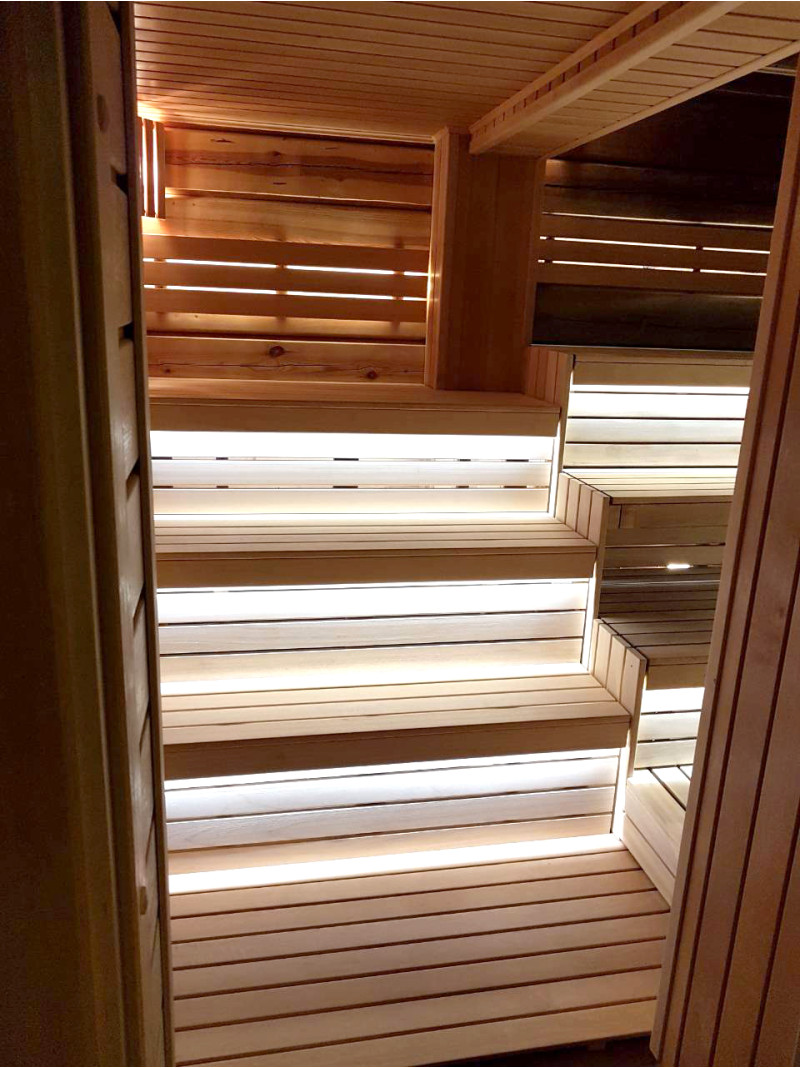 Iluminarea cu LED alb cald este instalată sub șezlonguri, oferind saunei o senzație de spațiu și confort. Pentru iluminatul de perete a fost ales un corp de iluminat cu capac din lemn asortat.