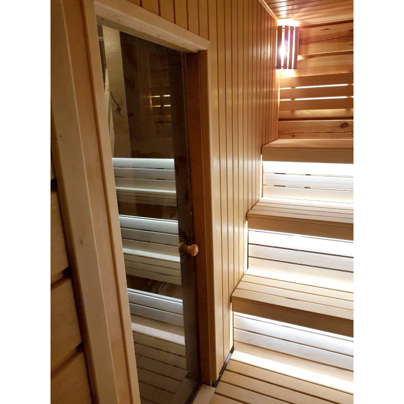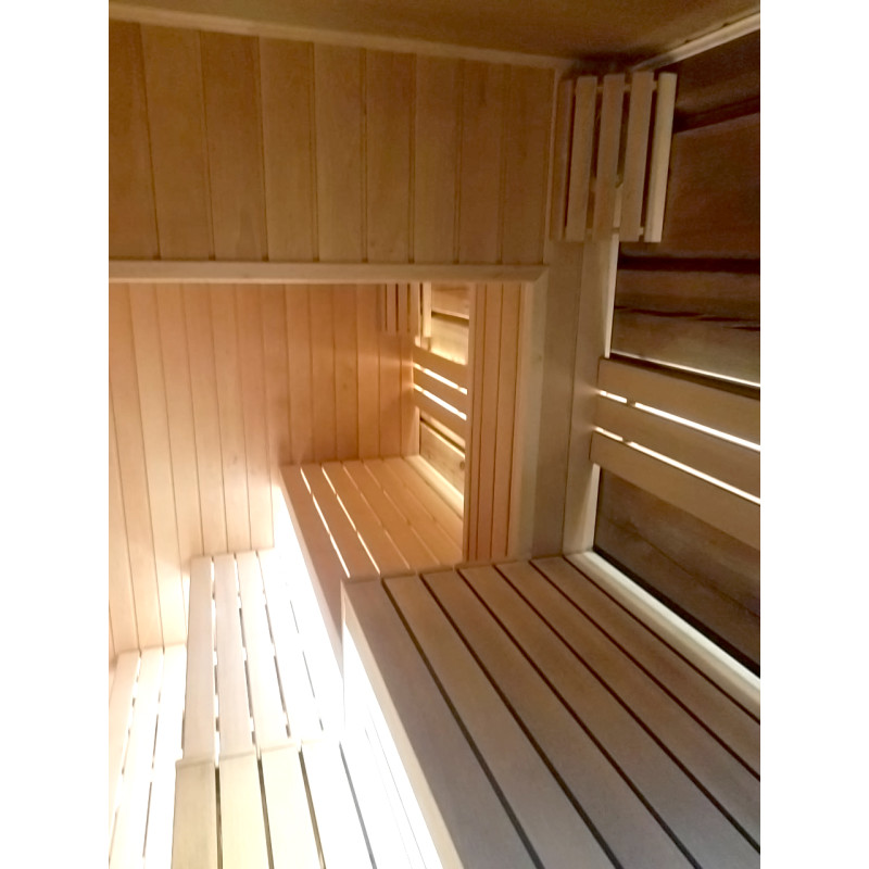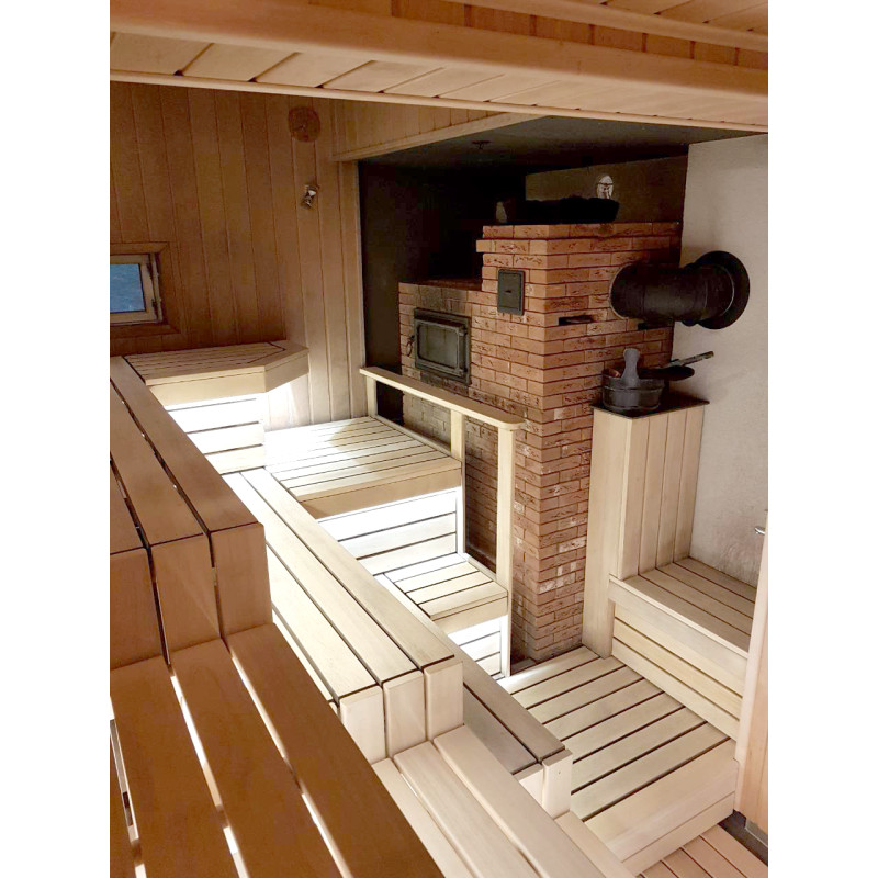 Lemnul este impregnat, protejat de căldură mare și gata de utilizare pe termen lung. Băncile și spătarele sunt lubrifiate cu un ulei special pentru lemn de saună.