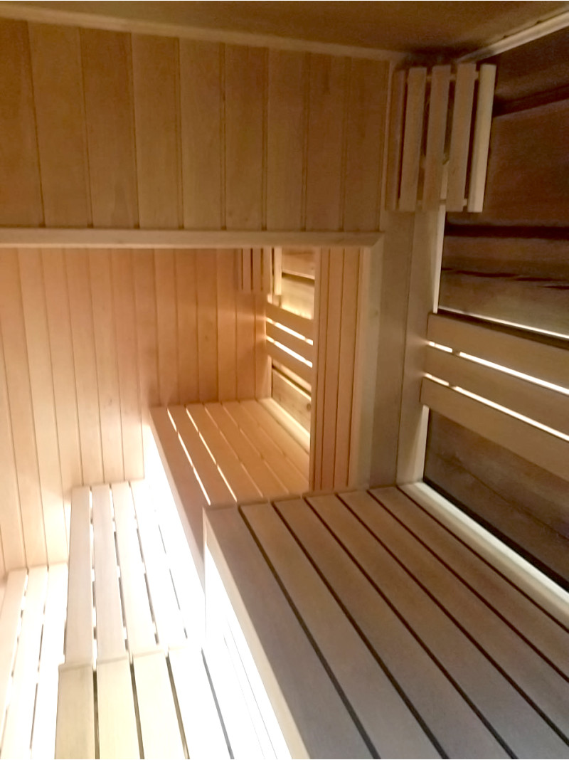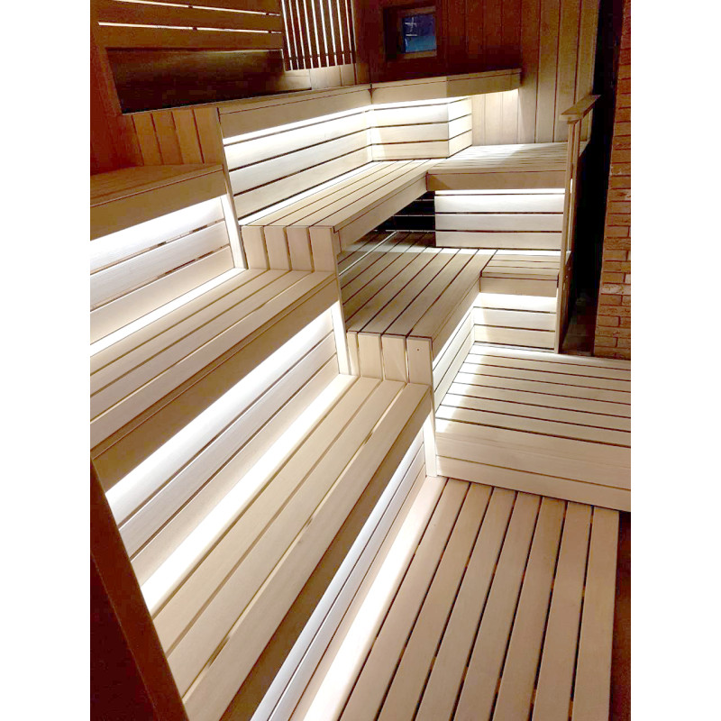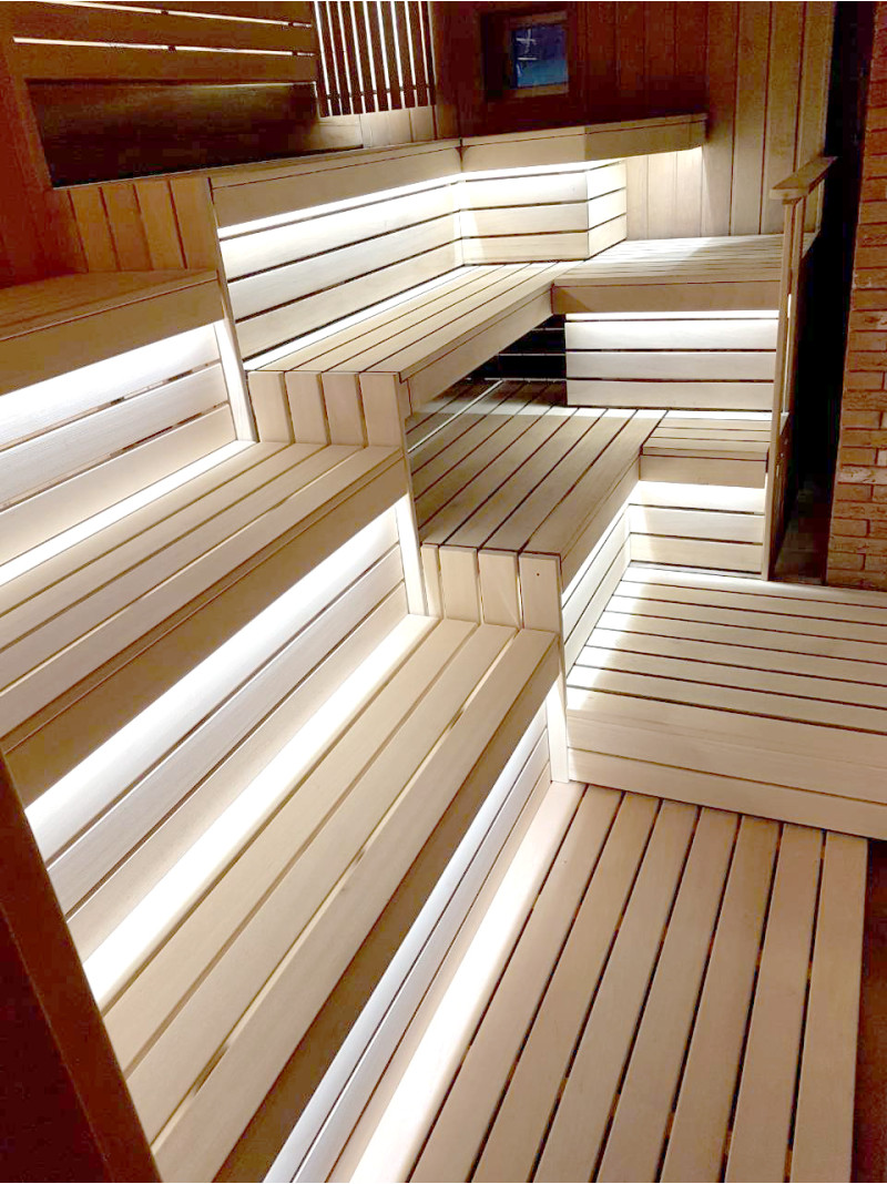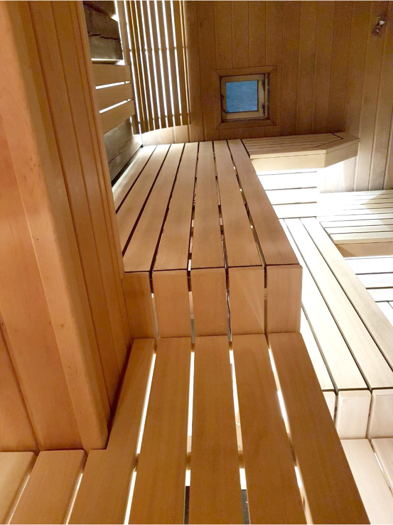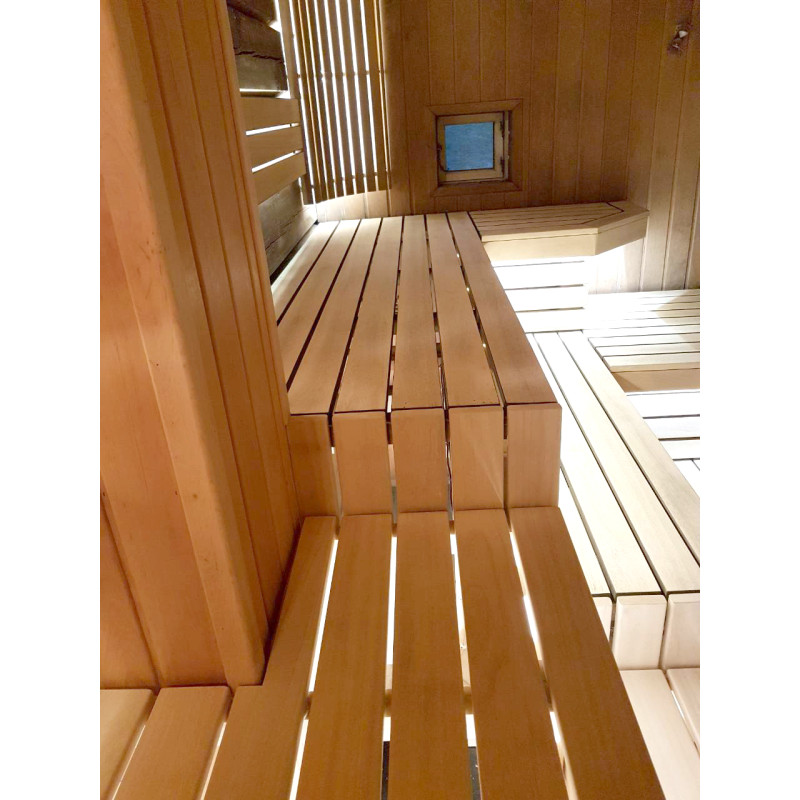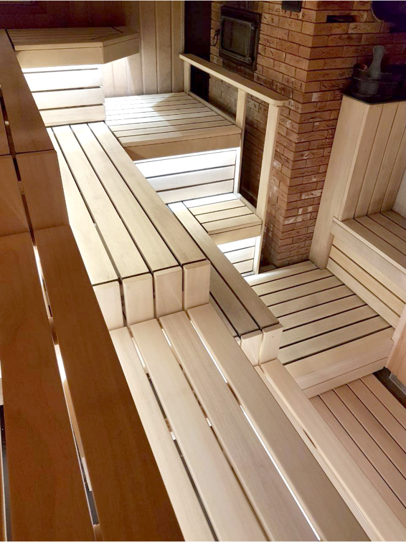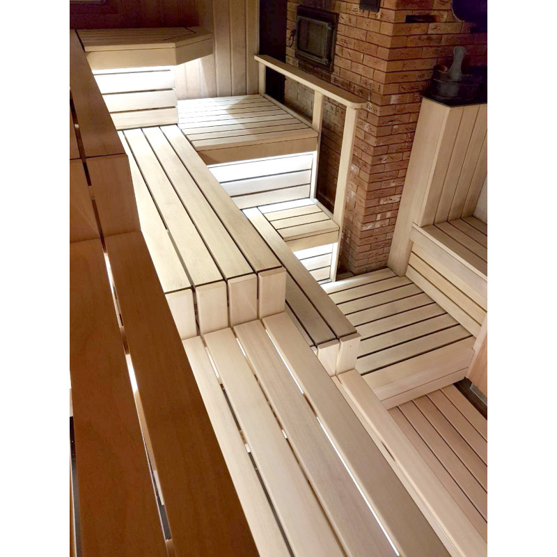 Se alege siding din lemn de arin negru pentru tavane si pereti, iar lemn de abachi de cea mai buna calitate pentru banci, spatare si gard. Băncile pot găzdui o mulțime de oameni, iar băncile superioare sunt deosebit de confortabile de urcat.