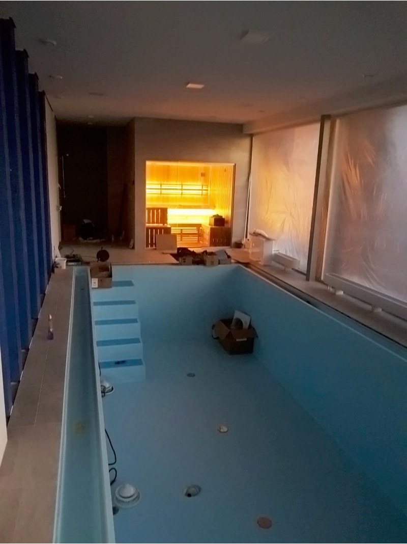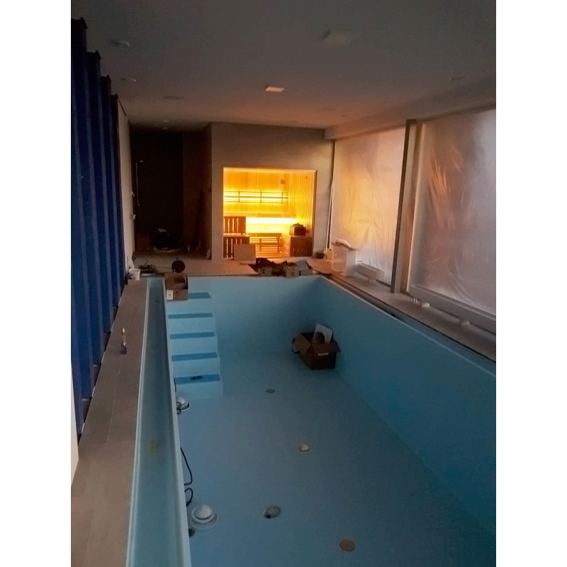 Instalarea unei vitrine din sticlă - sticlă călită colorată de 8 mm într-un cadru de aluminiu. Datorită vitrinei din sticlă se deschide priveliștea zonei piscinei, micuța saună este mărită, iar saunei i se oferă mai multă lumină.