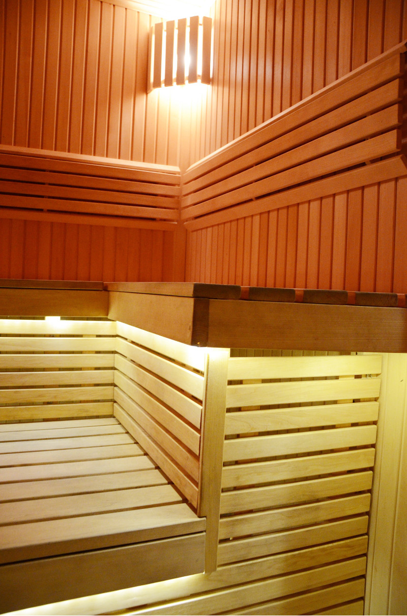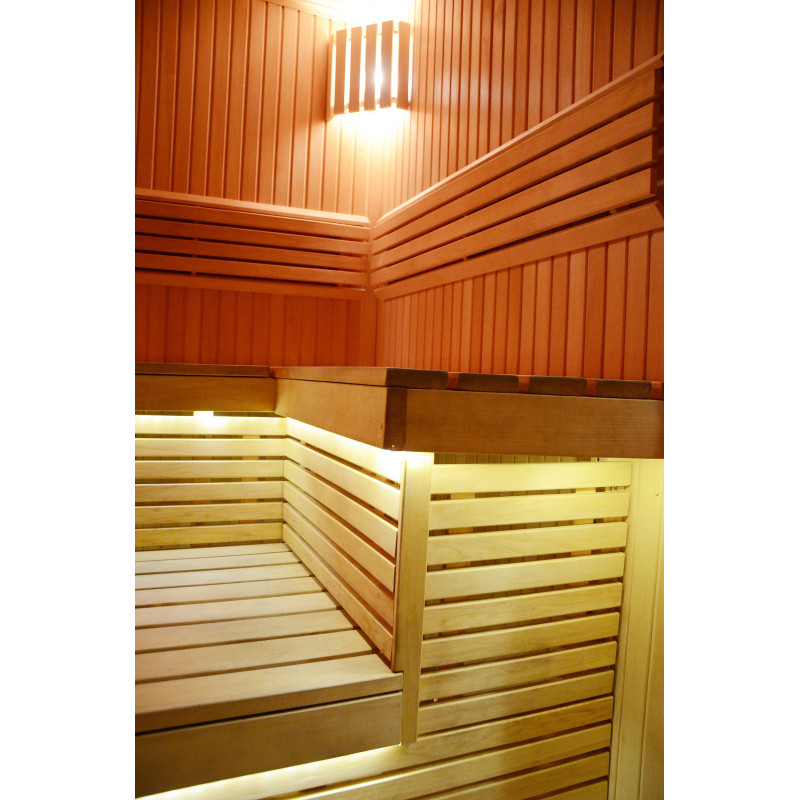 Iluminat - 2 corpuri de iluminat Harvia în colțurile superioare, iluminare cu LED alb cald sub bănci.
