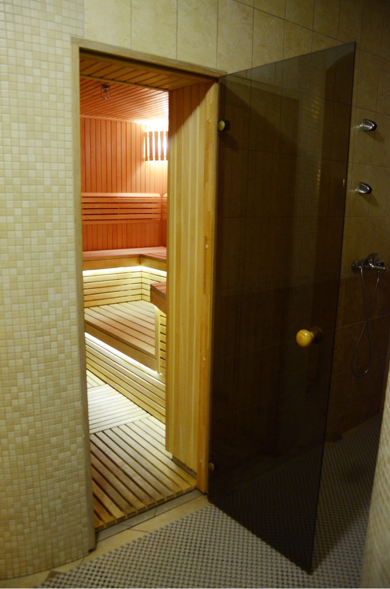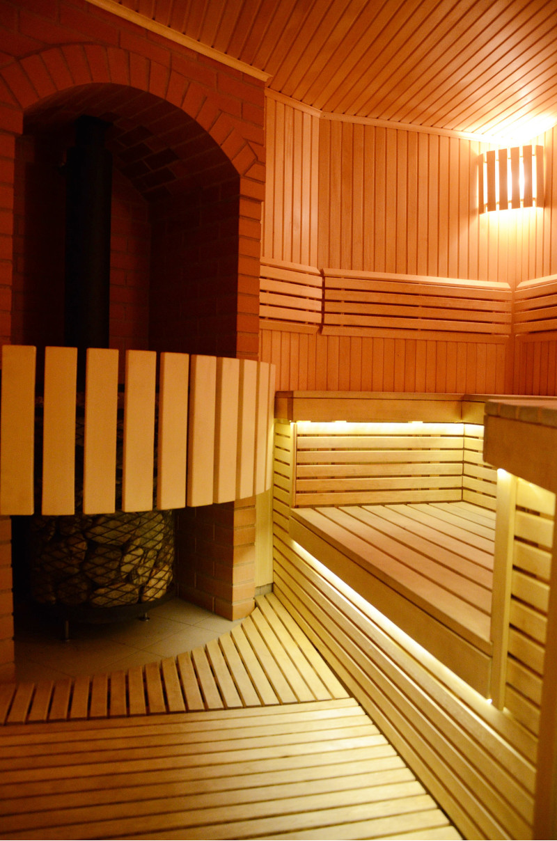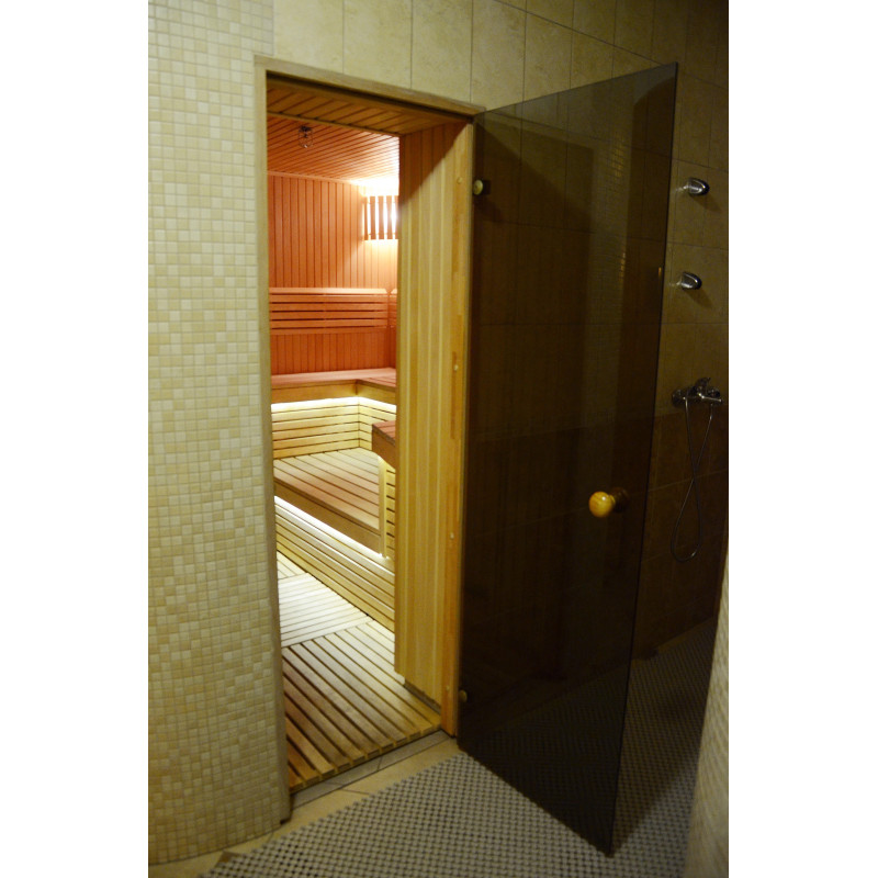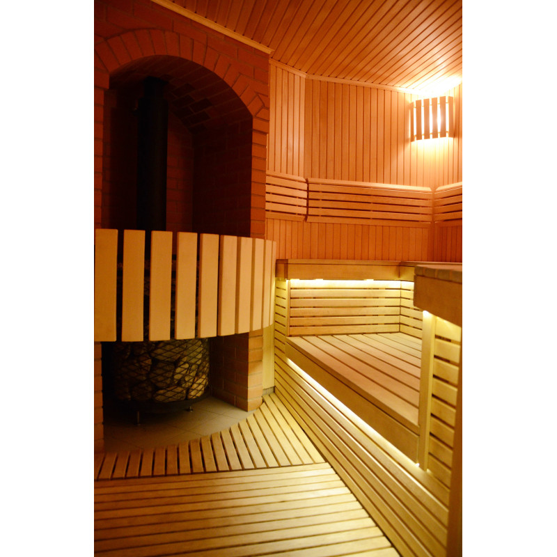 Pereții și băncile saunei sunt realizate din lambriuri din lemn de tei de cea mai bună calitate, care se caracterizează prin culoarea sa strălucitoare, frumoasă și radiază o aromă naturală plăcută. Capacele corpurilor de iluminat, spătarele și un gard de protecție original în jurul încălzitorului sunt, de asemenea, din lemn.