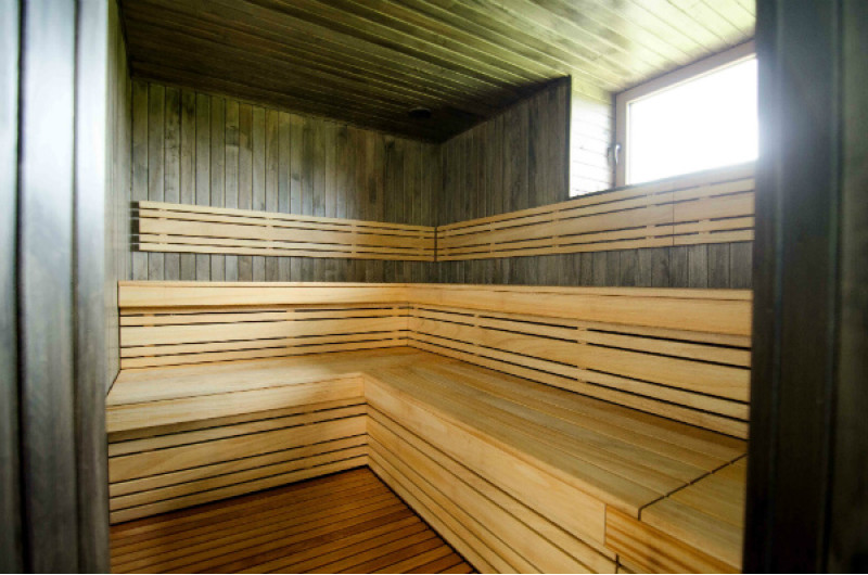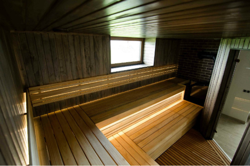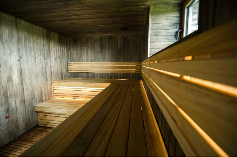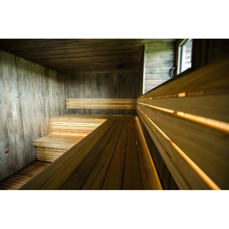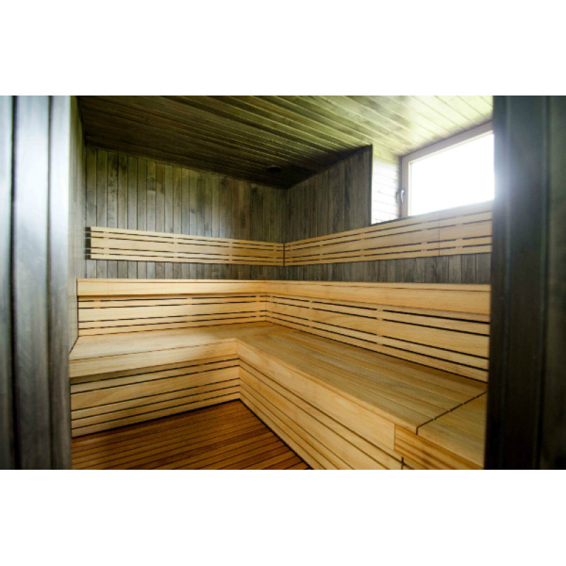 Lemnul saunei este cerat, uns cu ulei, gata pentru utilizarea pe termen lung a saunei.