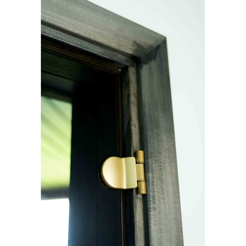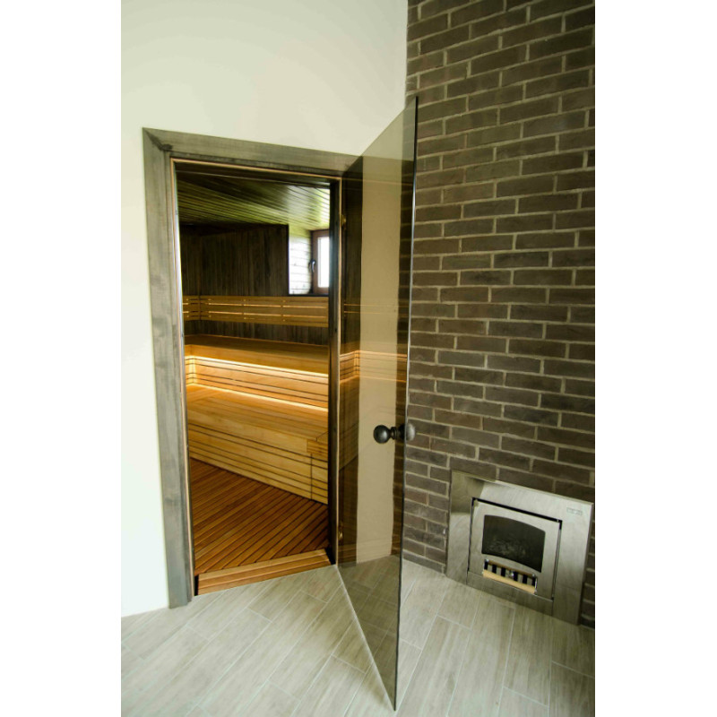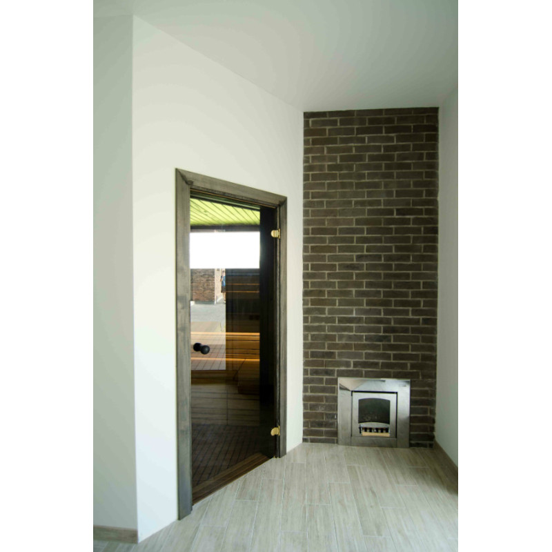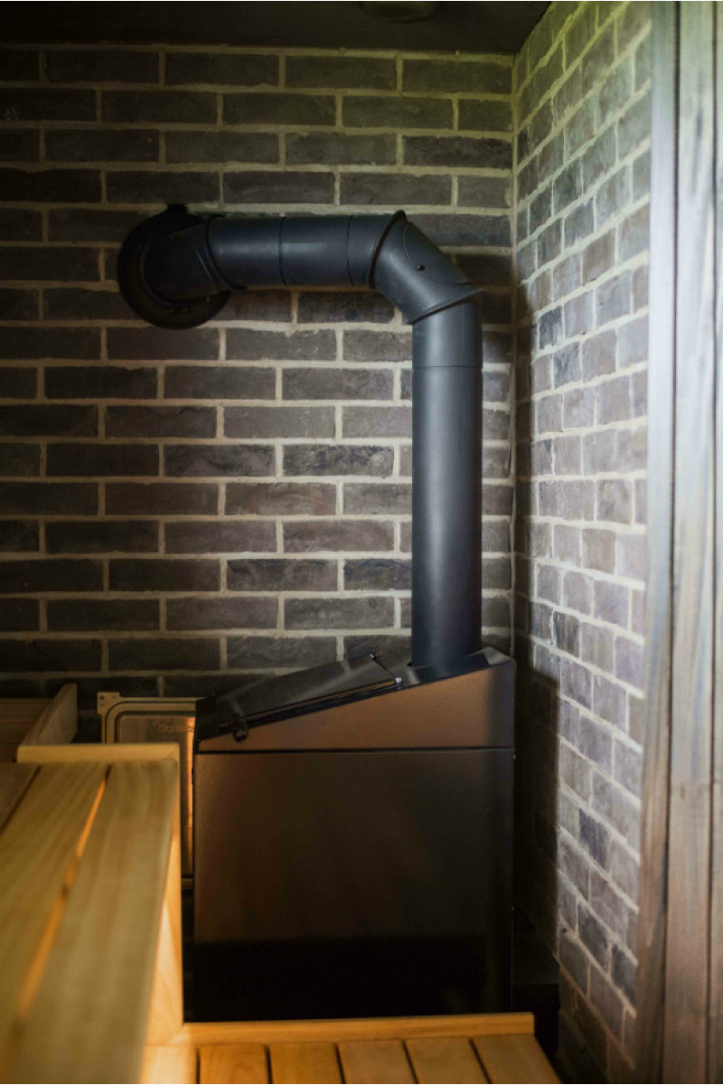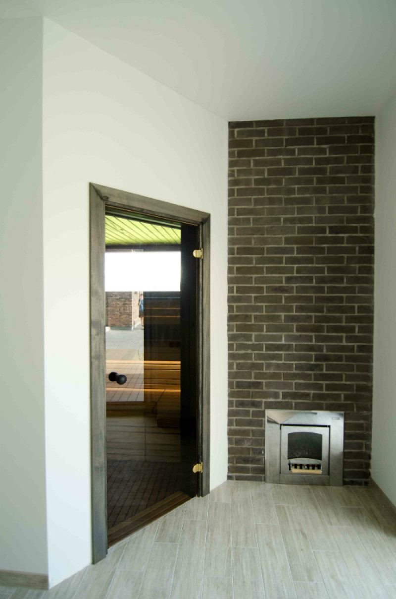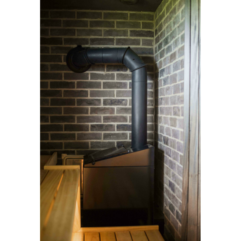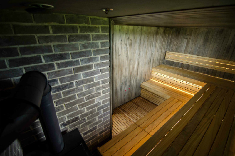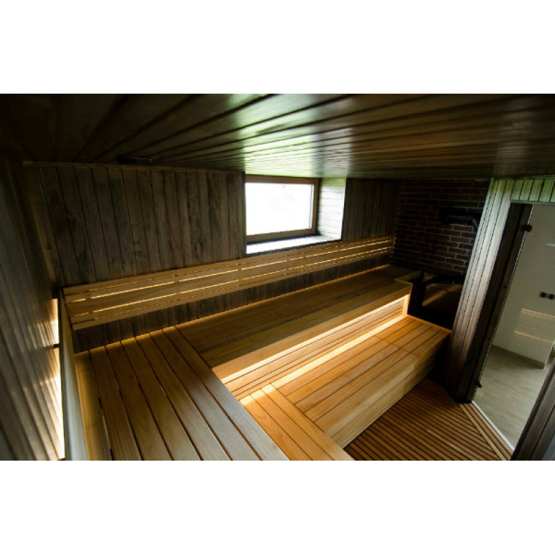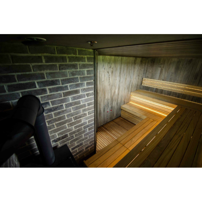 Pereții și tavanul, ceruiți cu o ceară neagră specială, contrastează cu băncile de saună luminoase, camera arată unic, creând o atmosferă confortabilă și modernă. Acest contrast de bănci și pereți este accentuat și mai mult de iluminatul LED alb, rezistent la temperatură și umiditate, încorporat sub bănci și spătare.