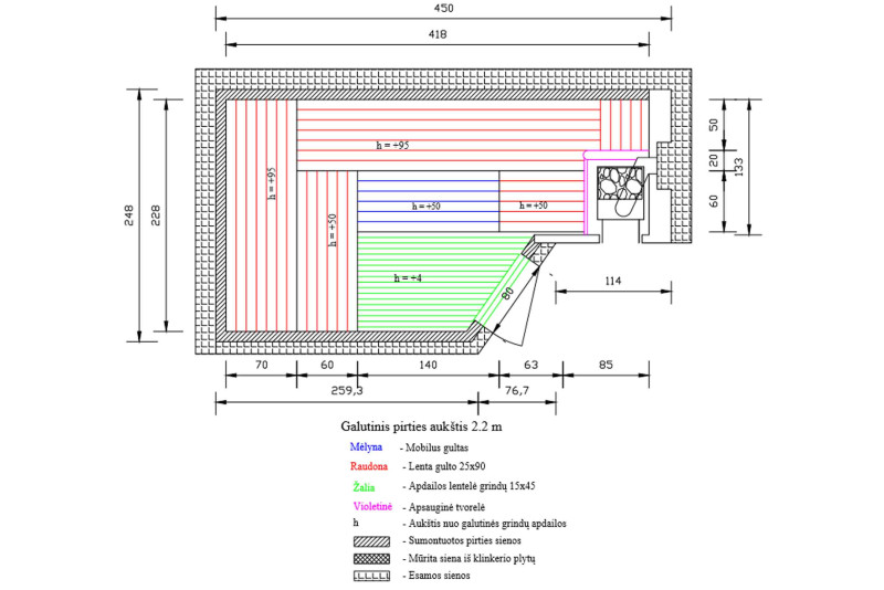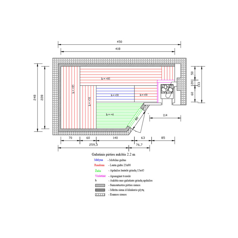 Placarea tavanului și a pereților - cel mai înalt tip de lemn de tei AB. Sidingul din tei are o capacitate termică scăzută, ceea ce contribuie la încălzirea rapidă a saunei. De asemenea, lemnul de tei contine o cantitate mare de uleiuri esentiale, lemnul emana un miros natural placut in sauna.