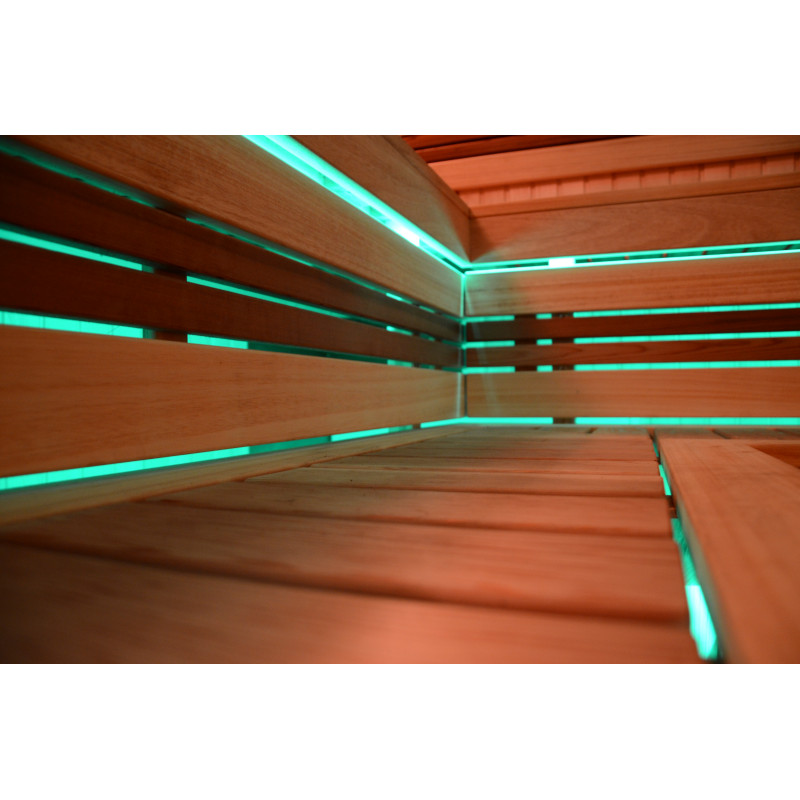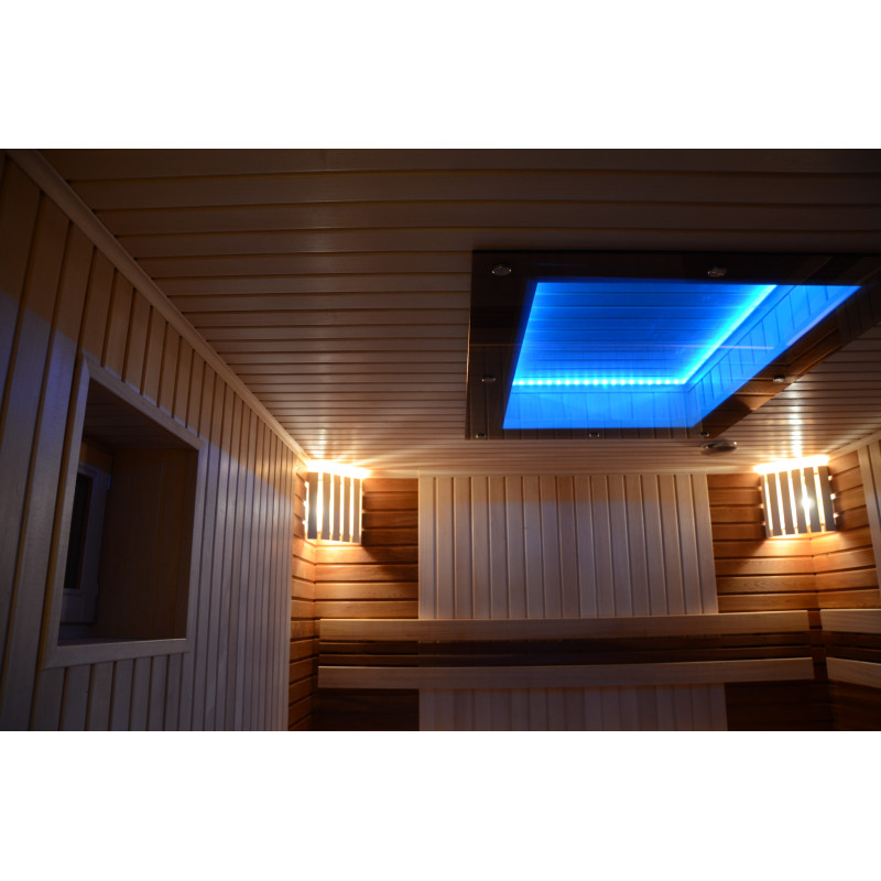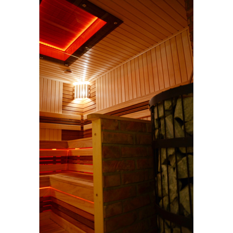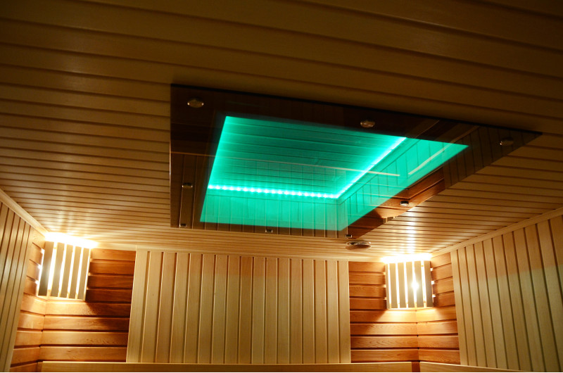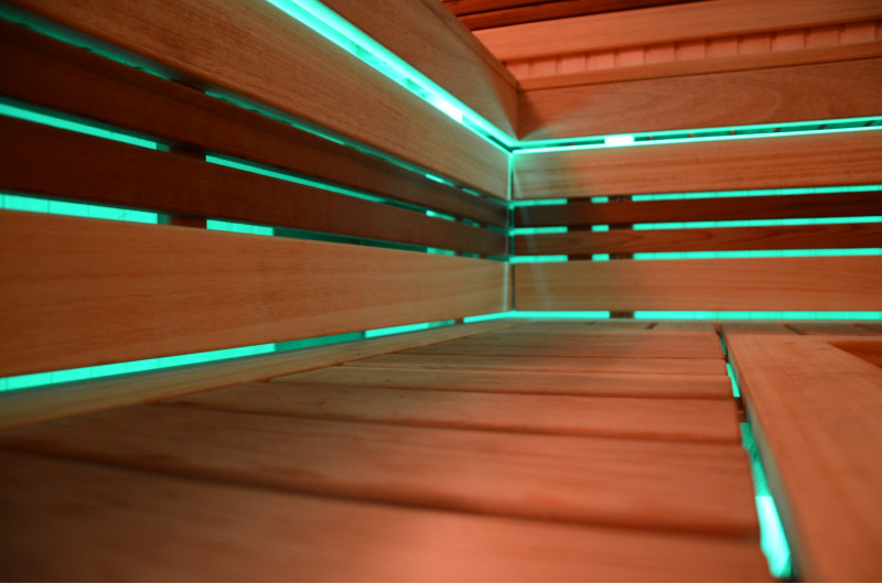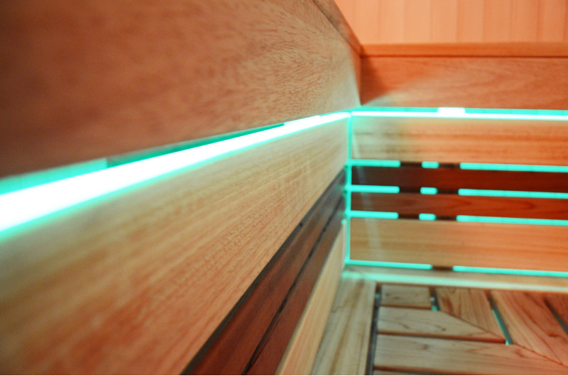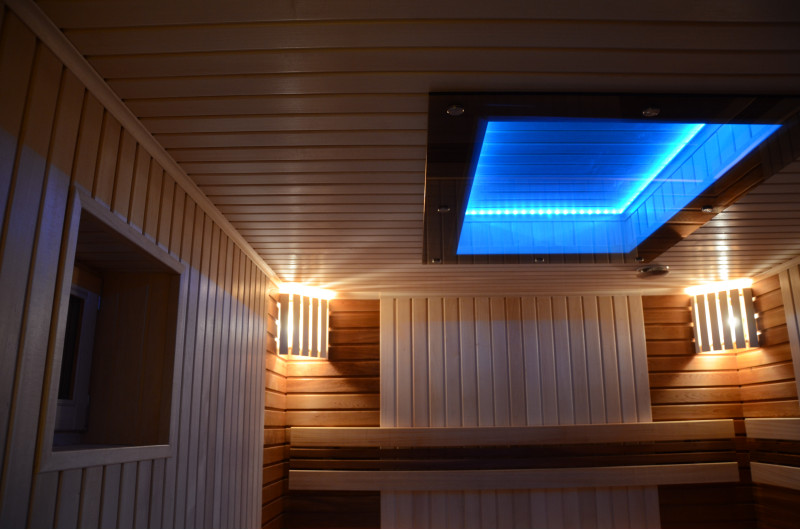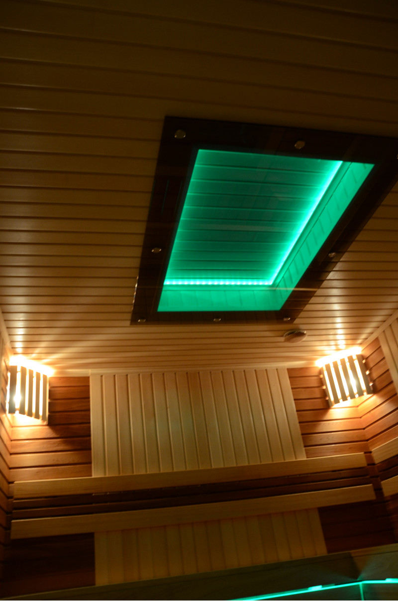 Pe tavan și sub bănci - iluminare color LED RGB, ale cărei culori pot fi schimbate pentru a crea atmosfera și starea de spirit potrivită. Iluminat de perete - lămpi cu LED alb de culoare caldă cu capace din lemn. Husele ajută la diminuarea luminii, adaugă mai multă confort saună. De asemenea, protejează corpurile de iluminat de apă, abur și căldură.