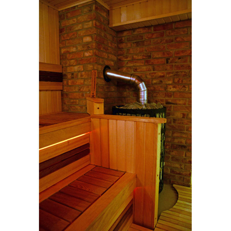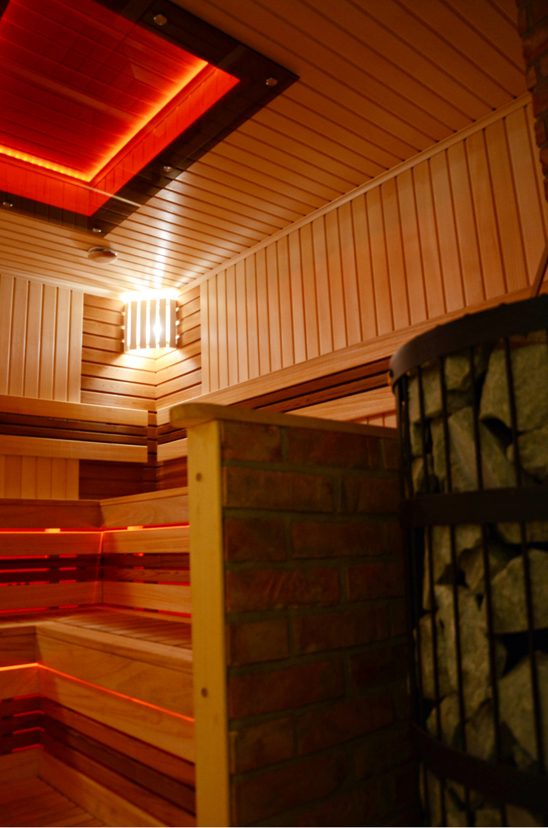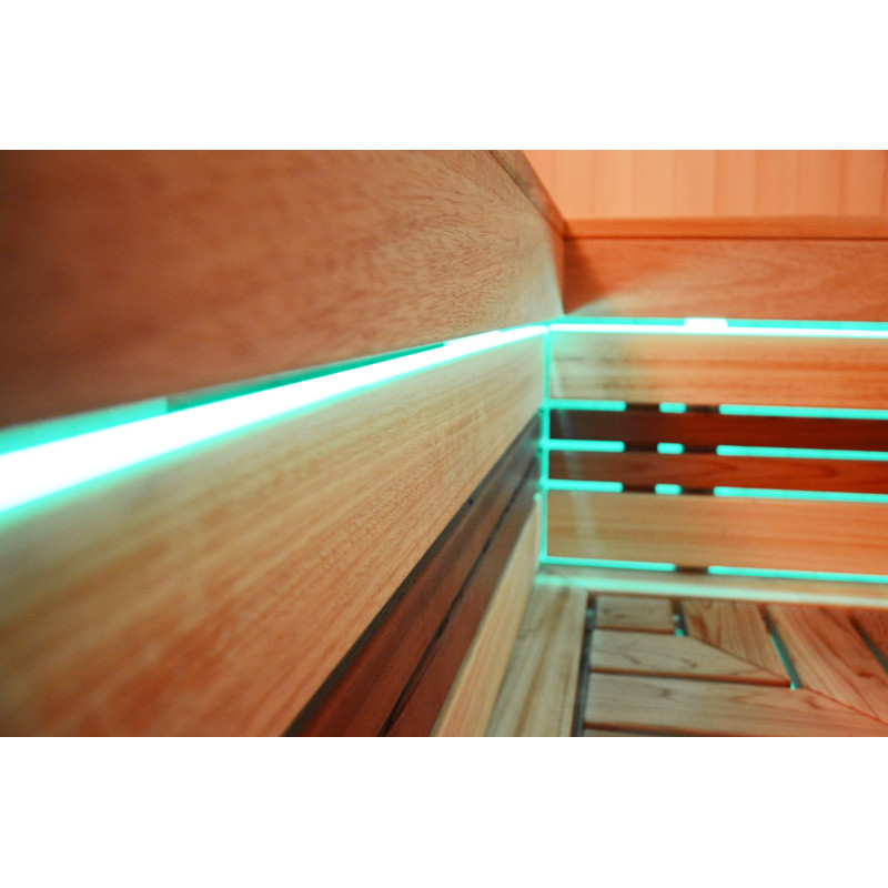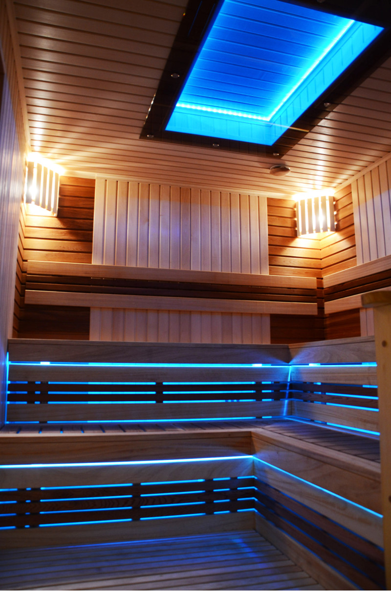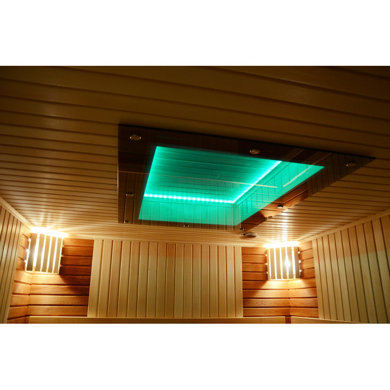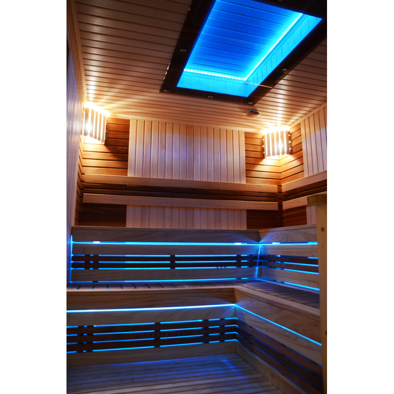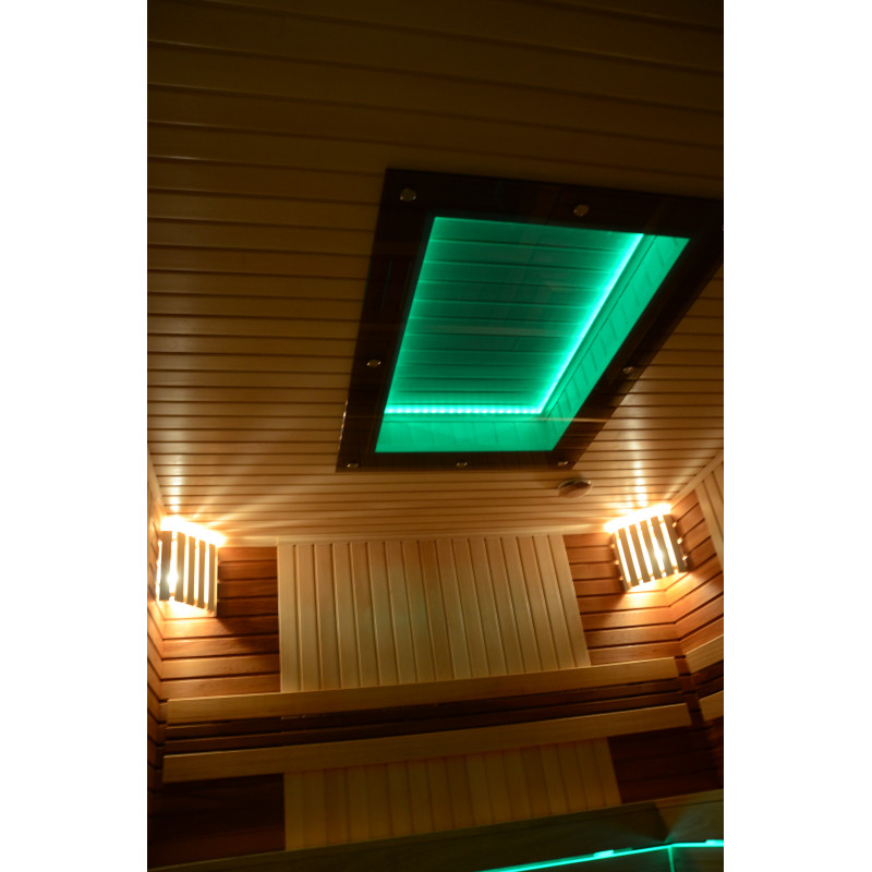 Pe tavan și sub bănci - iluminare color LED RGB, ale cărei culori pot fi schimbate pentru a crea atmosfera și starea de spirit potrivită. Iluminat de perete - lămpi cu LED alb de culoare caldă cu capace din lemn. Husele ajută la diminuarea luminii, adaugă mai multă confort saună. De asemenea, protejează corpurile de iluminat de apă, abur și căldură.