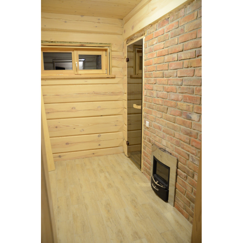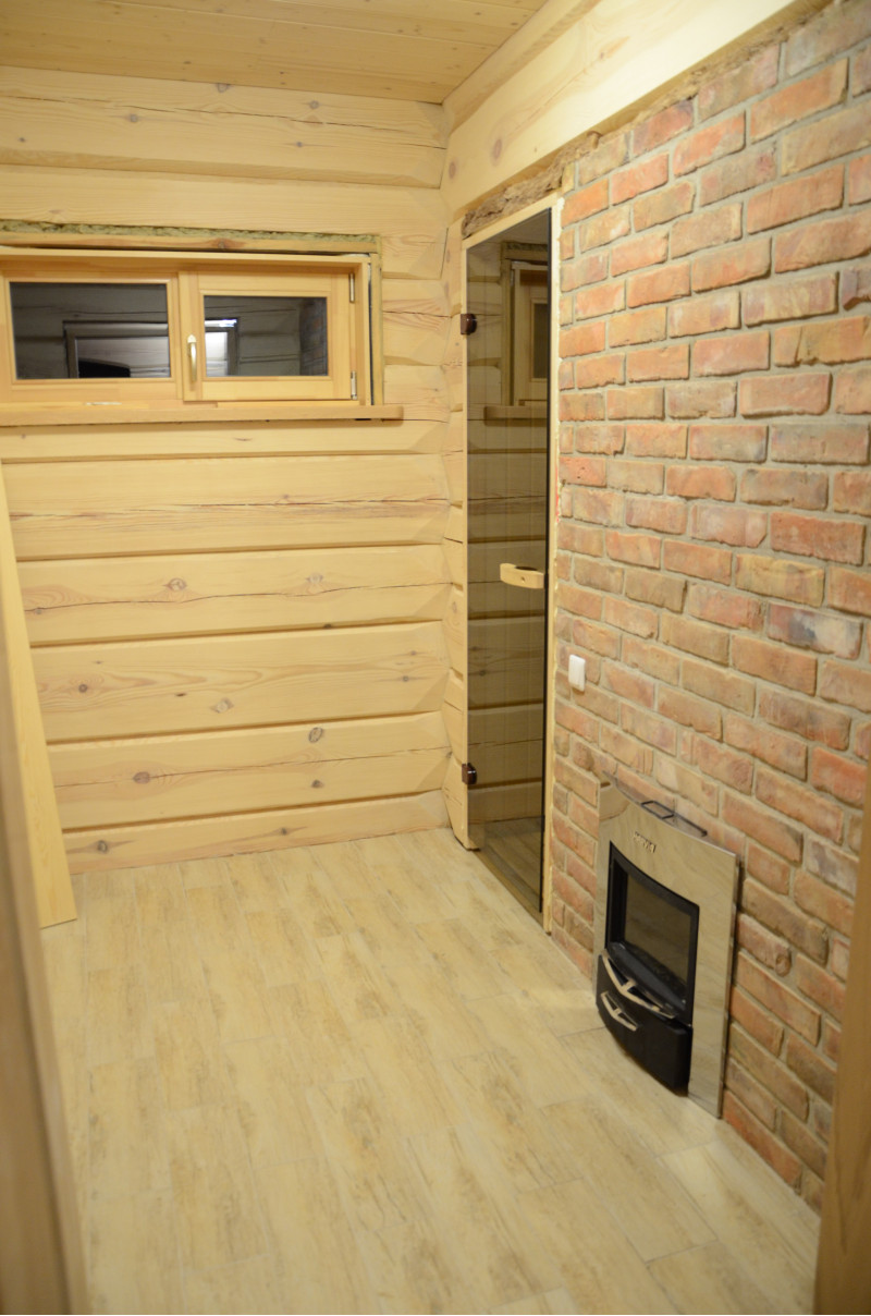 Pereții sunt decorați cu var și aspen ars cu lambriuri din lemn de cea mai bună calitate.