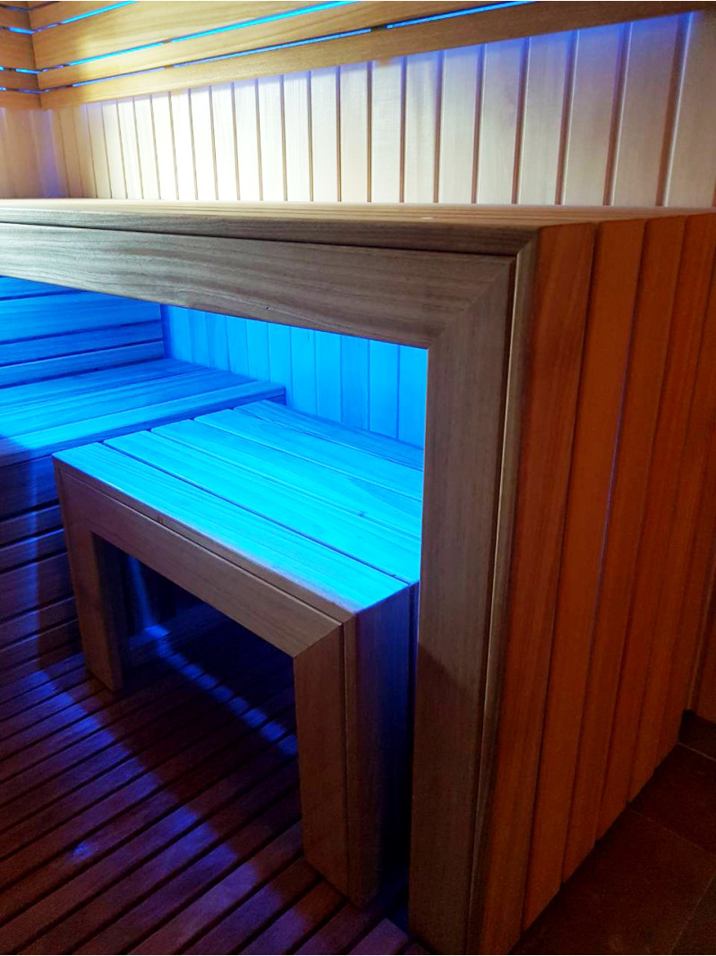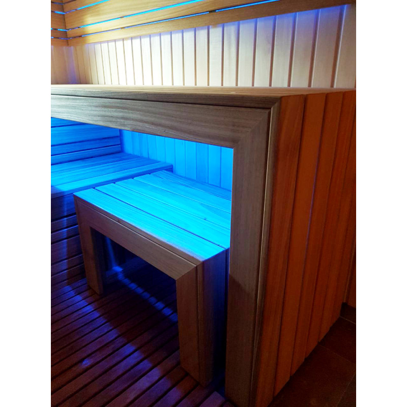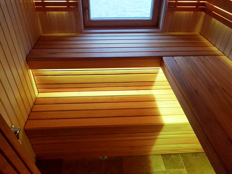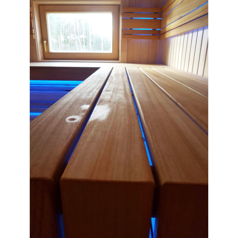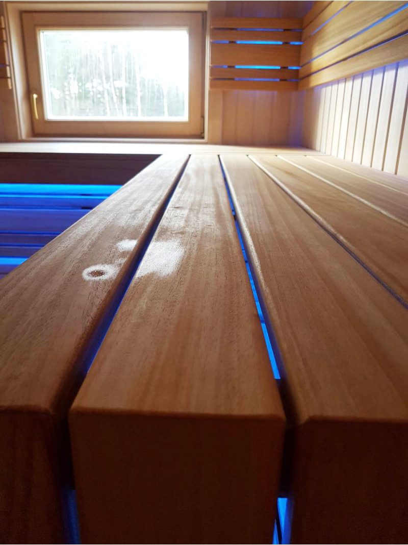 Detaliile interioare din lemn și băncile saunei sunt din lemn african de abachi. Datorită structurii sale, acest lemn este moale și foarte scăzut de căldură, ceea ce îl face foarte potrivit pentru instalarea băncilor de saună.