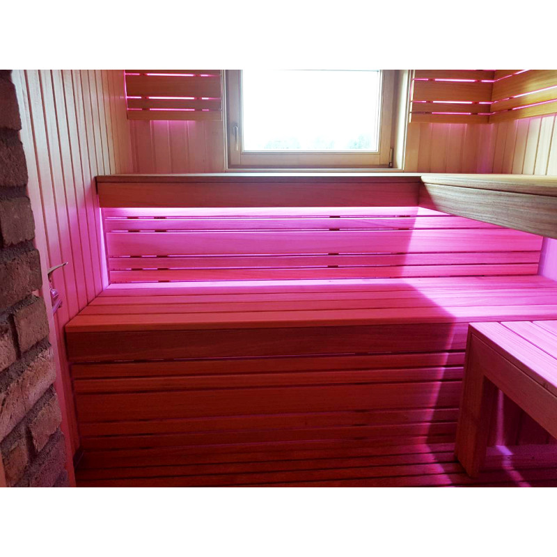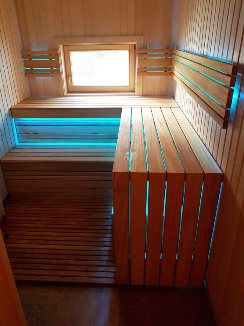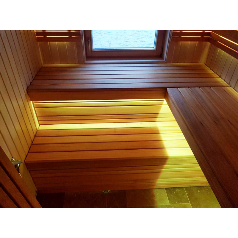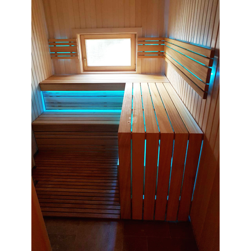 Detaliile interioare din lemn și băncile saunei sunt din lemn african de abachi. Datorită structurii sale, acest lemn este moale și foarte scăzut de căldură, ceea ce îl face foarte potrivit pentru instalarea băncilor de saună.