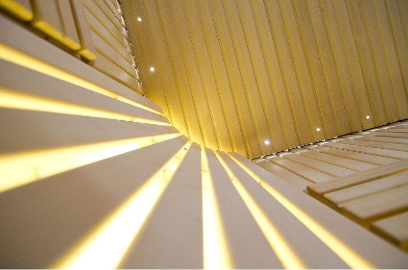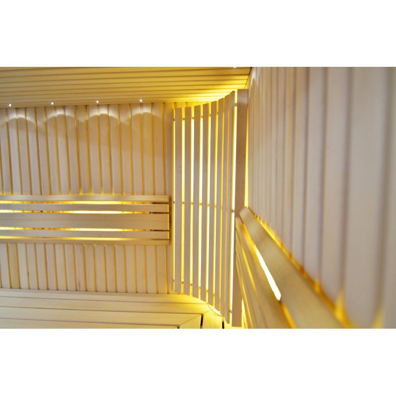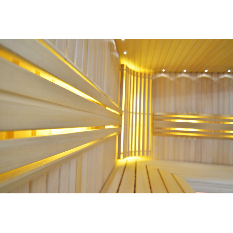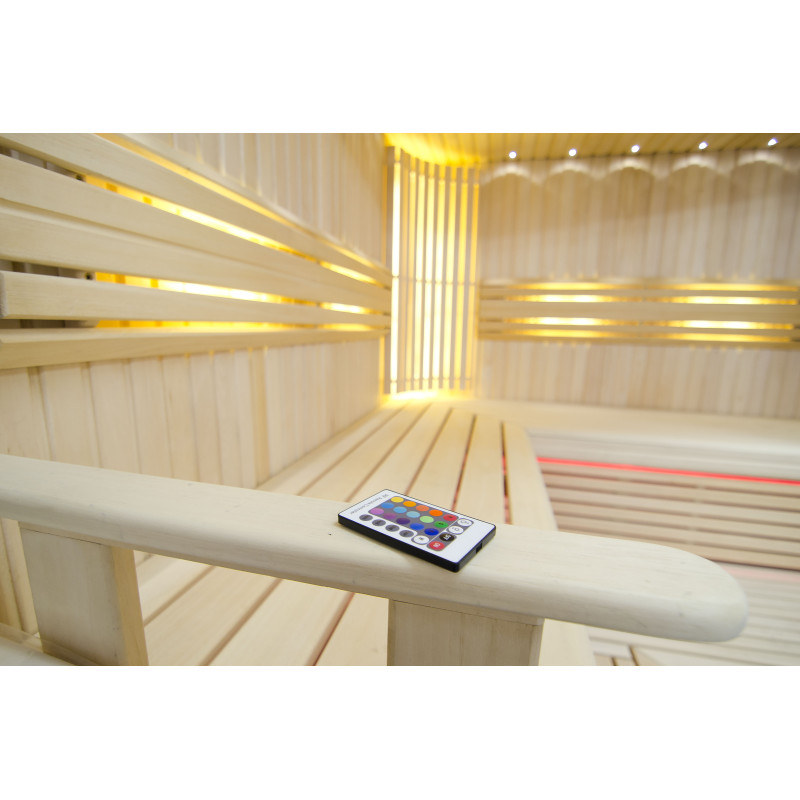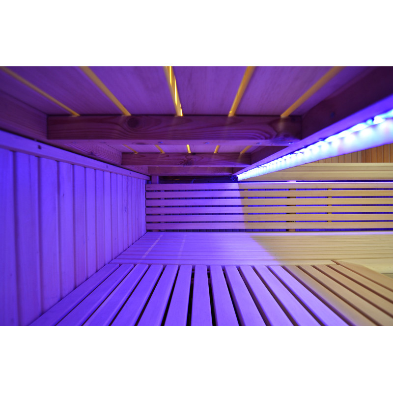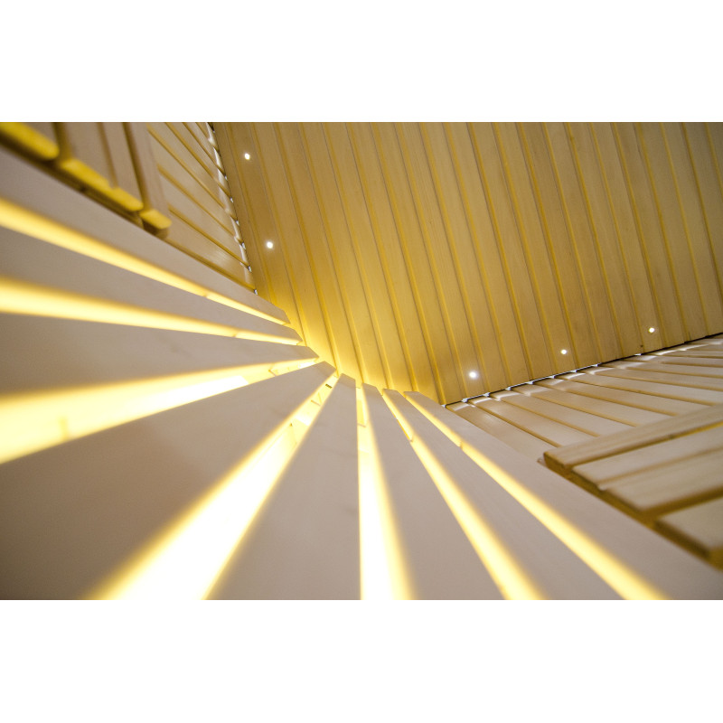 Tavanul este iluminat cu iluminare LED albă „lună” – o alternativă bună la iluminatul cu fibră optică. Pe pereții de sub spătare - iluminare caldă LED albă, care accentuează perfect textura lemnului. Sub bănci - iluminare color LED RGB ale cărei culori le puteți controla cu ușurință cu telecomanda pentru a crea atmosfera dorită a saunei.