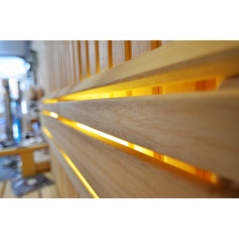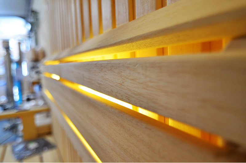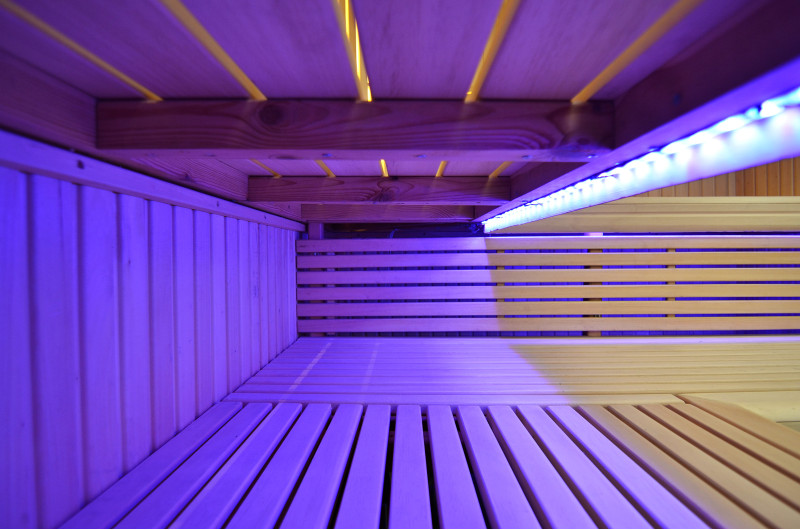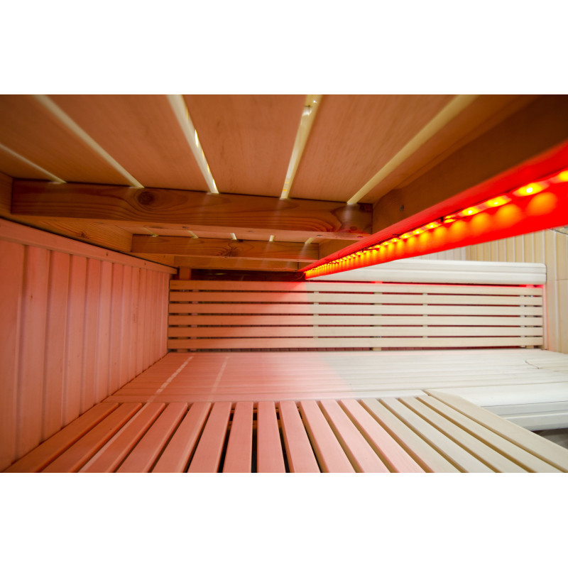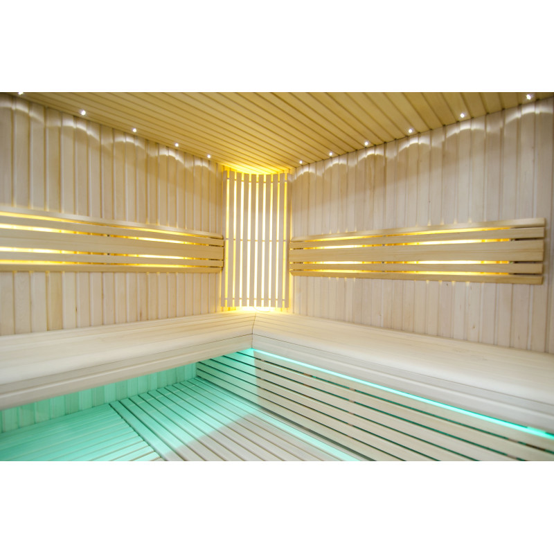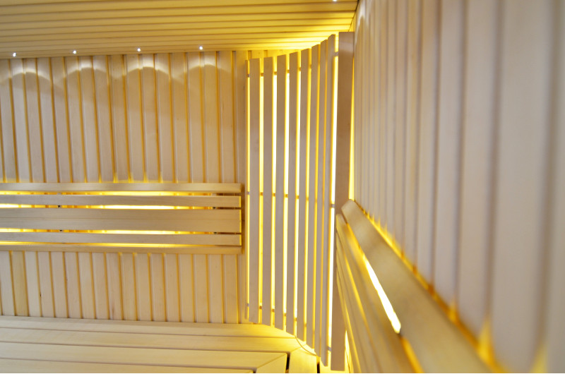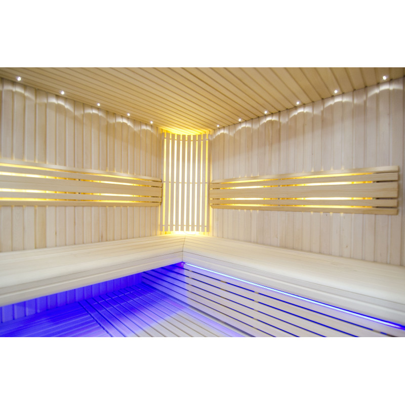 Tavanul este iluminat cu iluminare LED albă „lună” – o alternativă bună la iluminatul cu fibră optică. Pe pereții de sub spătare - iluminare caldă LED albă, care accentuează perfect textura lemnului. Sub bănci - iluminare color LED RGB ale cărei culori le puteți controla cu ușurință cu telecomanda pentru a crea atmosfera dorită a saunei.