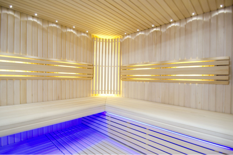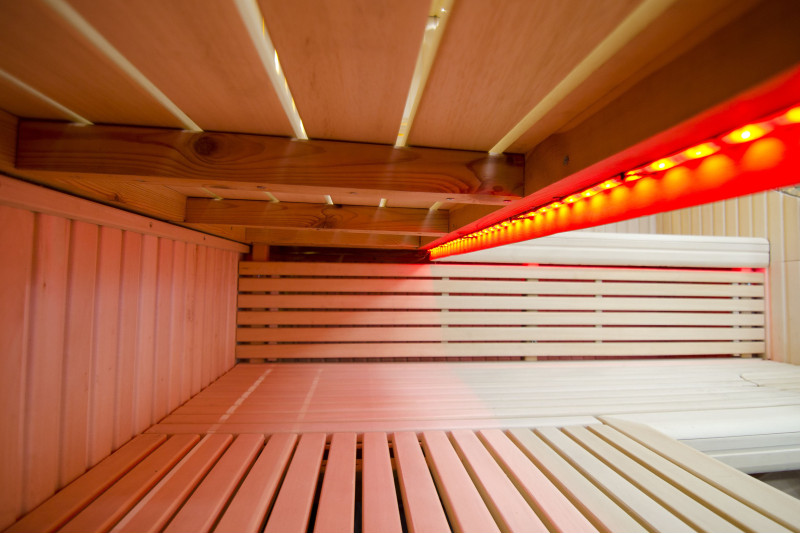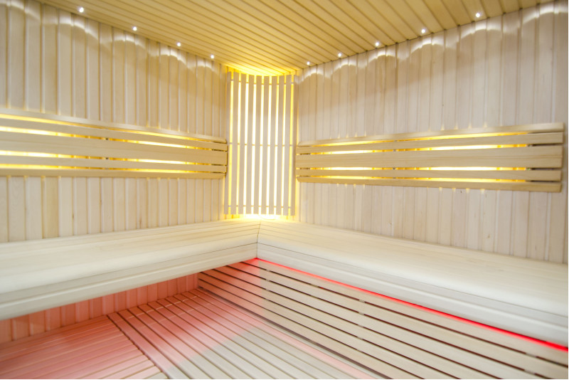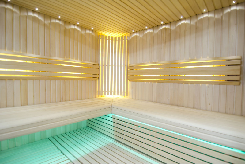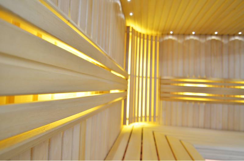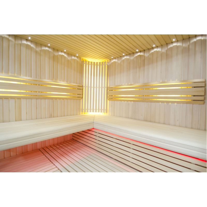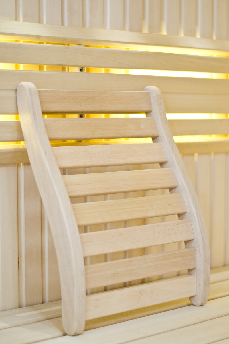 Pereții sunt din lemn de tei ușor de cea mai bună calitate, iar băncile și spătarele sunt din lemn african de abachi, care nu se încălzește foarte mult, făcându-l deosebit de plăcut și confortabil de așezat pe el.
