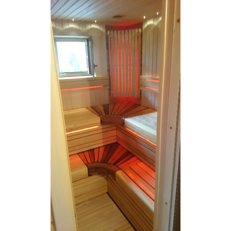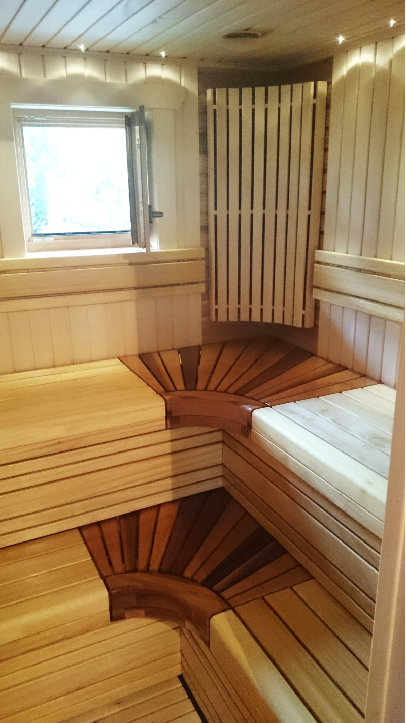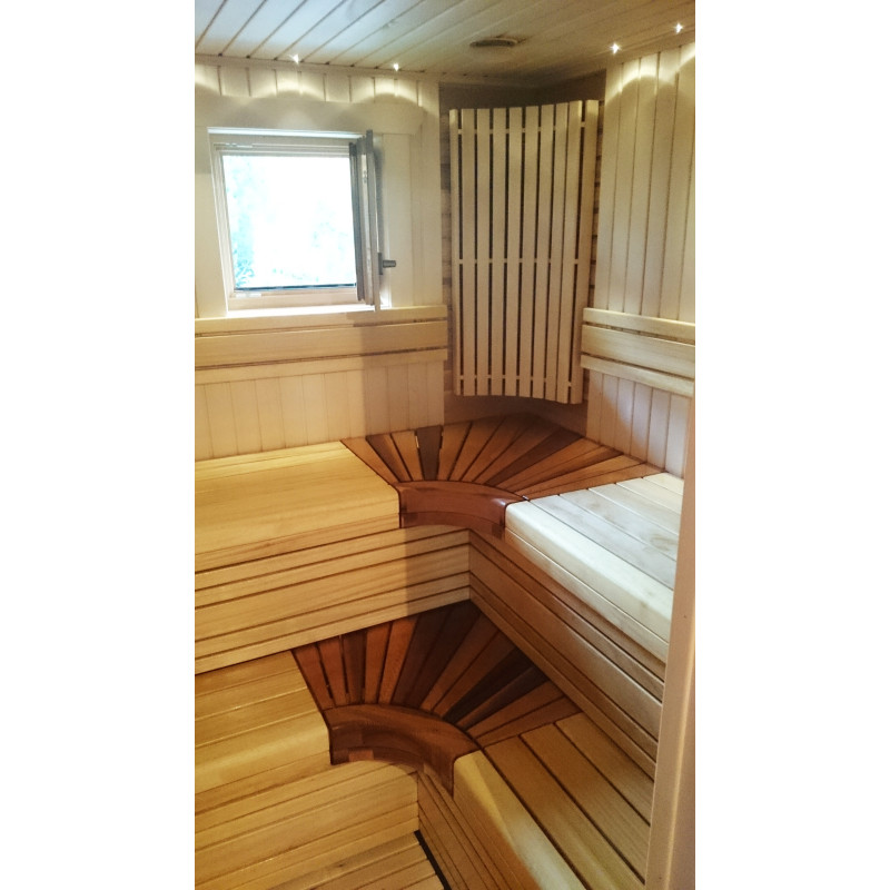 Interiorul saunei este realizat din lemn de tei si cedru de cea mai buna calitate, bancile sunt din lemn de abachi si cedru. Acest lemn este cel mai potrivit pentru bănci, deoarece se încălzește puțin, este sigur și plăcut să atingeți un astfel de lemn.