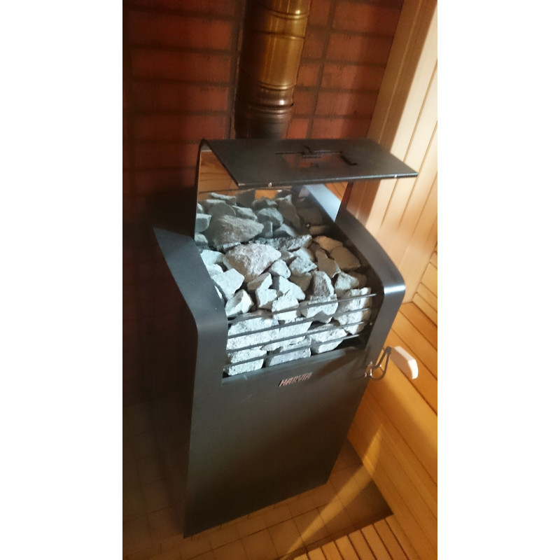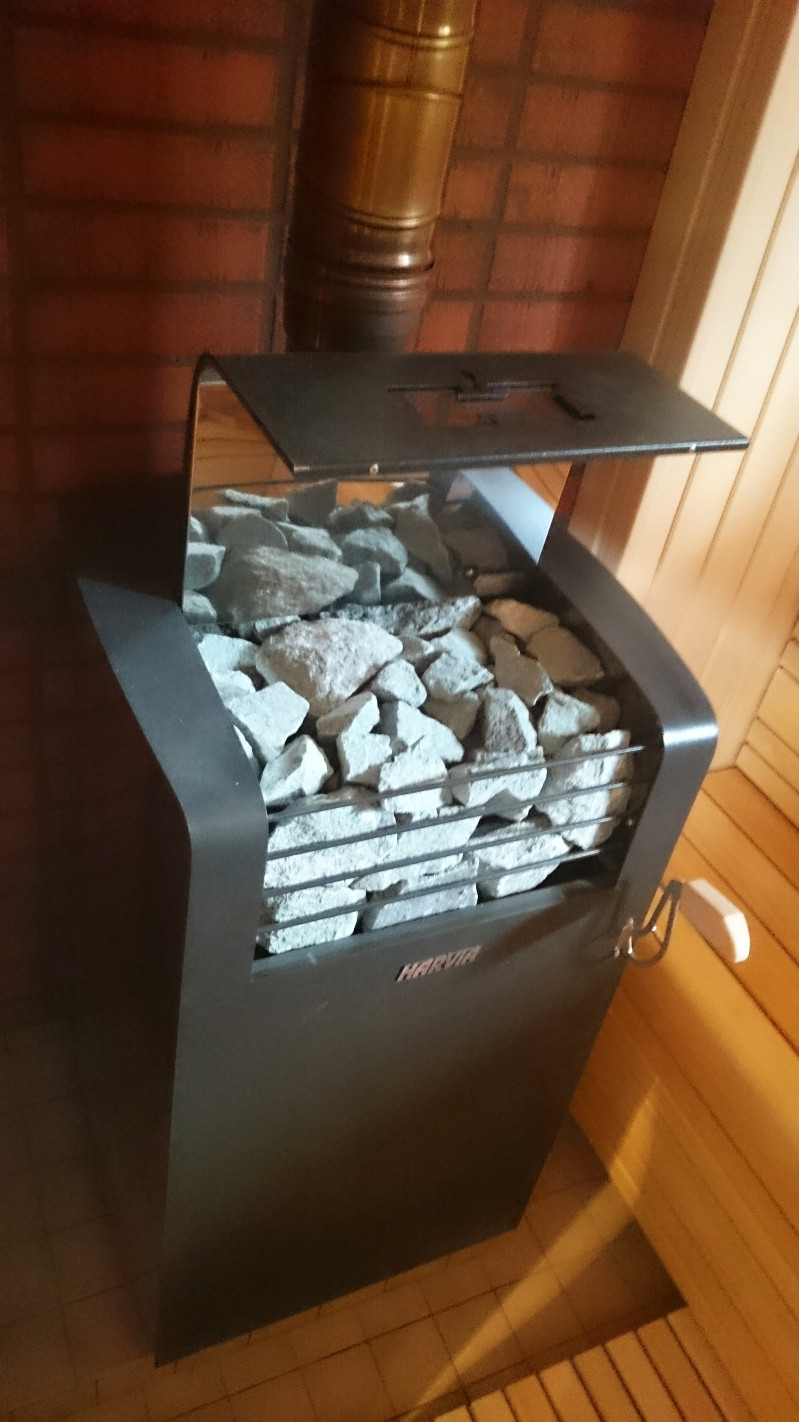 Este prevăzută ventilație pentru a asigura o circulație adecvată a aerului în saună și este instalat un coș de fum cu încălzitor. Modelul de încălzire este de tip închis, care acumulează căldură și dă mult abur. În timpul încălzirii, capacul este închis, turnând apă pe pietre - se deschide.
