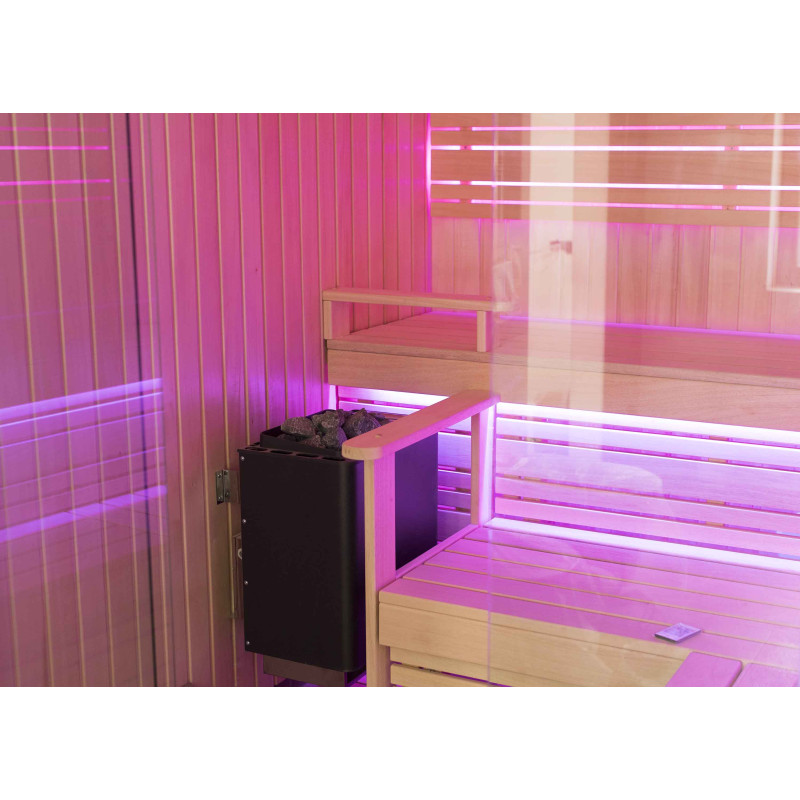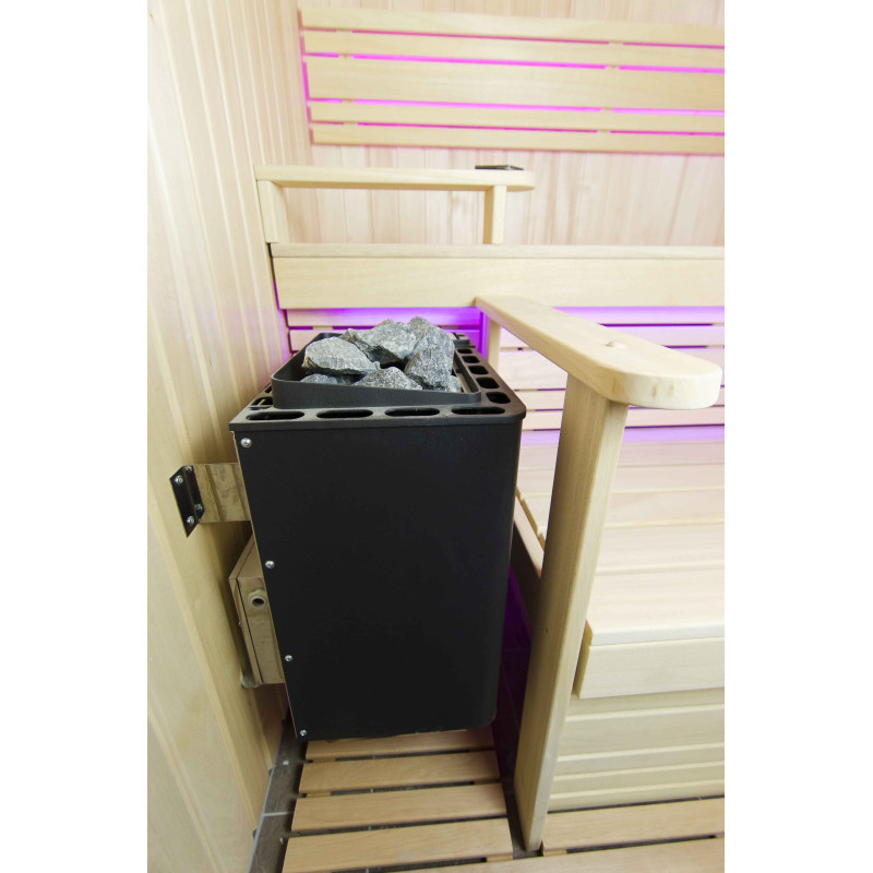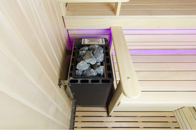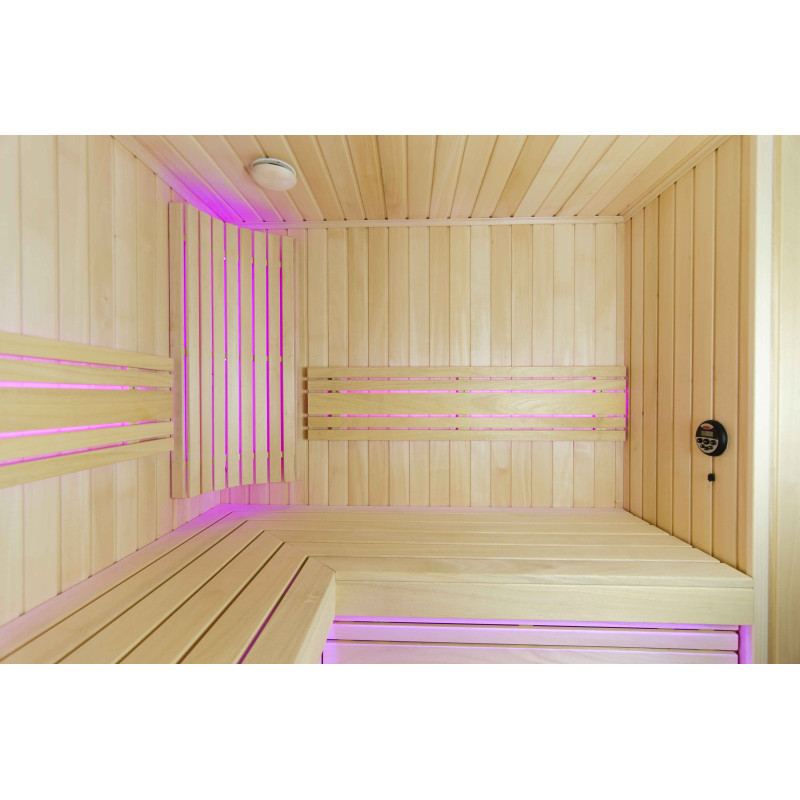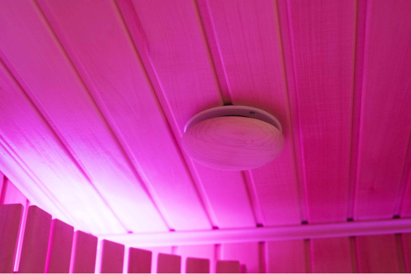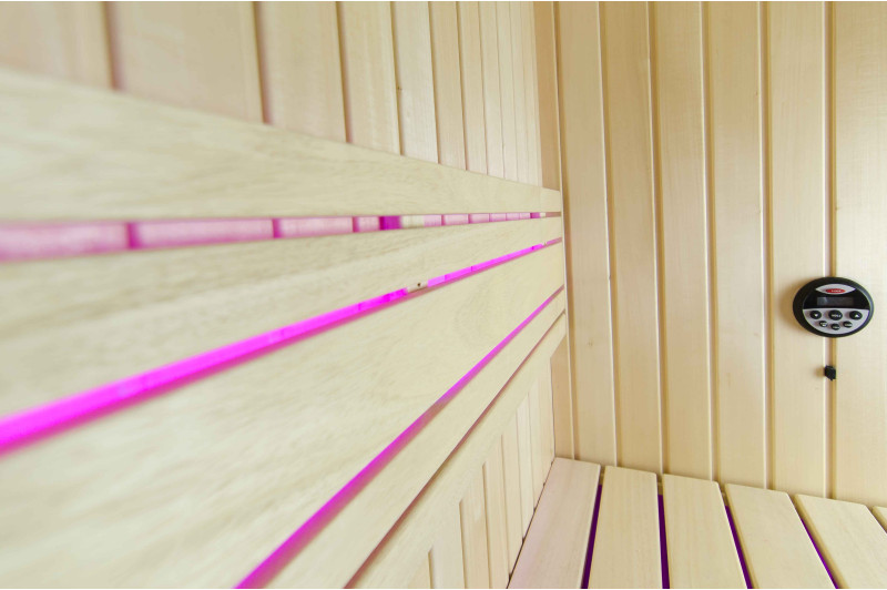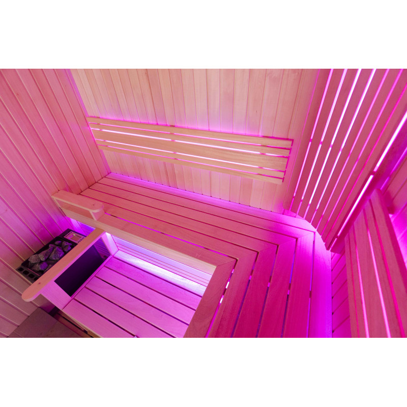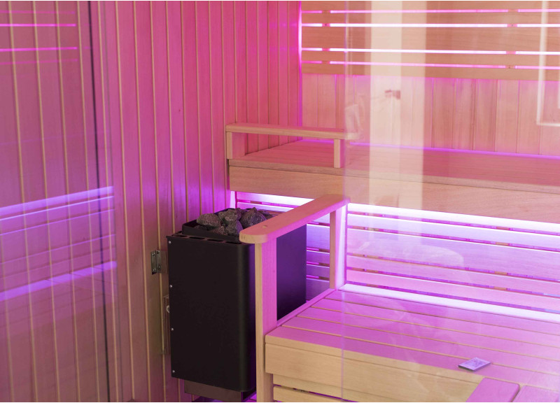 Interiorul saunei este realizat din lemn de tei de cea mai înaltă calitate, șezlongurile sunt din lemn abachi - fără încălzire și perfect pentru saună.
