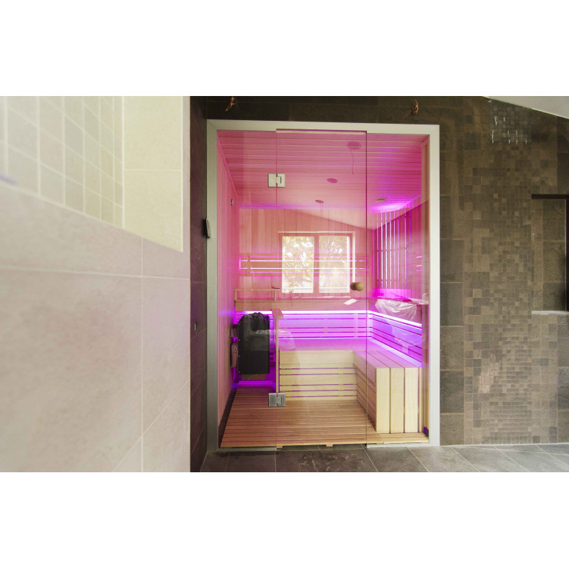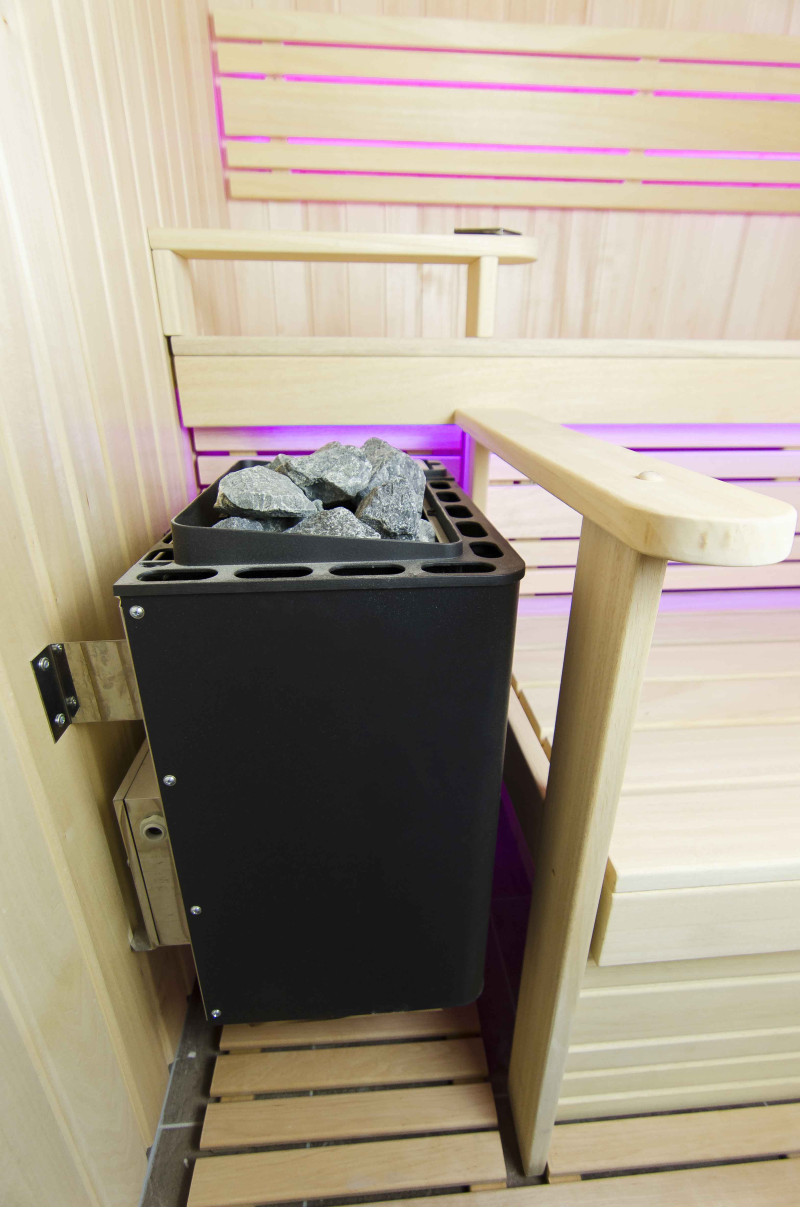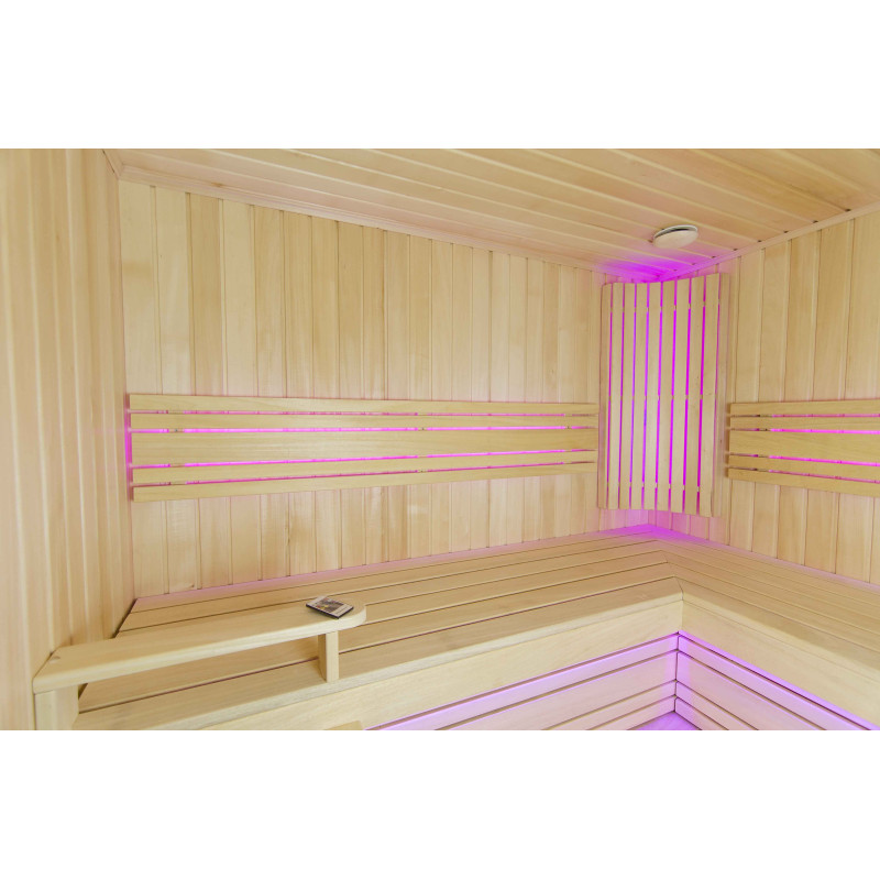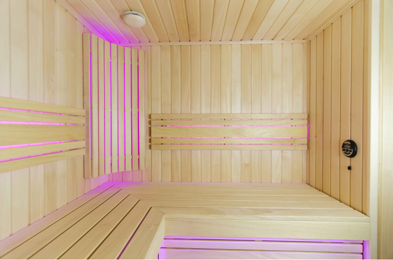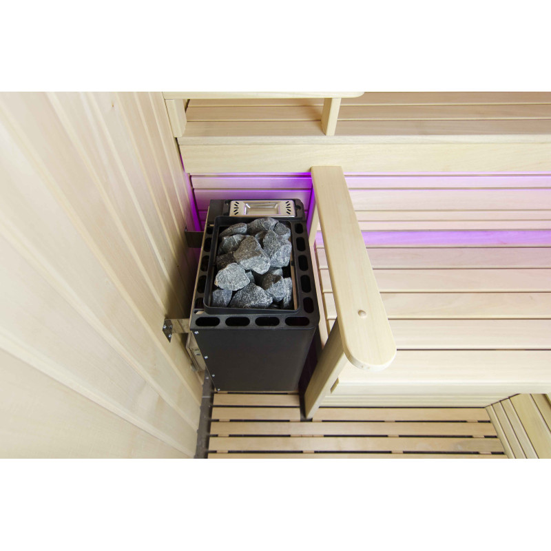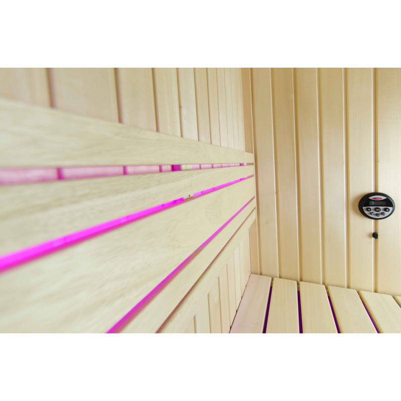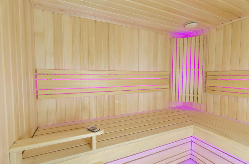 Interiorul saunei este realizat din lemn de tei de cea mai înaltă calitate, șezlongurile sunt din lemn abachi - fără încălzire și perfect pentru saună.