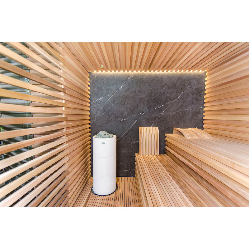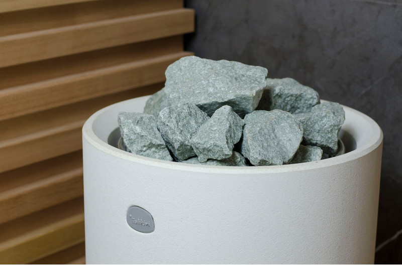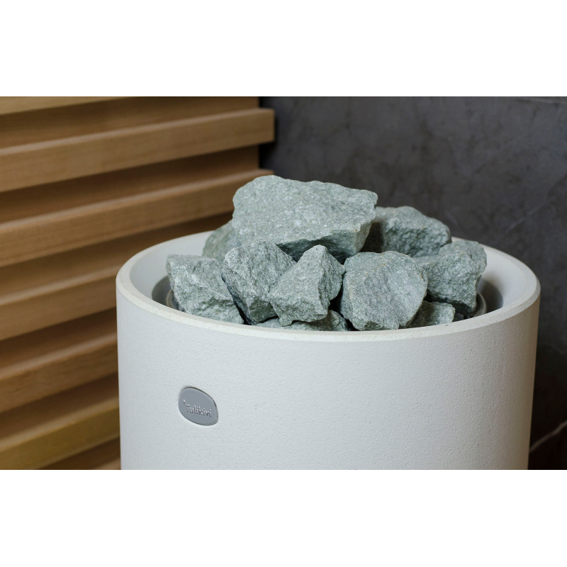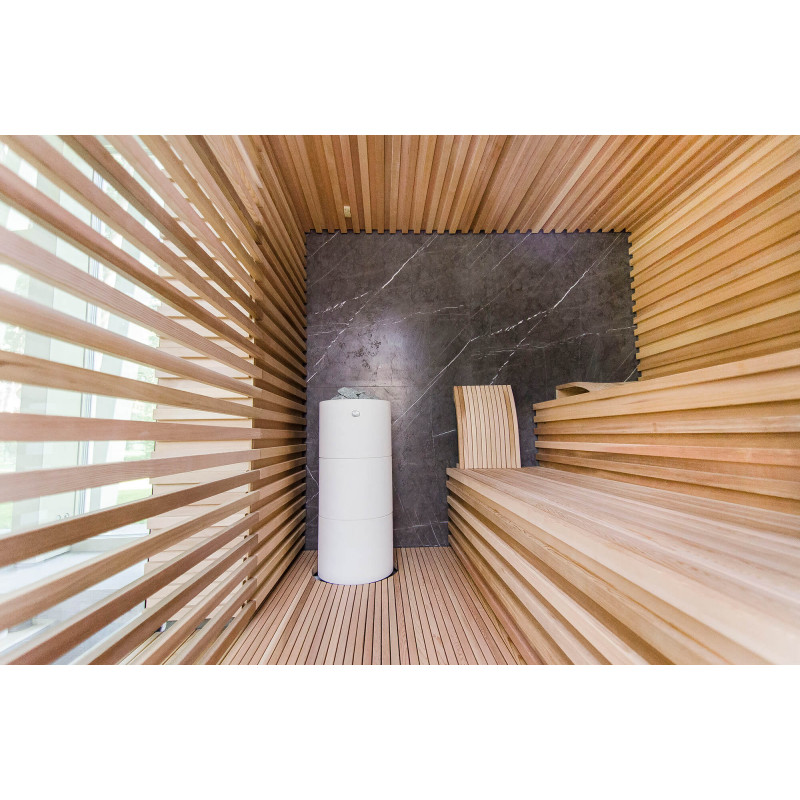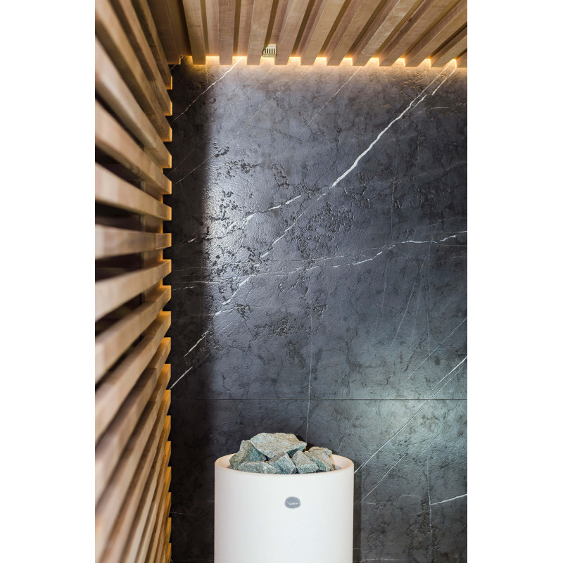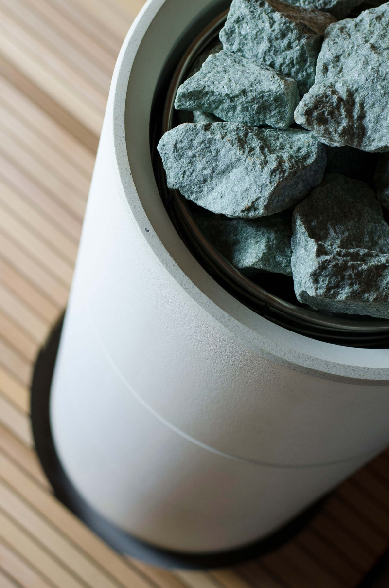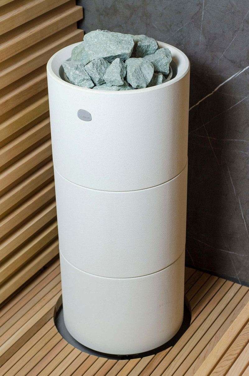 Sursa de căldură este încălzitorul Tulikivi Kuura White, umplut cu pietre de jadeit. Când pietrele de jadeit sunt încălzite, proprietățile sale vindecătoare sunt îmbunătățite. Turnarea pietrelor cu apă în saună răspândește un miros plăcut de mediu curat, făcându-l ușor de respirat. În încălzitor a fost introdusă o conductă de abur de la generatorul de abur al saunei cu abur, ceea ce permite obținerea unei umidități mult mai mari în camera de saună. Aceasta este o alegere excelentă dacă nu aveți condițiile pentru a instala o baie de aburi și o saună. Un sistem de control comun este un monitor LED staționar mare. Toate echipamentele sunt, de asemenea, controlate de un dispozitiv inteligent de oriunde în lume.