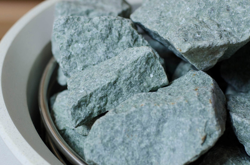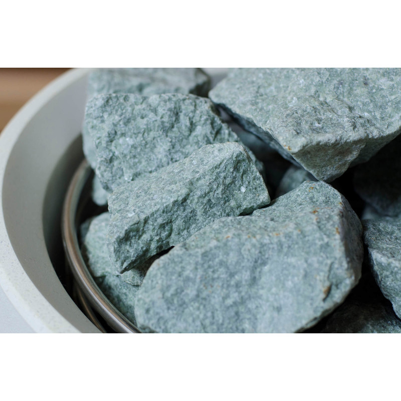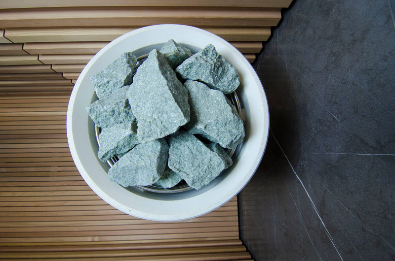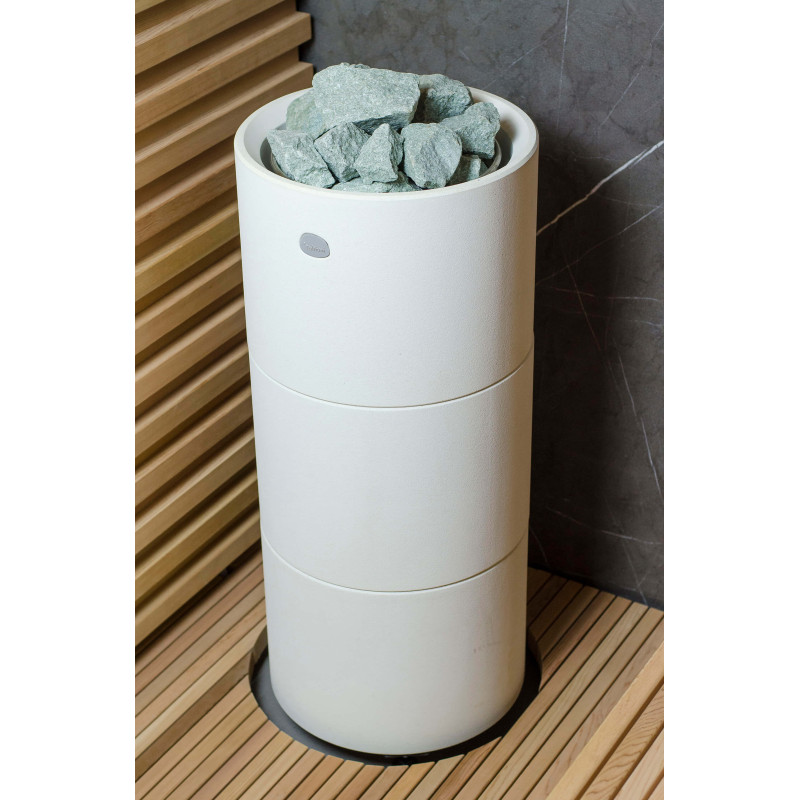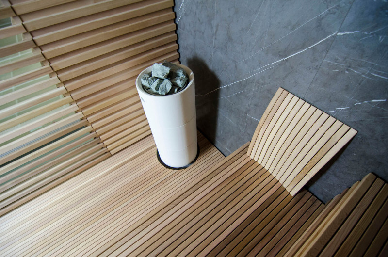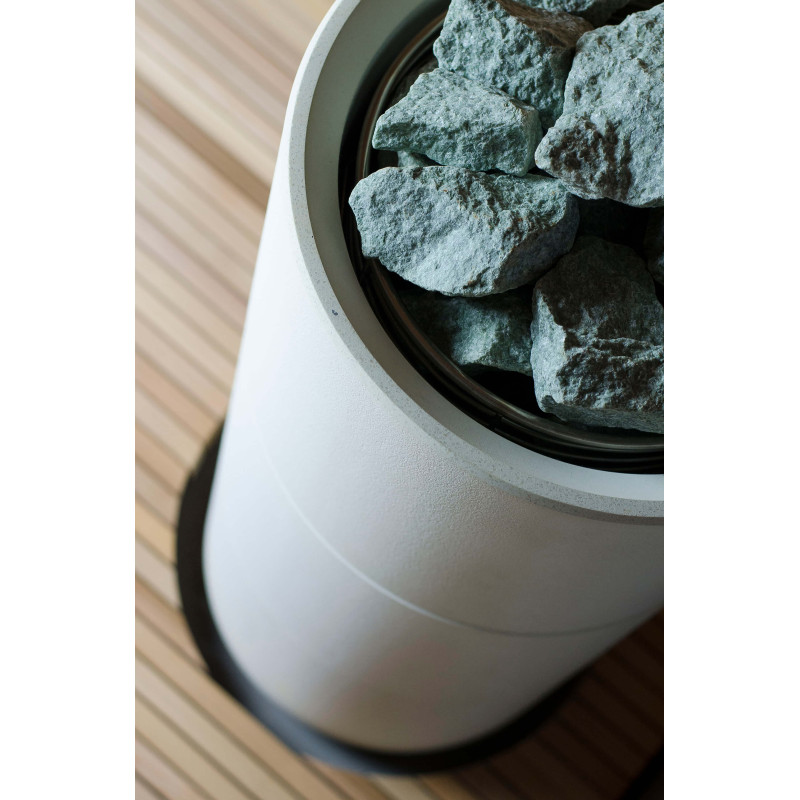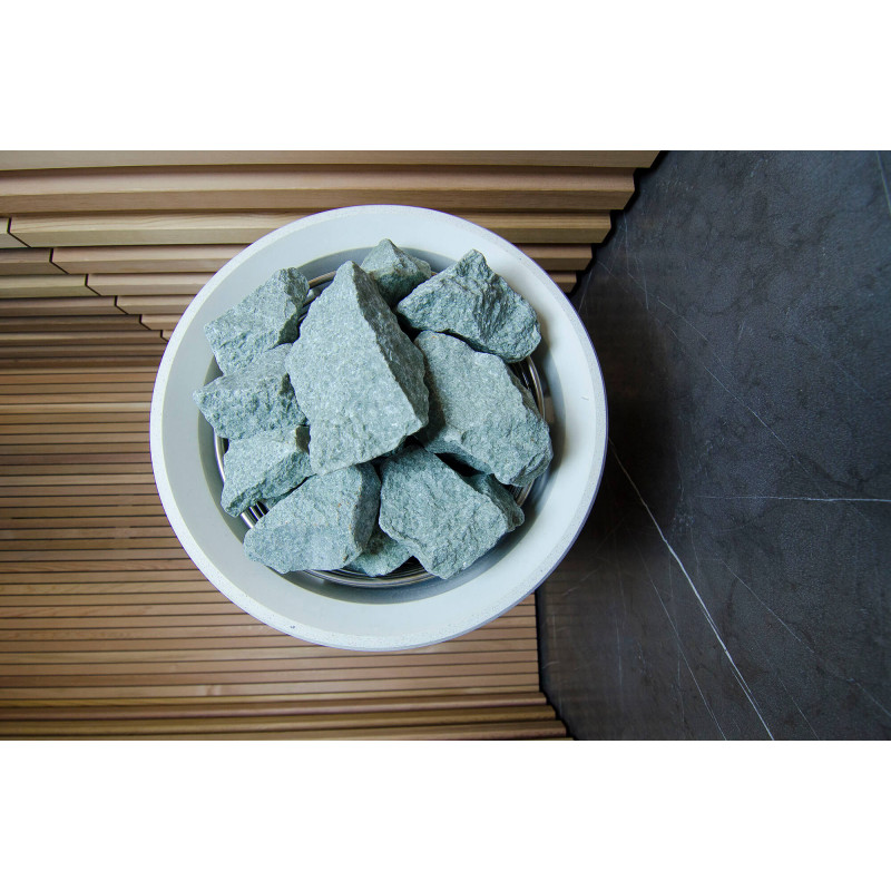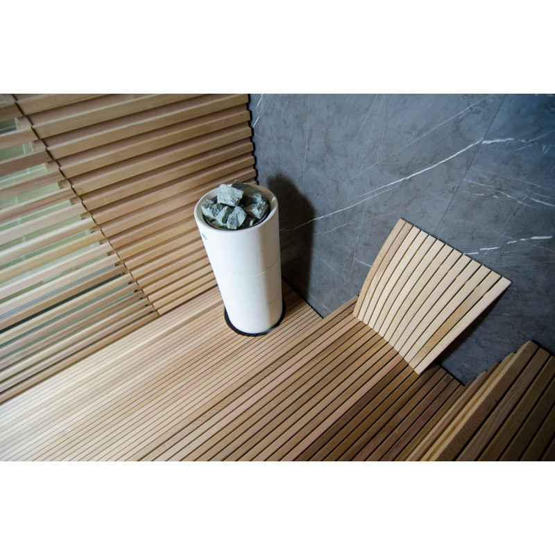 Sursa de căldură este încălzitorul Tulikivi Kuura White, umplut cu pietre de jadeit. Când pietrele de jadeit sunt încălzite, proprietățile sale vindecătoare sunt îmbunătățite. Turnarea pietrelor cu apă în saună răspândește un miros plăcut de mediu curat, făcându-l ușor de respirat. În încălzitor a fost introdusă o conductă de abur de la generatorul de abur al saunei cu abur, ceea ce permite obținerea unei umidități mult mai mari în camera de saună. Aceasta este o alegere excelentă dacă nu aveți condițiile pentru a instala o baie de aburi și o saună. Un sistem de control comun este un monitor LED staționar mare. Toate echipamentele sunt, de asemenea, controlate de un dispozitiv inteligent de oriunde în lume.