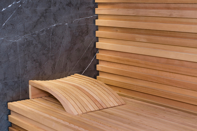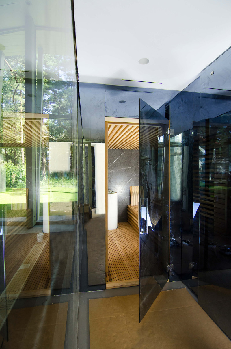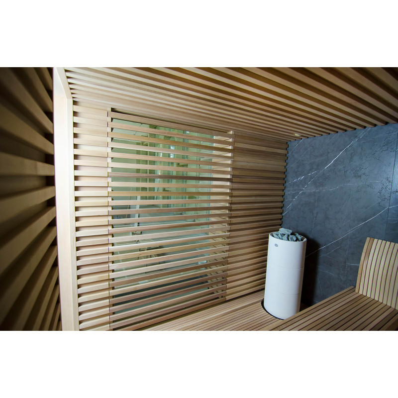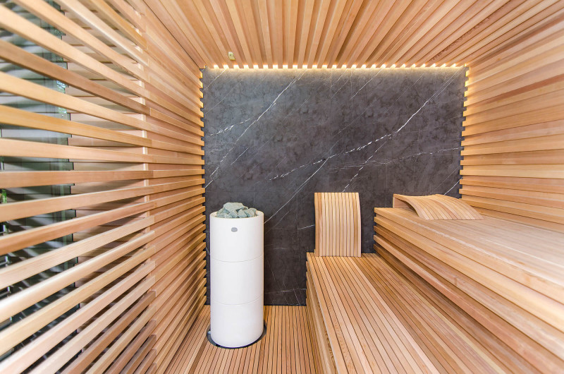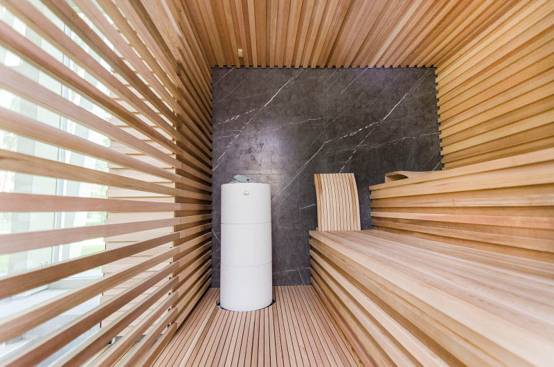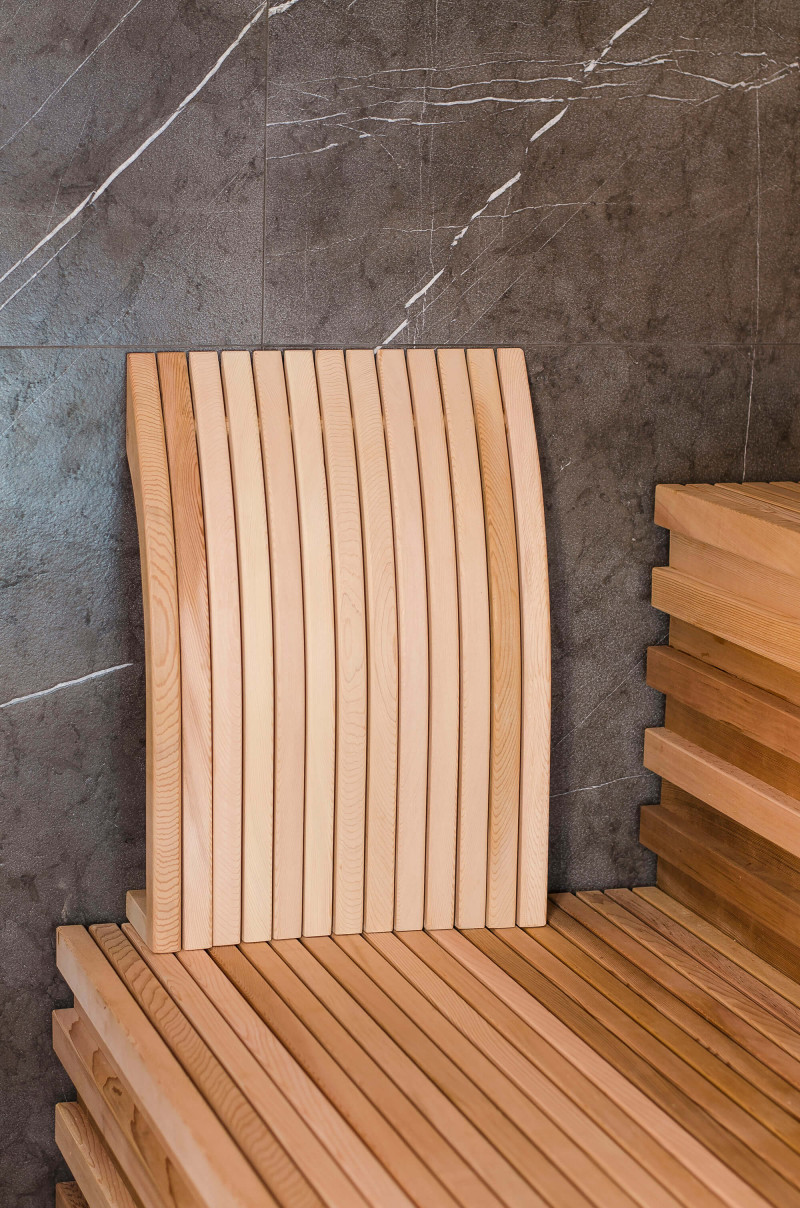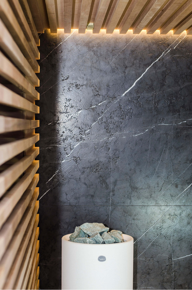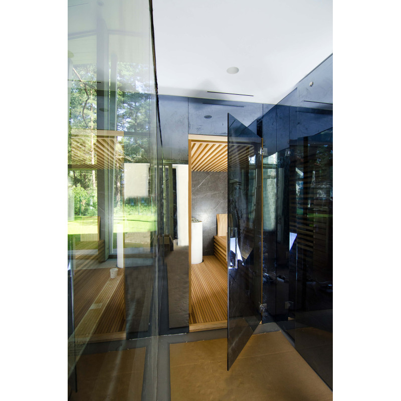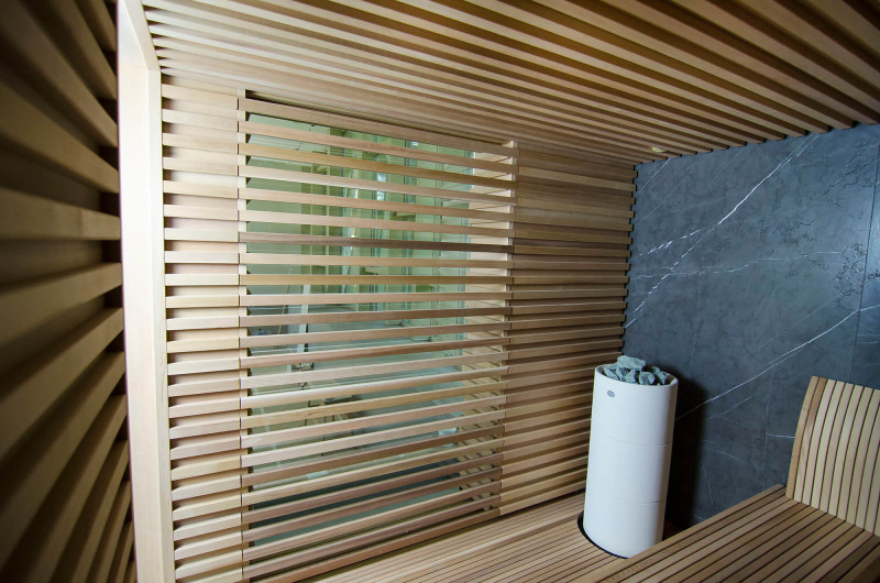 Decorul peretelui din spate al saunei este din marmură italiană de design exclusiv, a cărei frumusețe este subliniată de iluminatul LED instalat în jurul acesteia. Decorul peretelui lateral al saunei este o fereastră de vitrină din sticlă, care este acoperită cu un grilaj ajurat detașabil. Sauna are vedere la zona de spa, o zonă mare de piscină. Iluminarea pereților și a tavanului saunei este o bandă LED ermetică alb cald. Usi din sticla fara rama.
