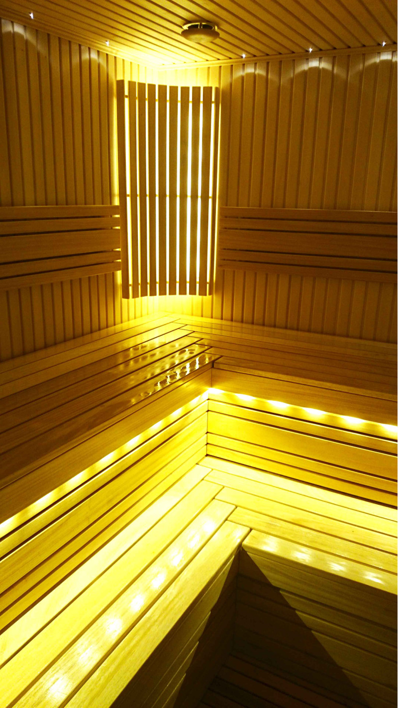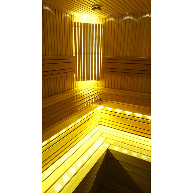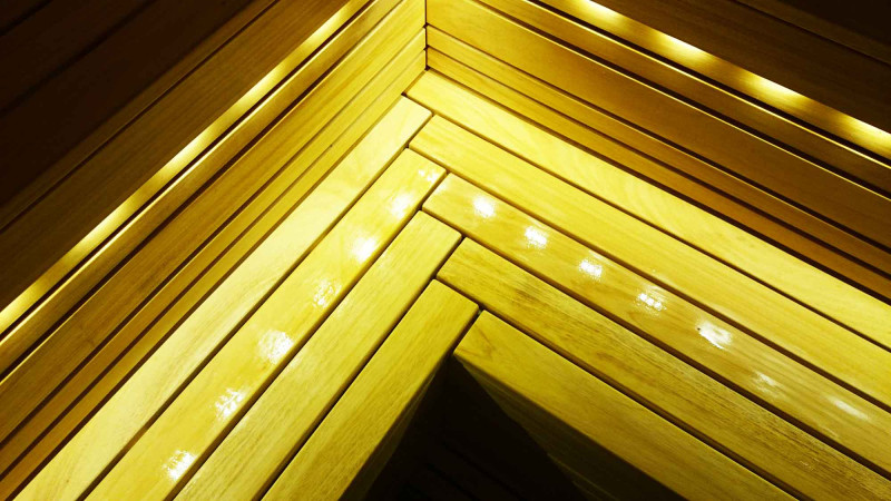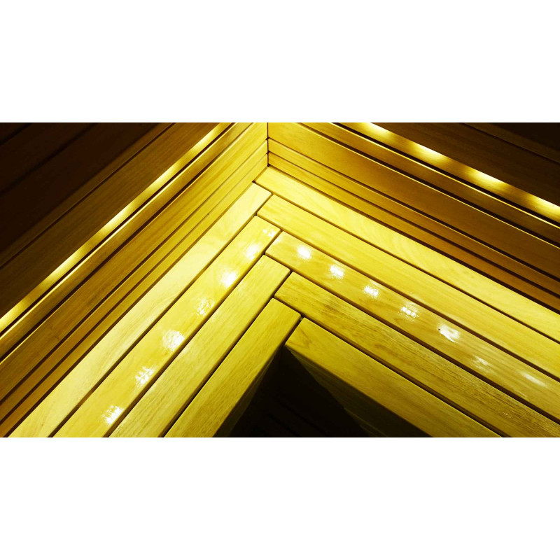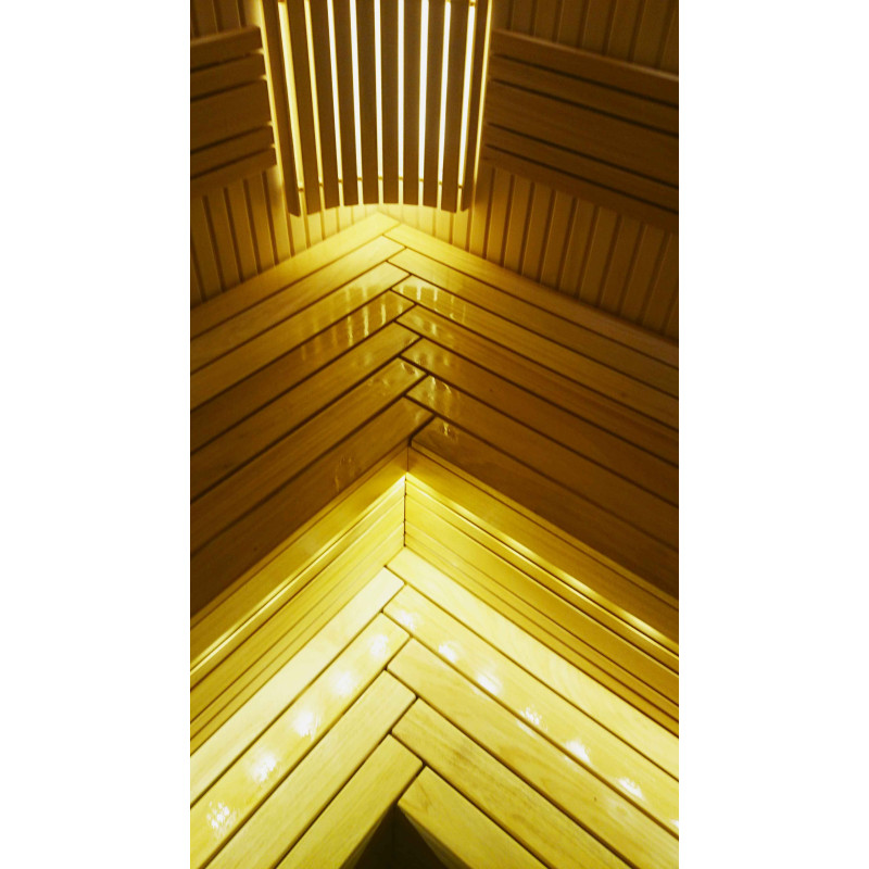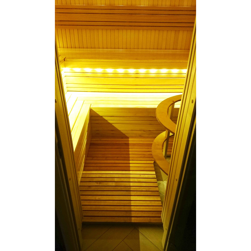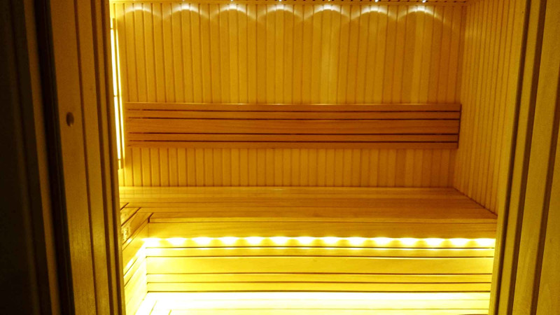 Accentul principal al saunei este iluminatul modern și luminos cu LED-uri sub bănci, o lampă sub spătarul colțului și lămpi LED separate care iluminează tavanul.