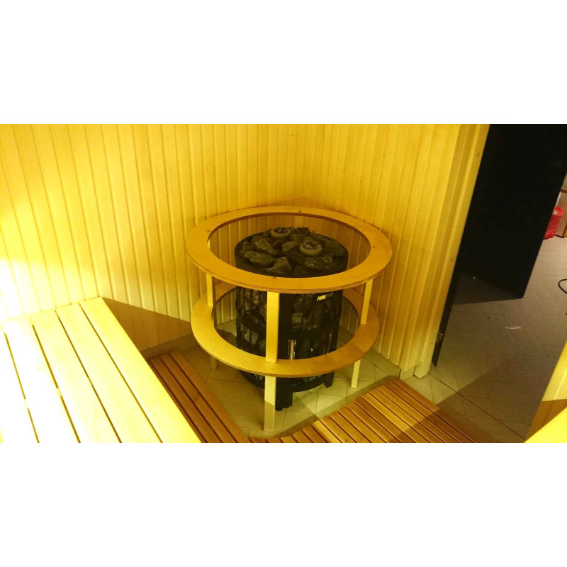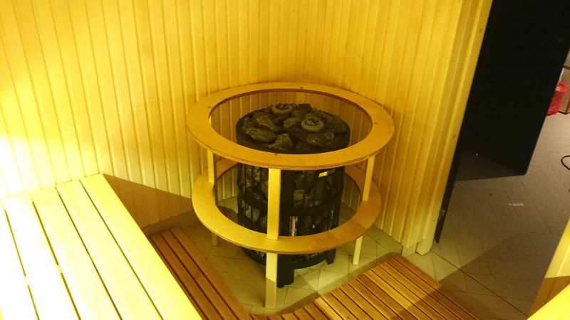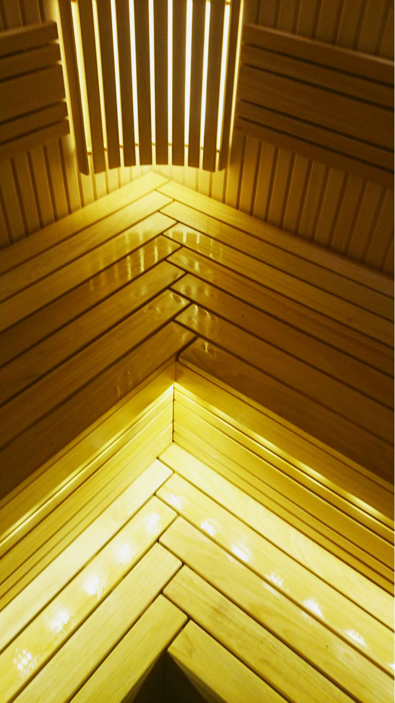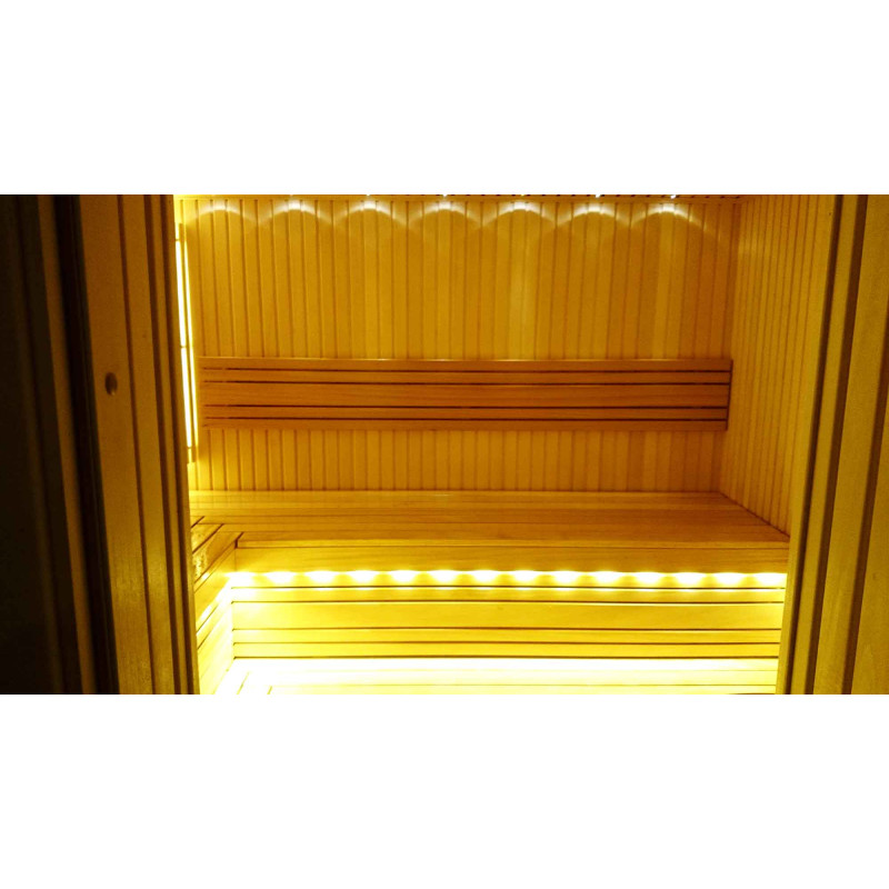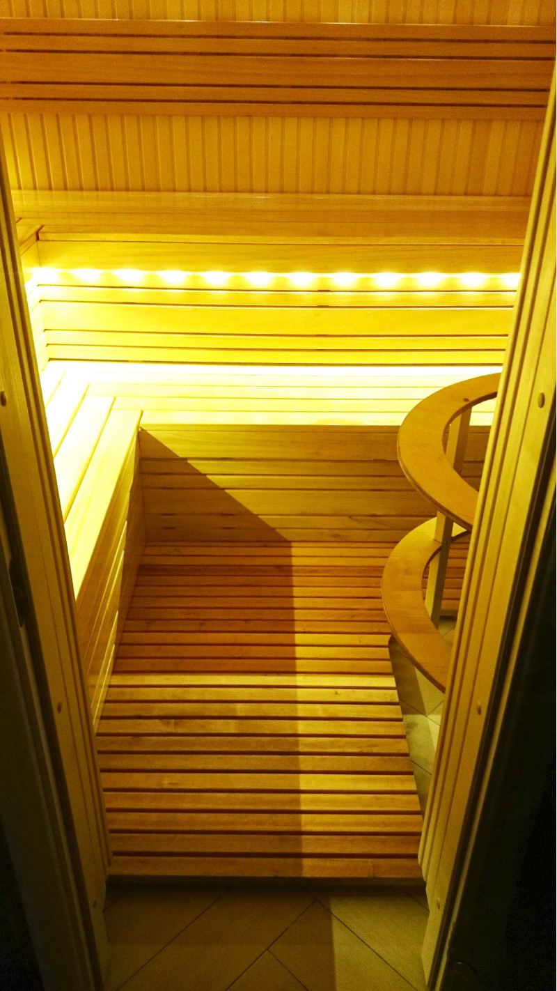 Accentul principal al saunei este iluminatul modern și luminos cu LED-uri sub bănci, o lampă sub spătarul colțului și lămpi LED separate care iluminează tavanul.