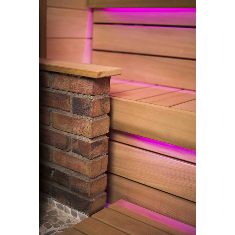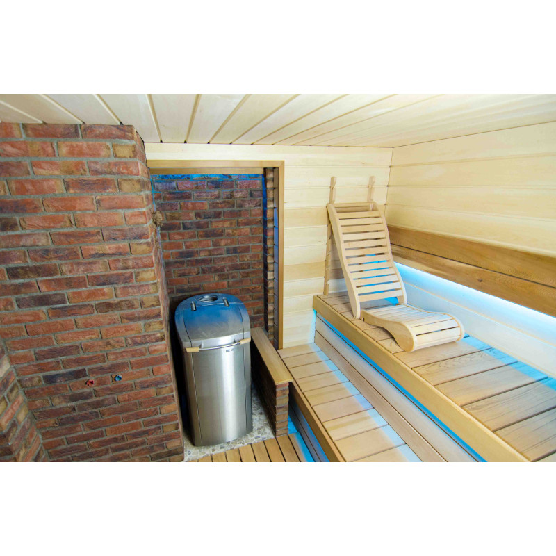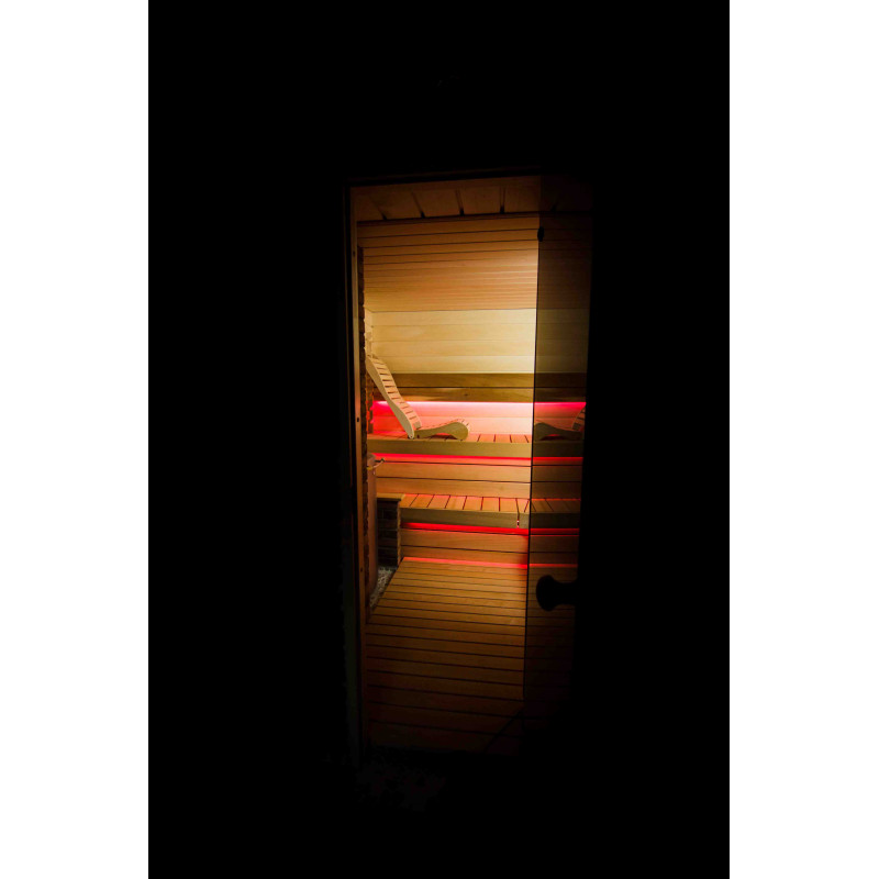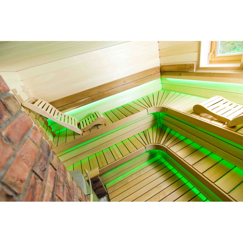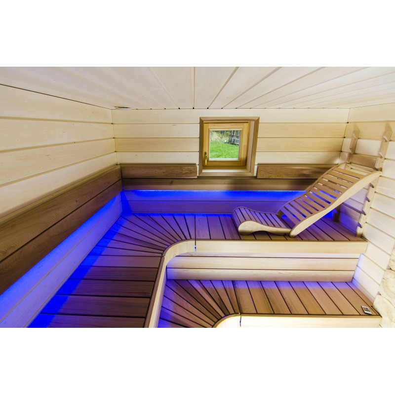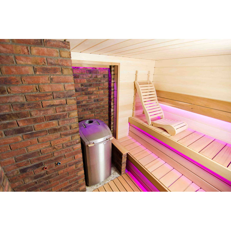 Prevazut cu iluminare color RGB, controlata de un schimbator de culoare wireless, care iti permite sa schimbi cu usurinta culoarea luminii in functie de atmosfera de sauna dorita.