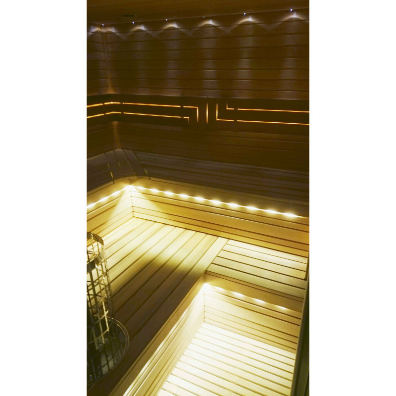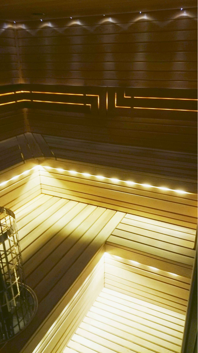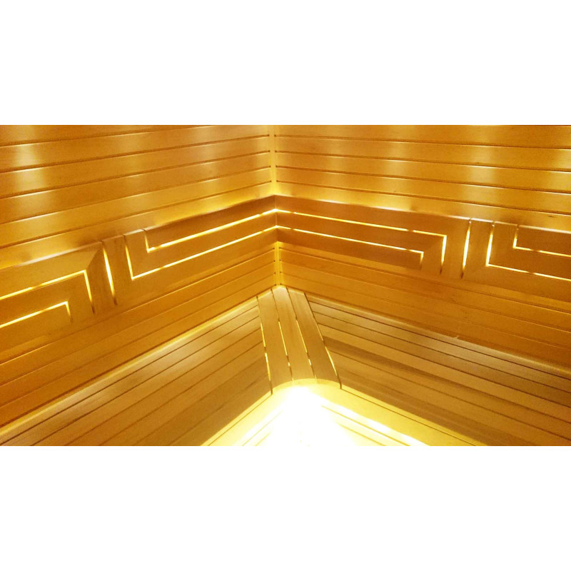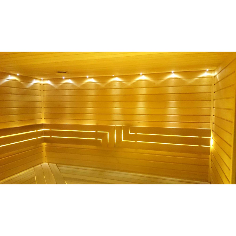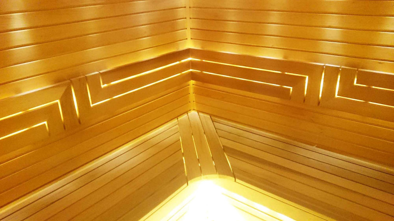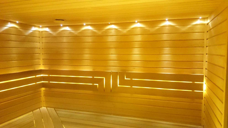 Tavanul este dotat cu iluminare LED exclusivă „Soare”, sub bănci și spătare sunt instalate benzi de iluminat cu LED, de culoare alb cald. Datorită luminii, se asigură o parte din efectul relaxant al saunei.